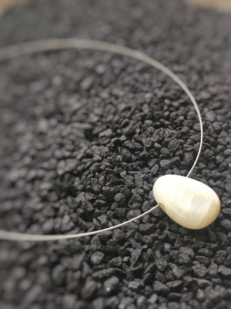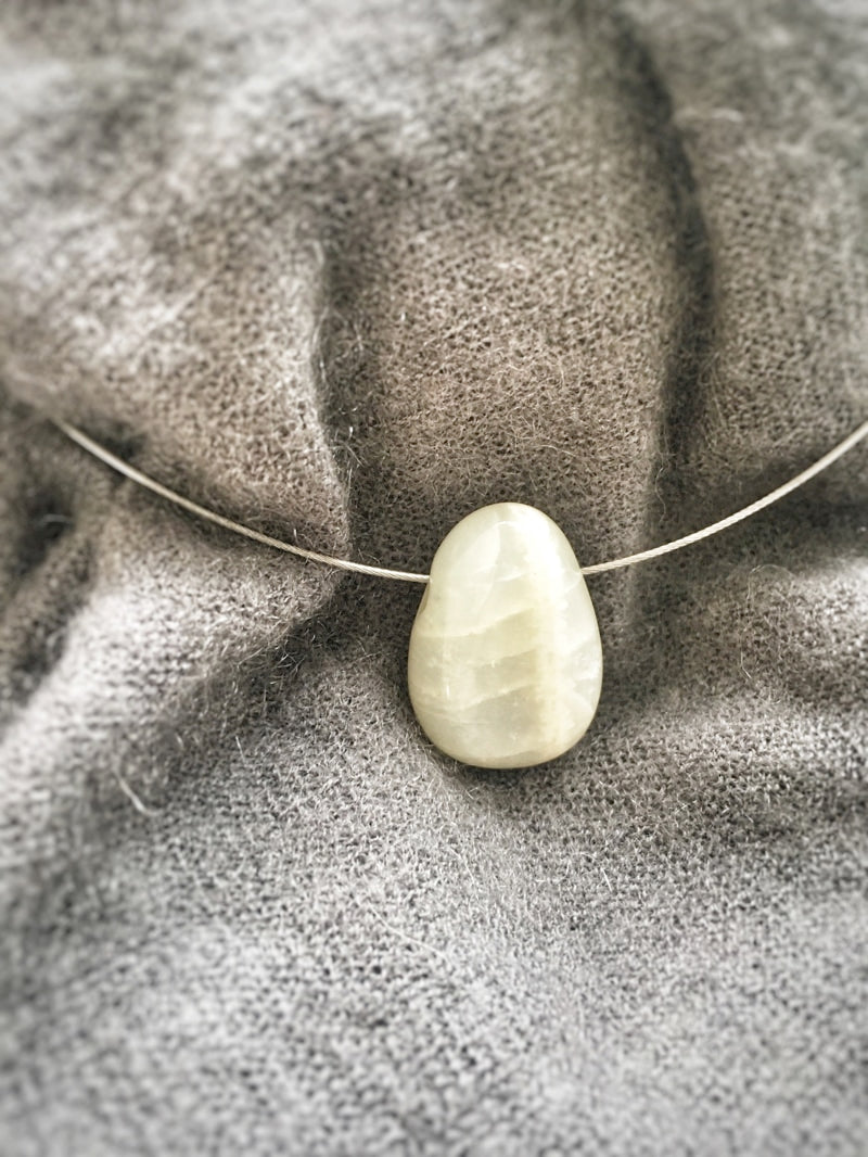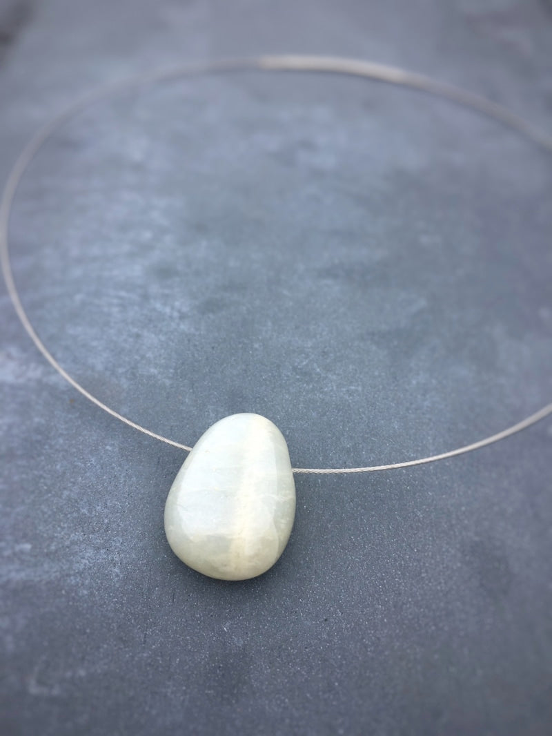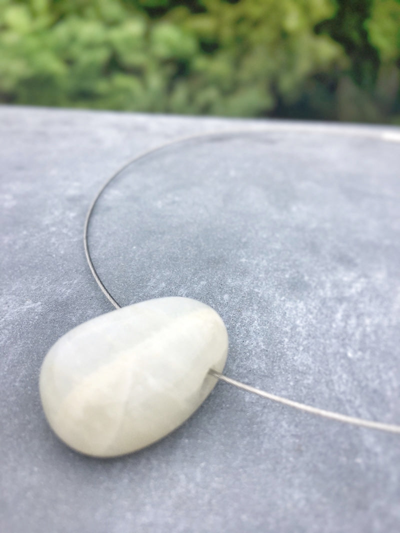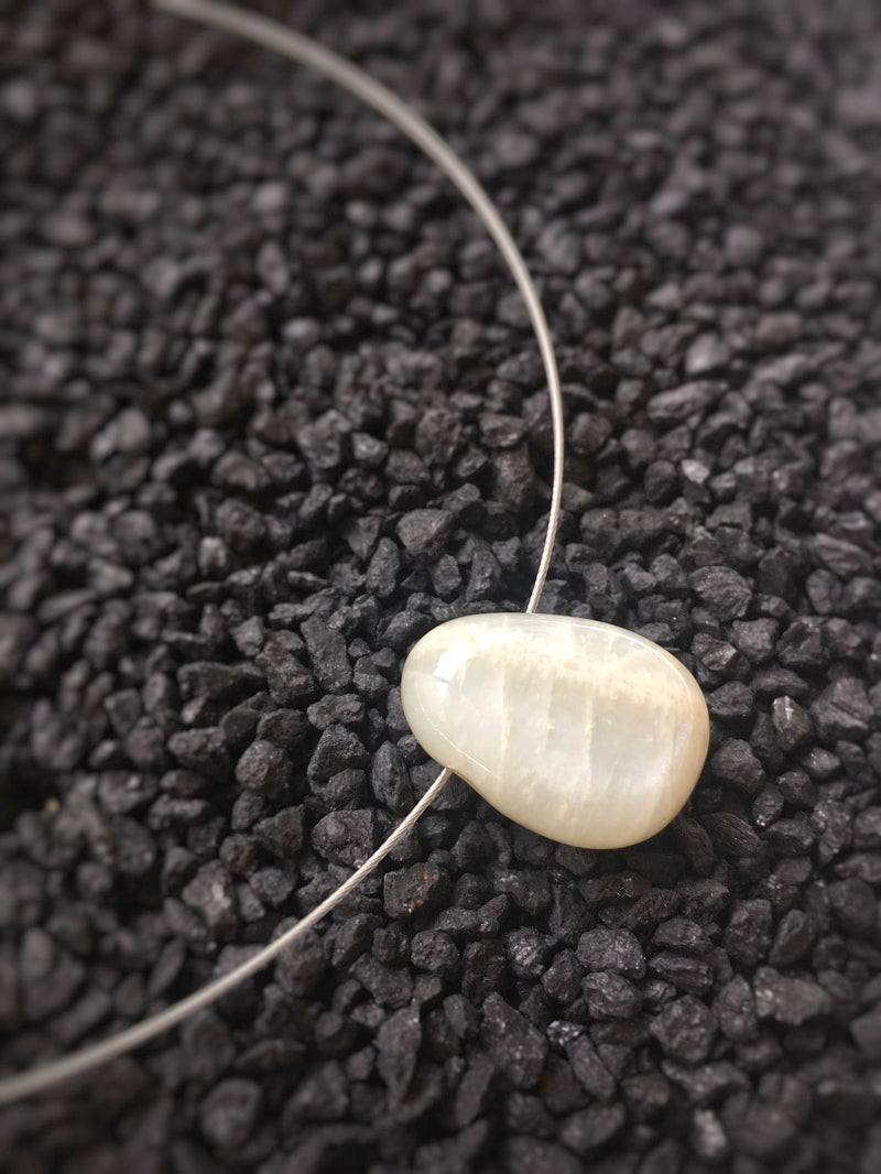 Ein schön gemaserter Mondstein auf silberfarbenem Halsreif mit elegantem Steckverschluss.