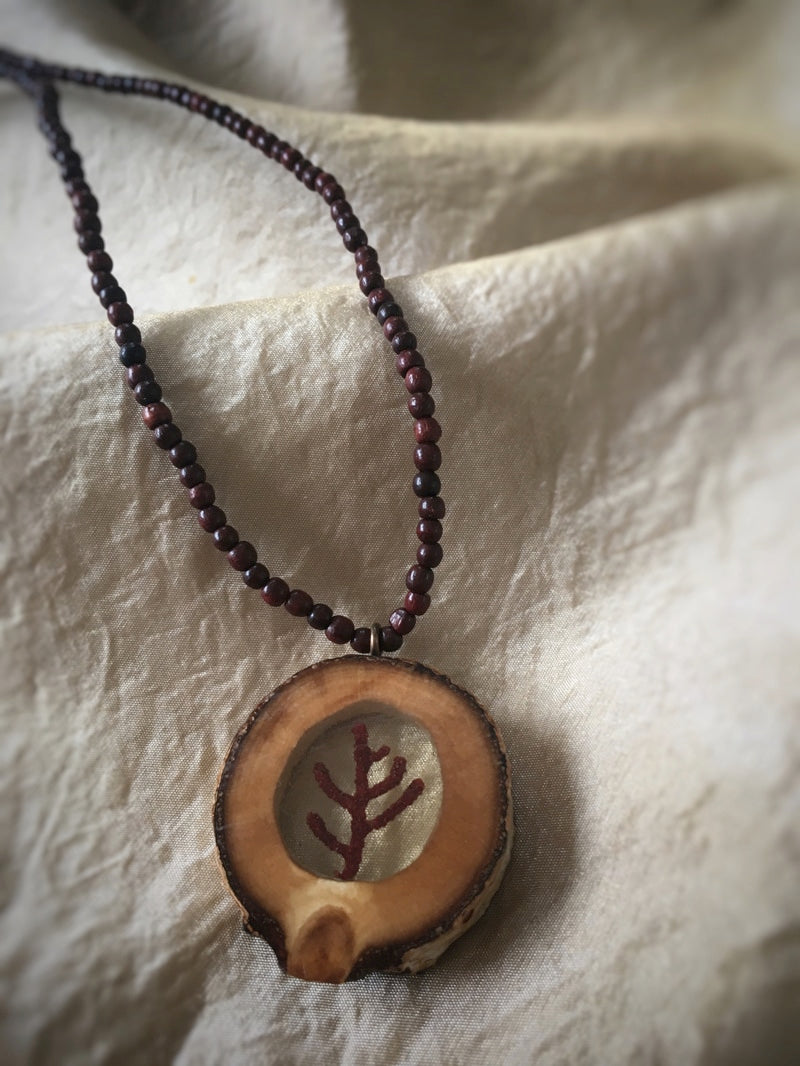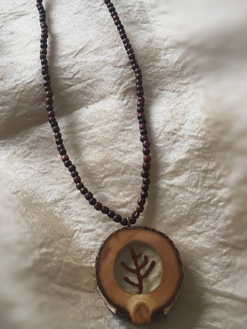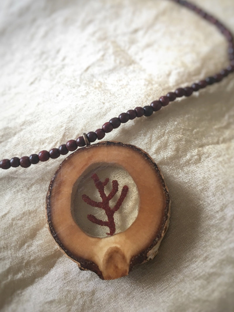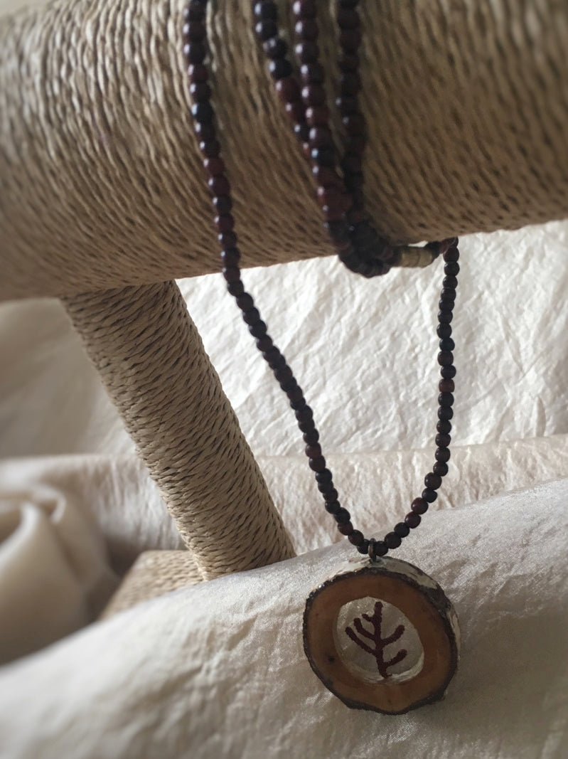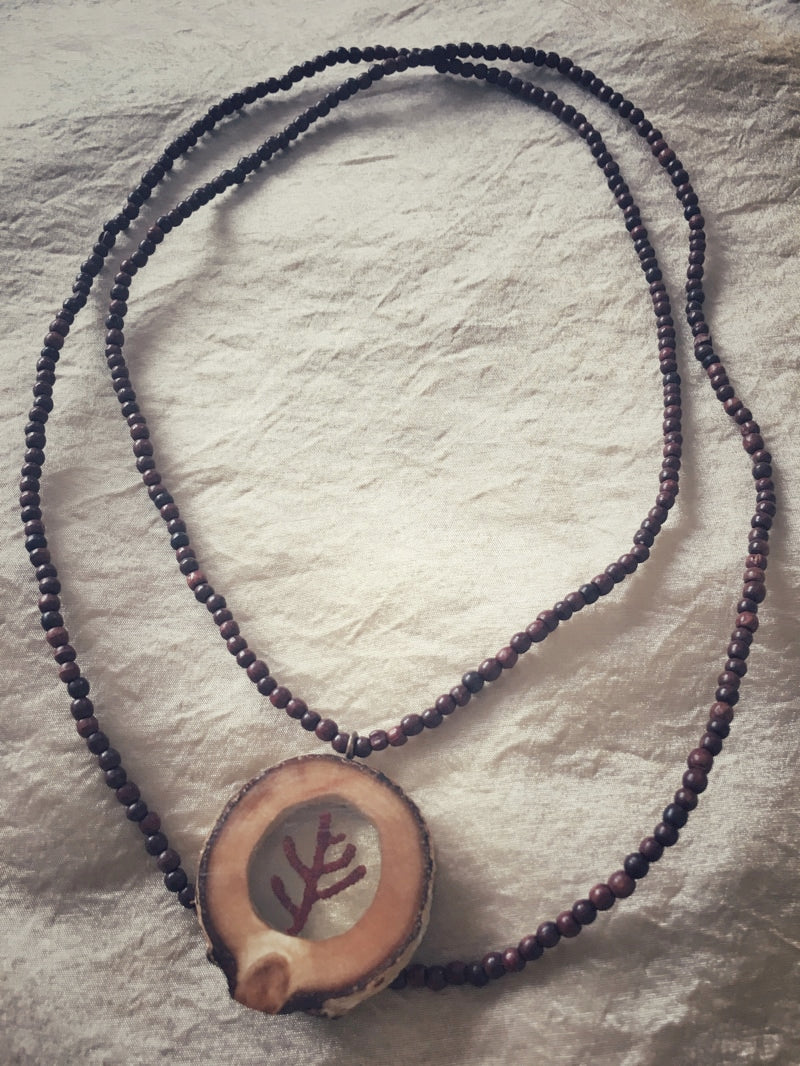 Eine hübsche kleine Koralle mit Resin gegossen in eine Scheibe aus Birkenholz. Die Kette aus rotbraunen kleinen Sandelholzperlen ist im ISKON-Tempel von Vrindavan geweiht.