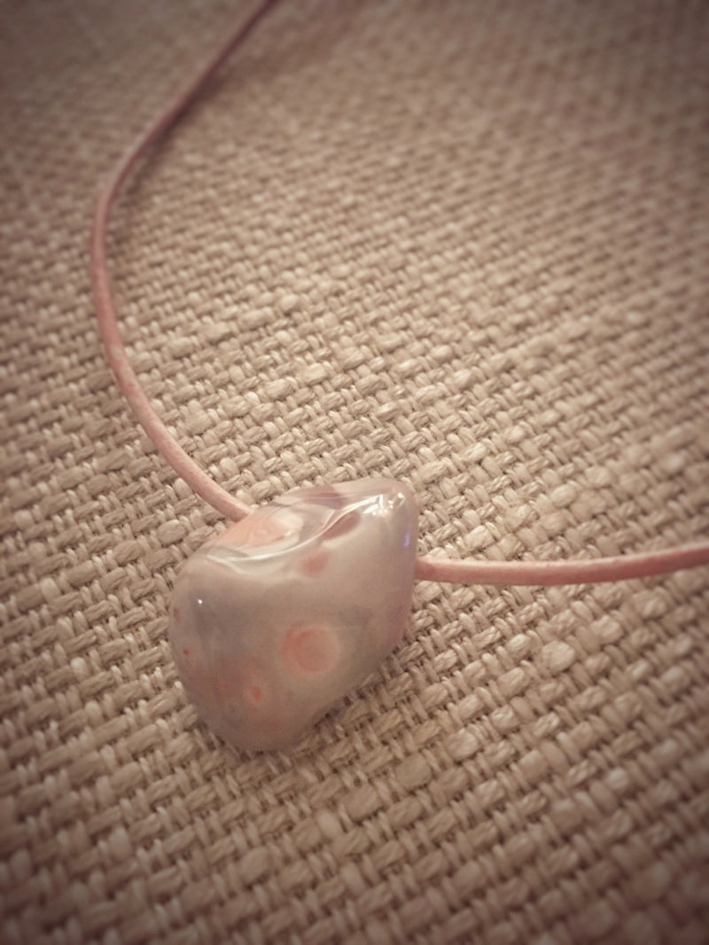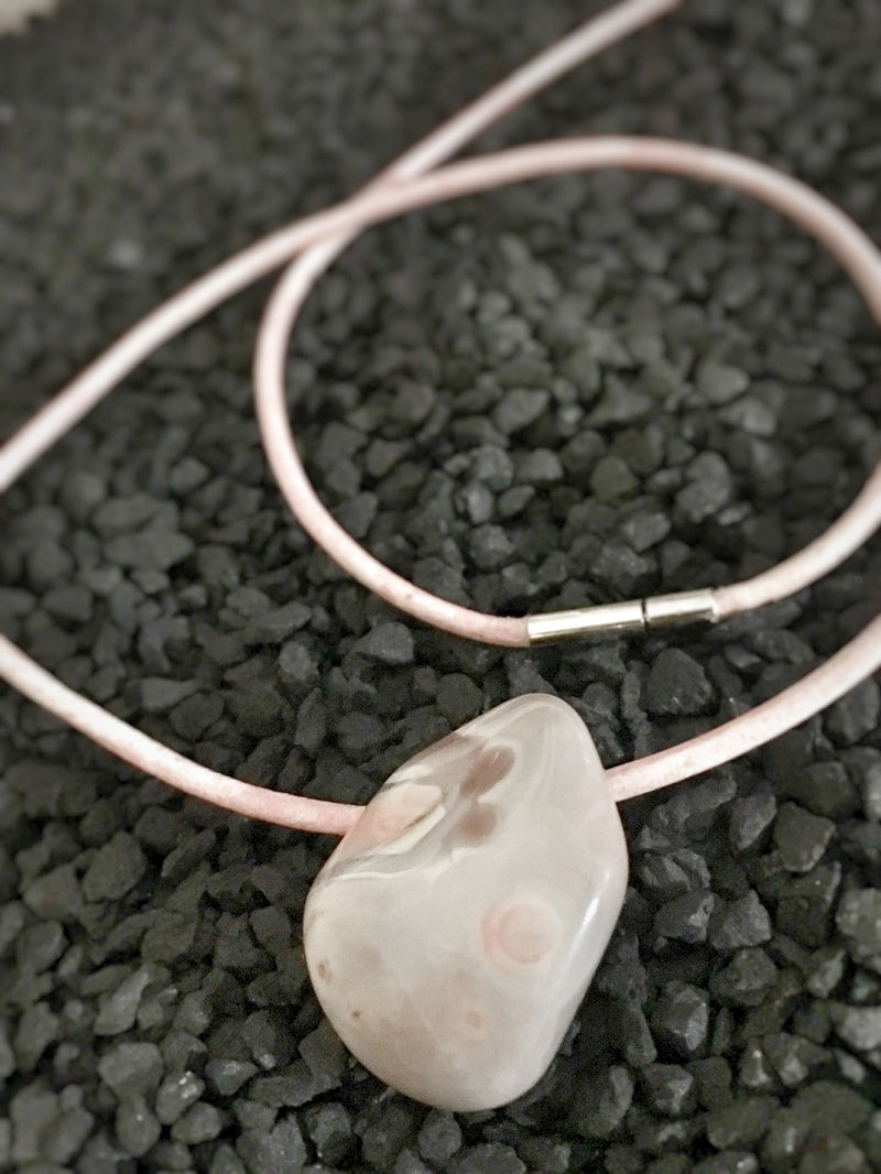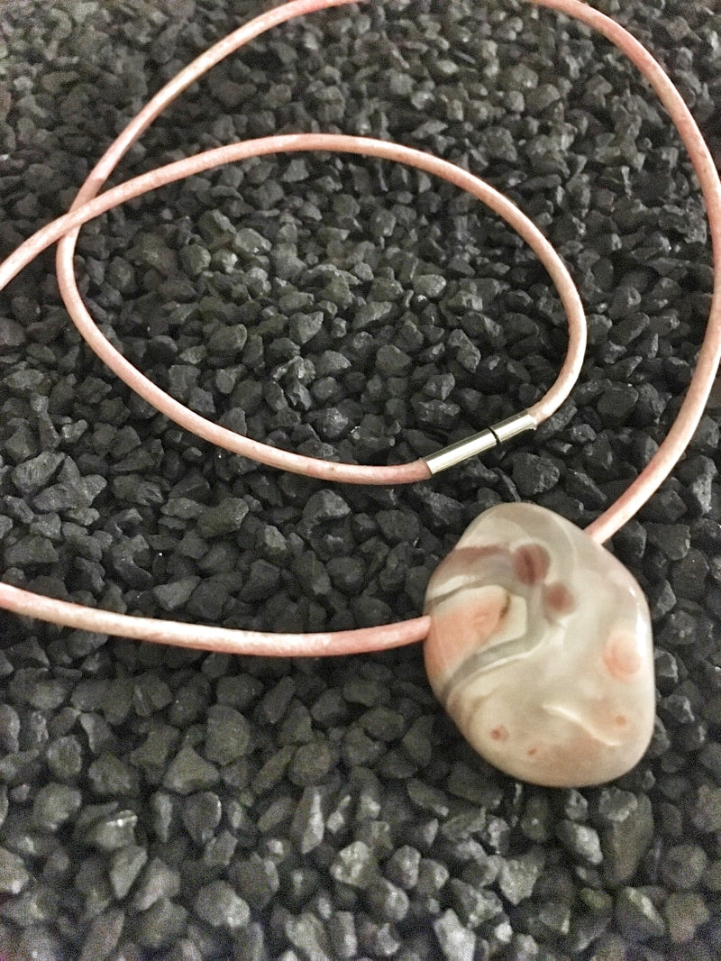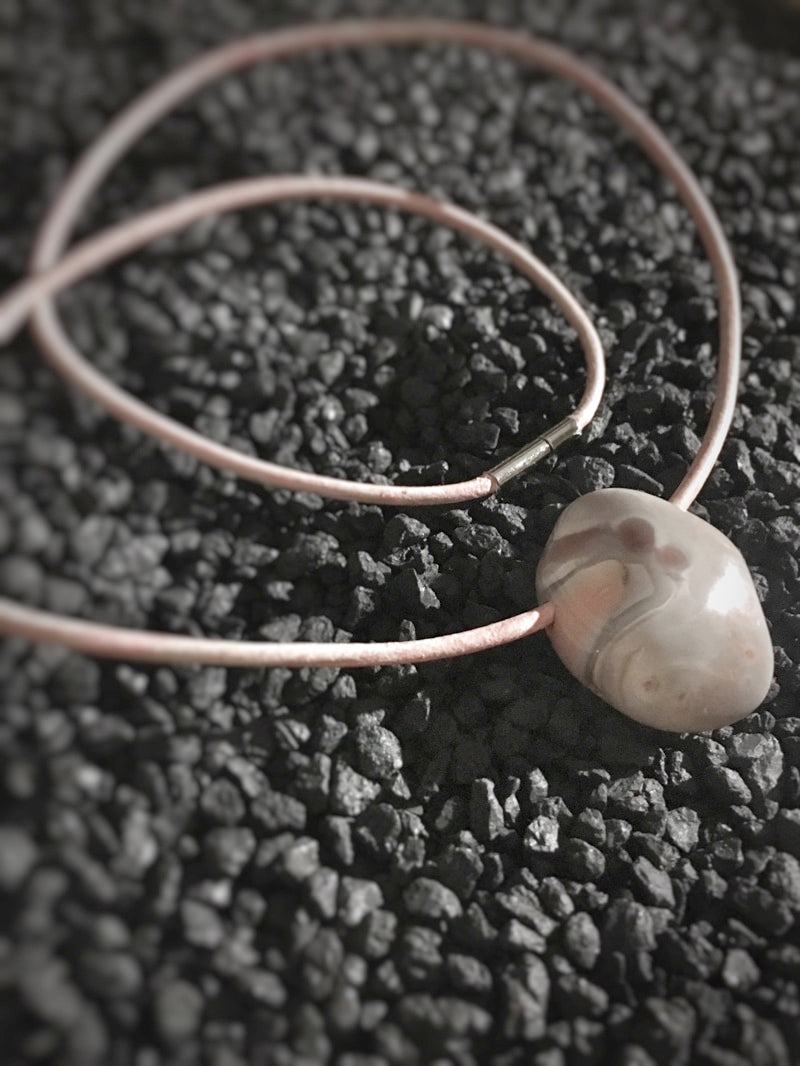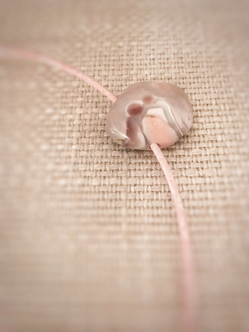 Der Achat aus Botswana hat eine sehr schöne Entzündungssignatur und ist auf ein farblich passendes gewischtes rosa Lederband mit silberfarbenem Steckverschluss gezogen.