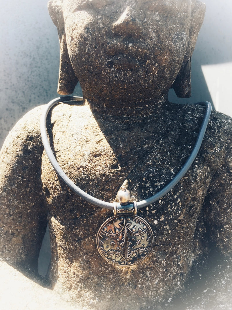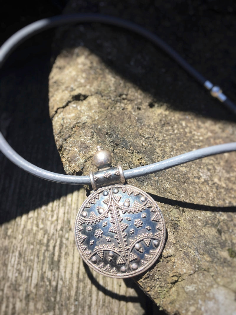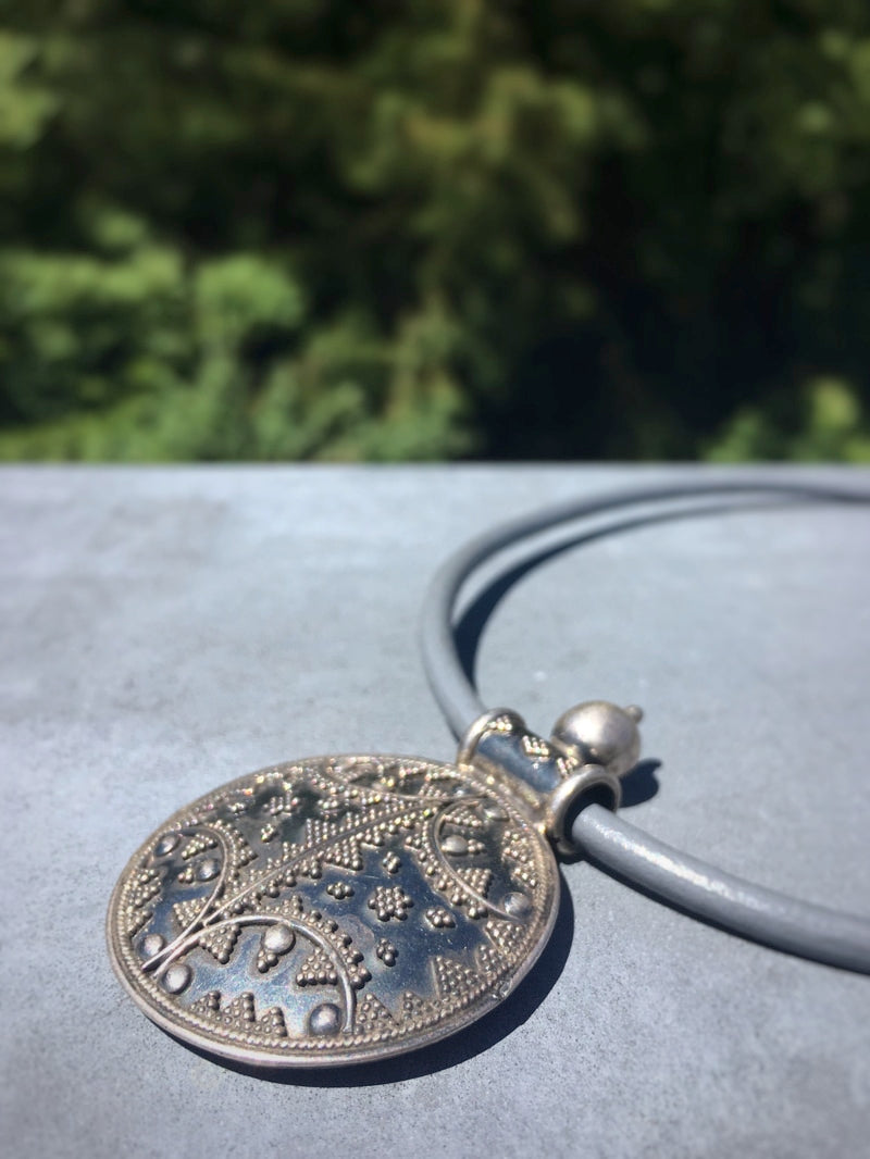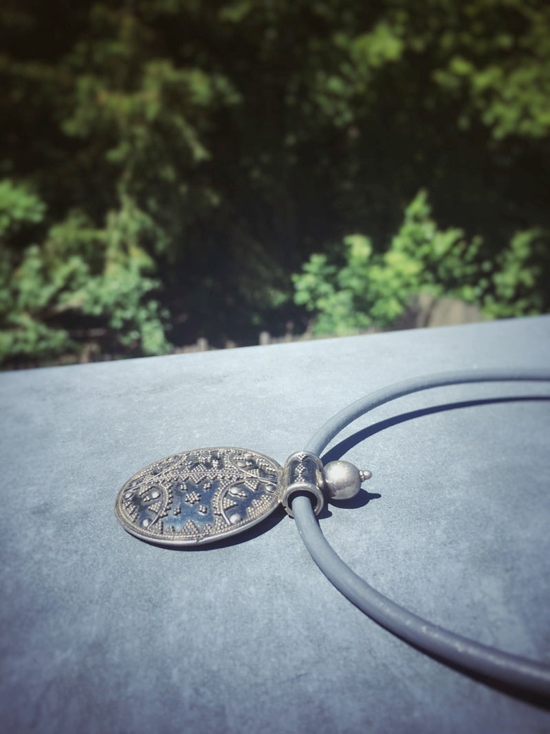 Wunderschönes handgearbeitetes Echt-Silber-Amulett aus Indien auf grauem Lederband mit Magnetverschluss