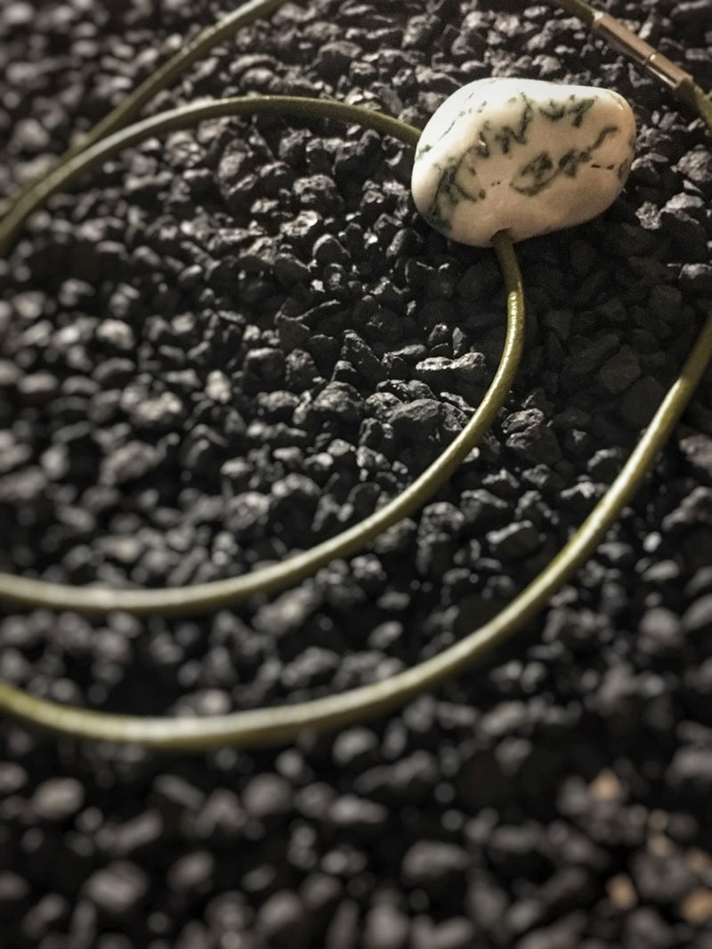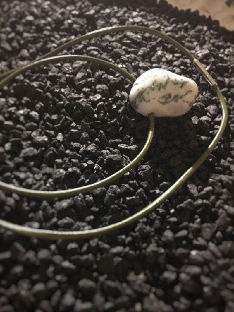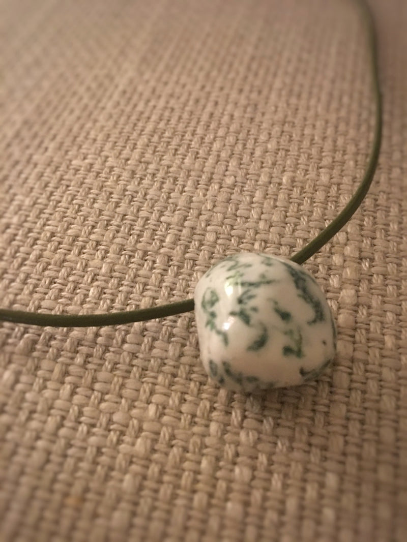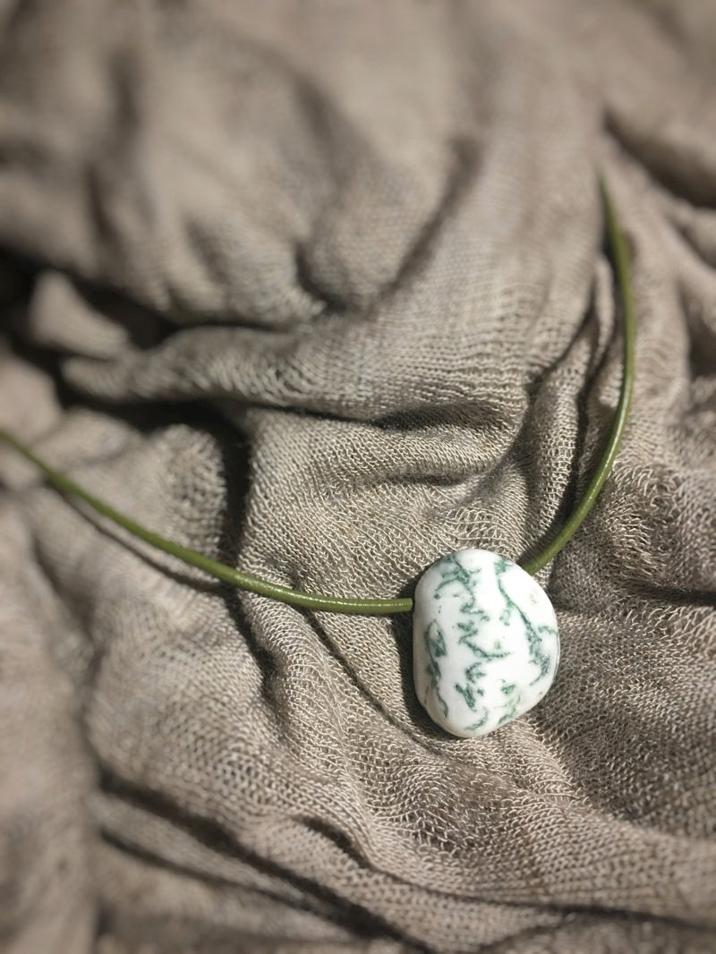 Baumachate gelten in Indien als Talisman. Dieses schöne Stück ist auf ein farblich passendes feines dunkelgrünes Lederband mit silberfarbenem Steckverschluss gezogen.