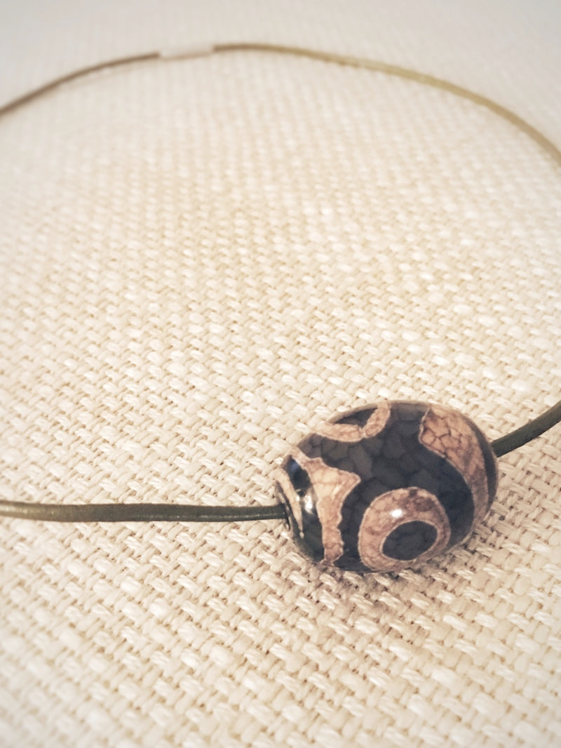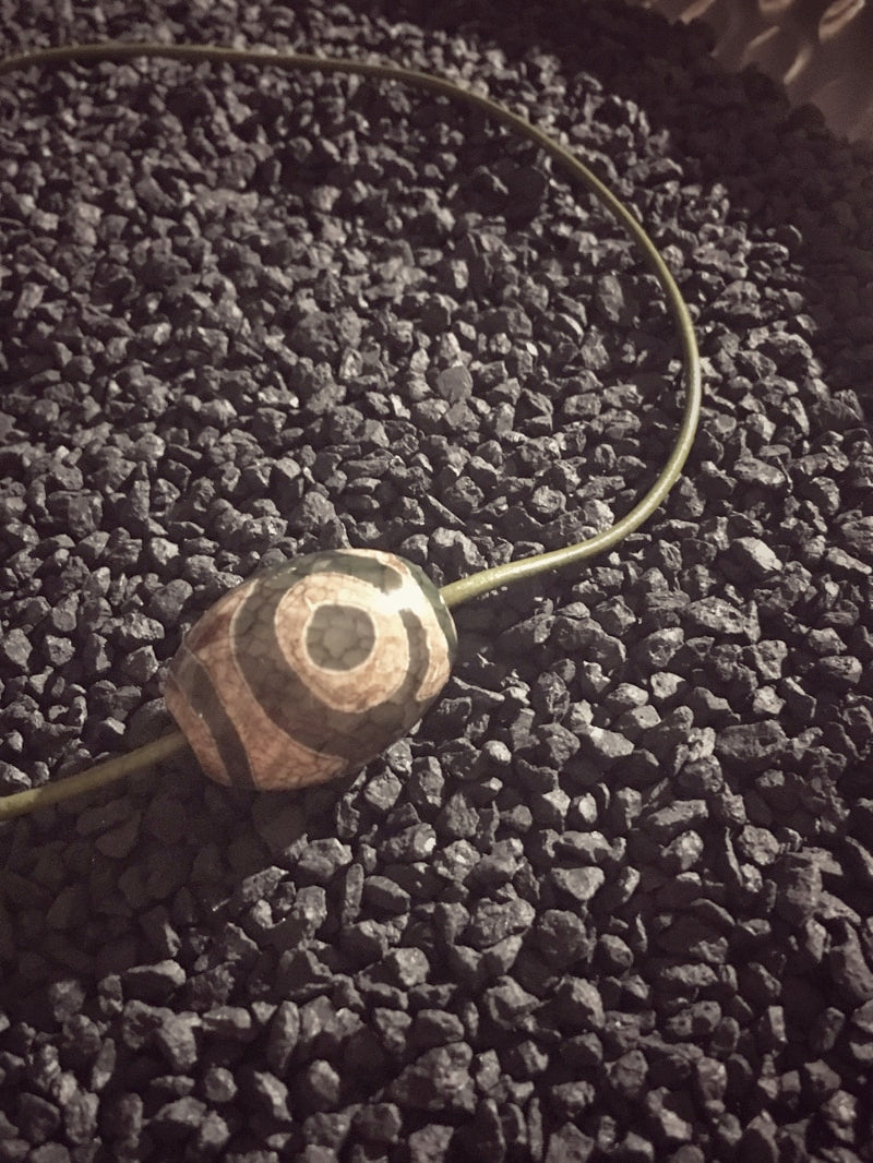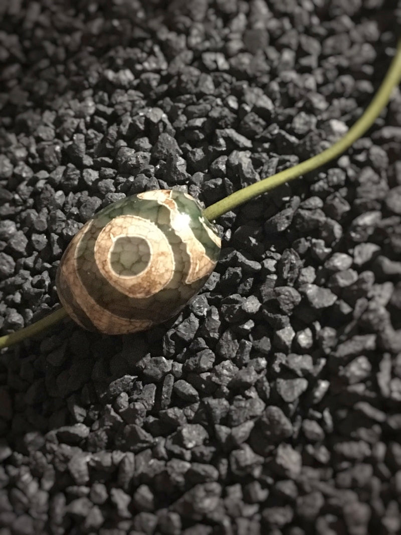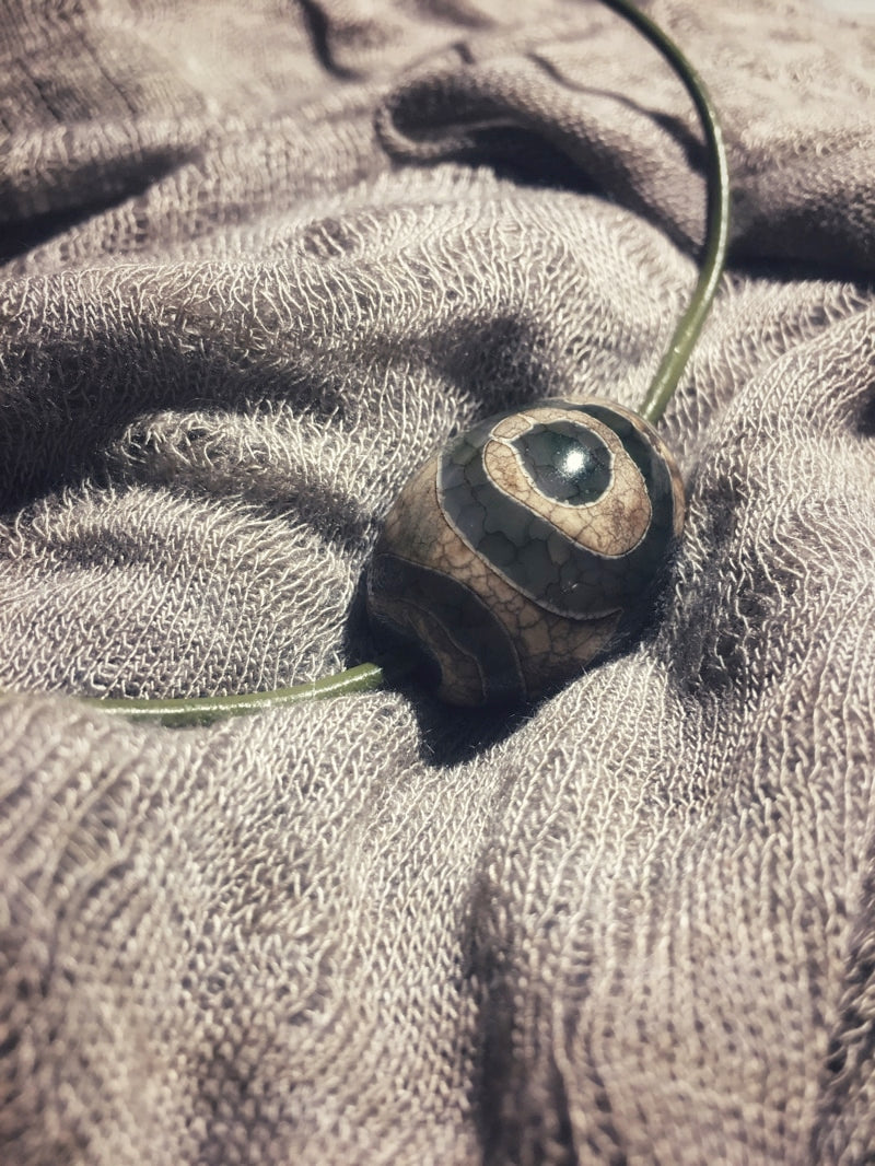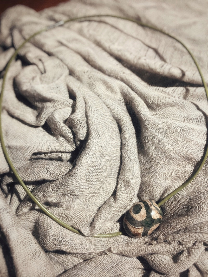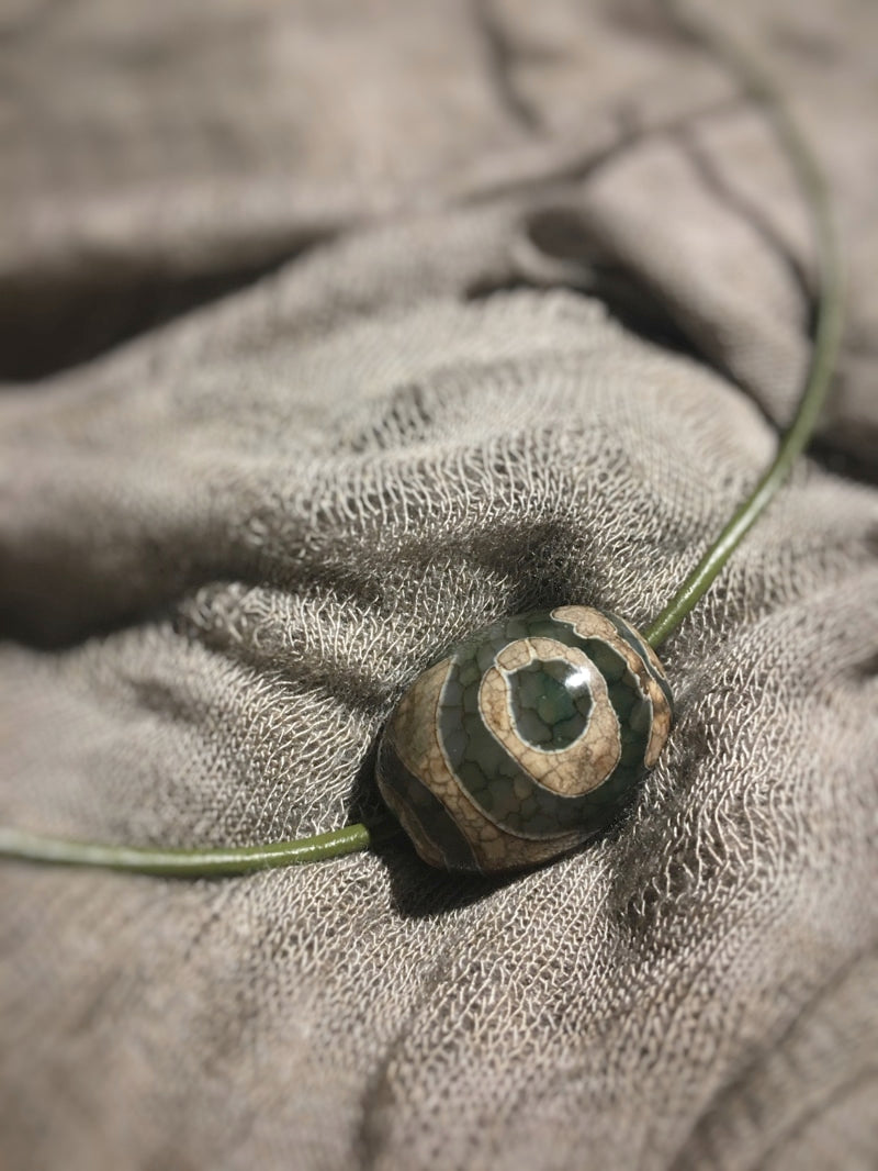 Dieser trommelförmiger Achat ist auf ein farblich passendes feines dunkelgrünes Lederband mit silberfarbenem Steckverschluss gezogen.
