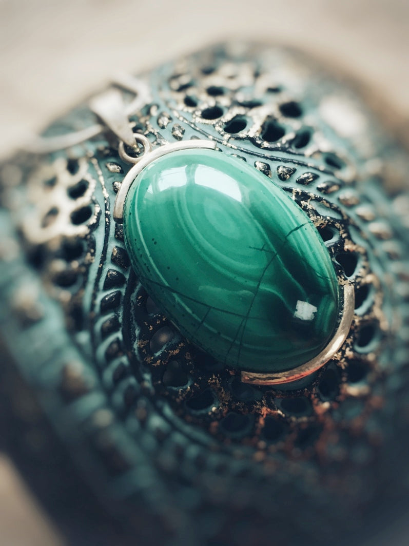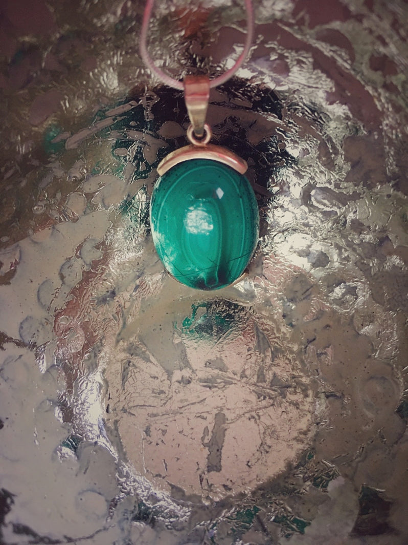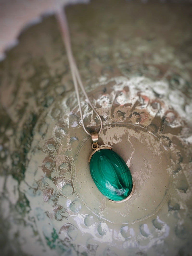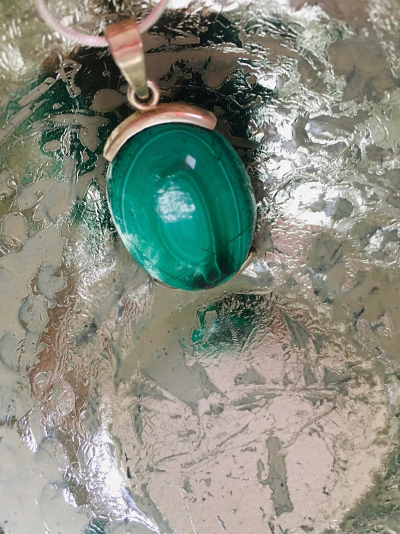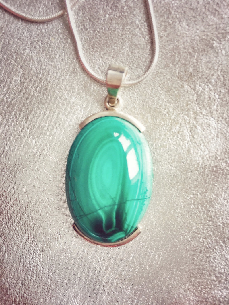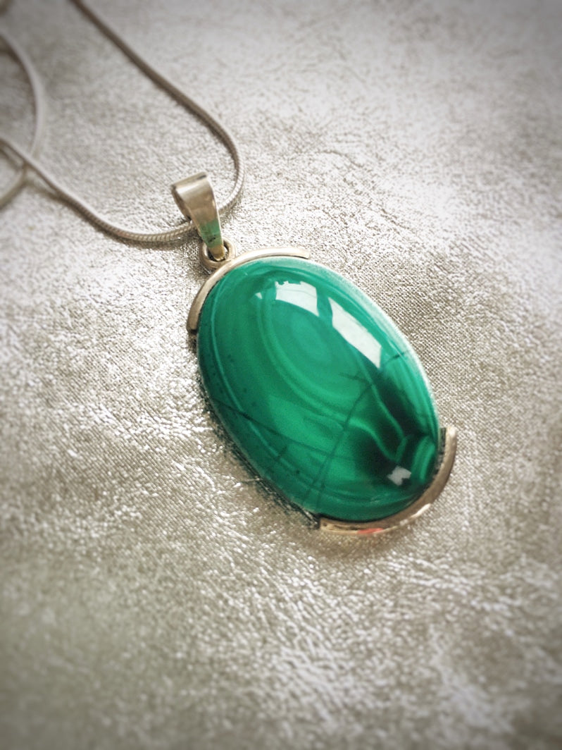 Kraftvoller ovaler Malachit in handgearbeiteter Echt-Silber-Design-Fassung an silberner Schlangenkette