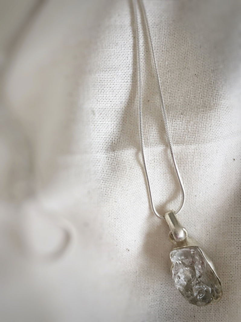 Roher Quarz in Silber hand gefasst von Raja aus Indien an einer Echtsilber-Schlangenkette
