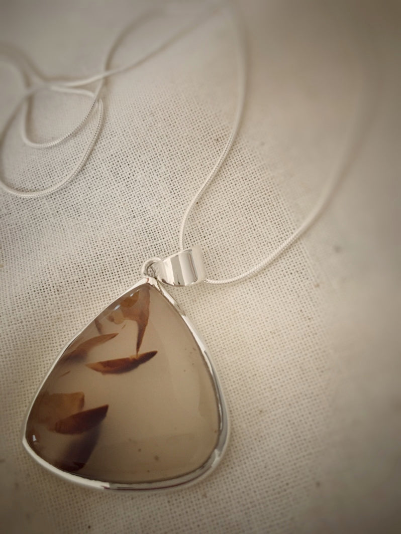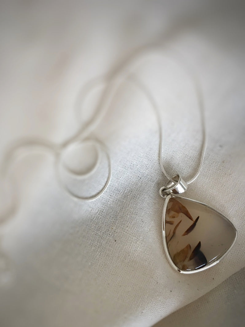 Bergachat mit wunderschönen Blatteinschlüssen an einer Echtsilber-Schlangenkette