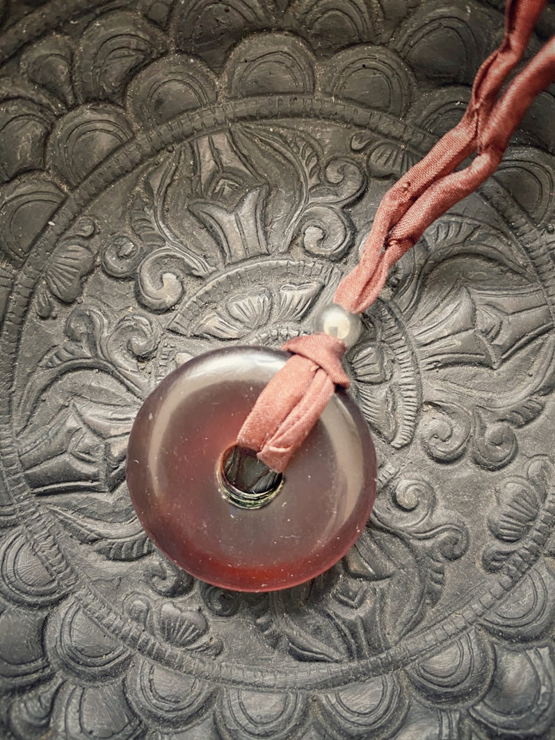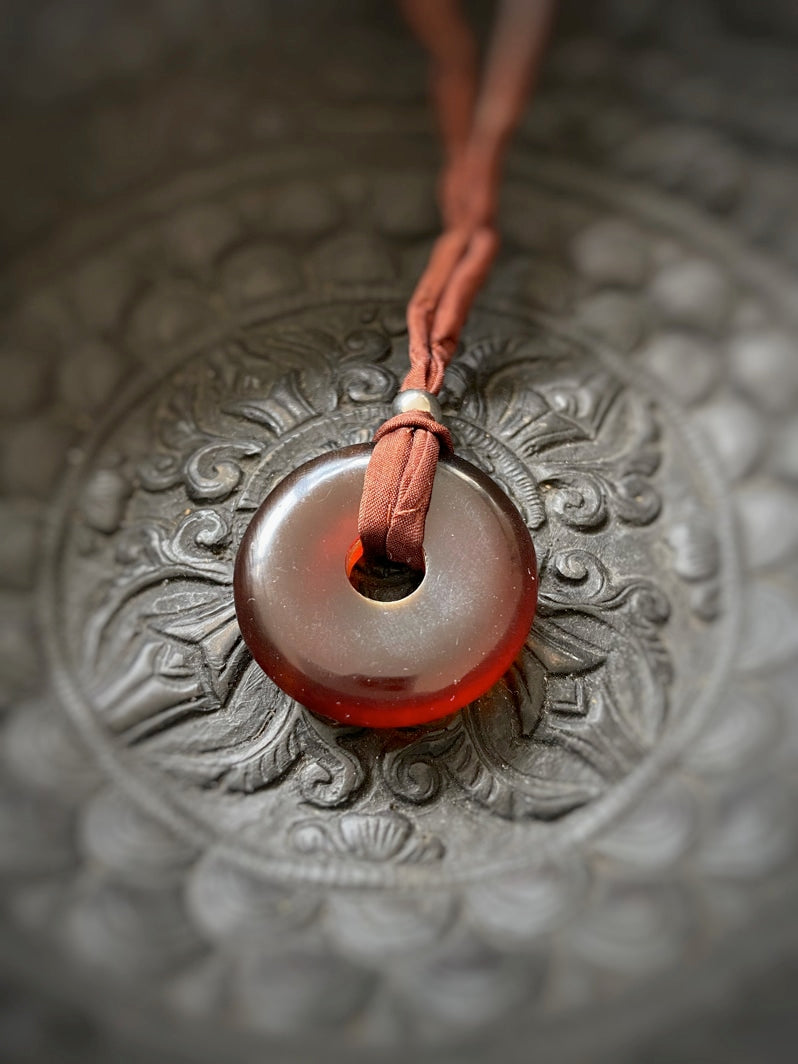 Ein indonesischer Bernstein-Donut an braunem Habotai-Seidenband mit Schiebeverschluss