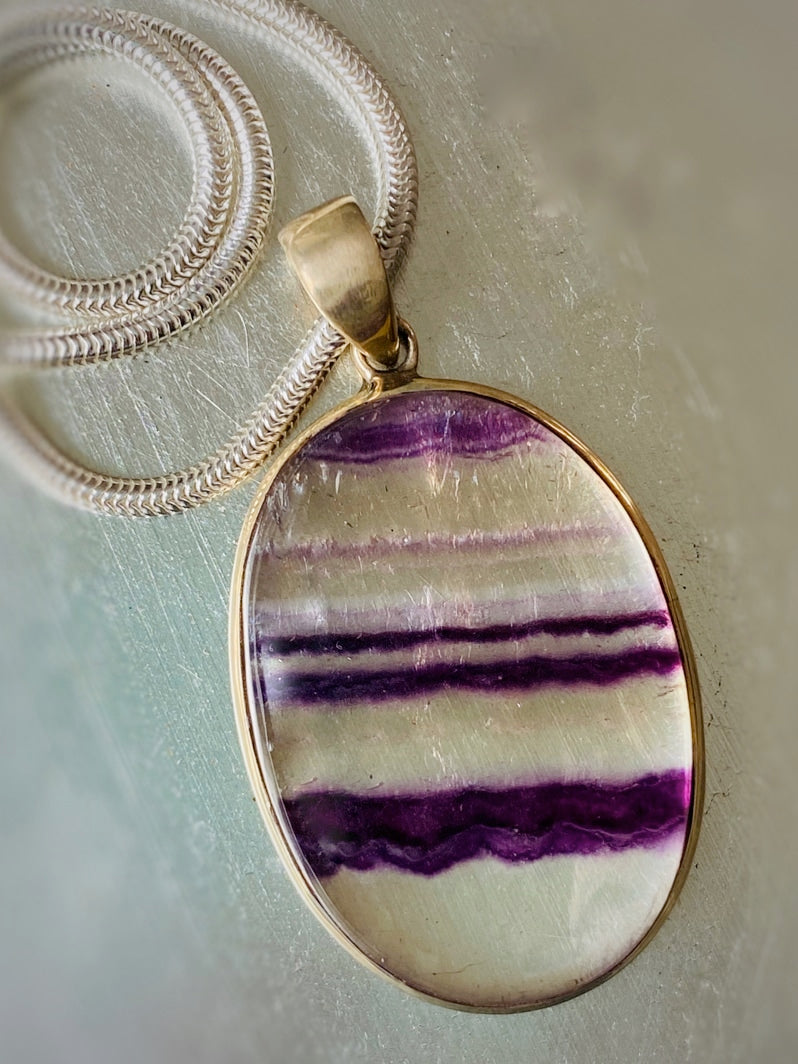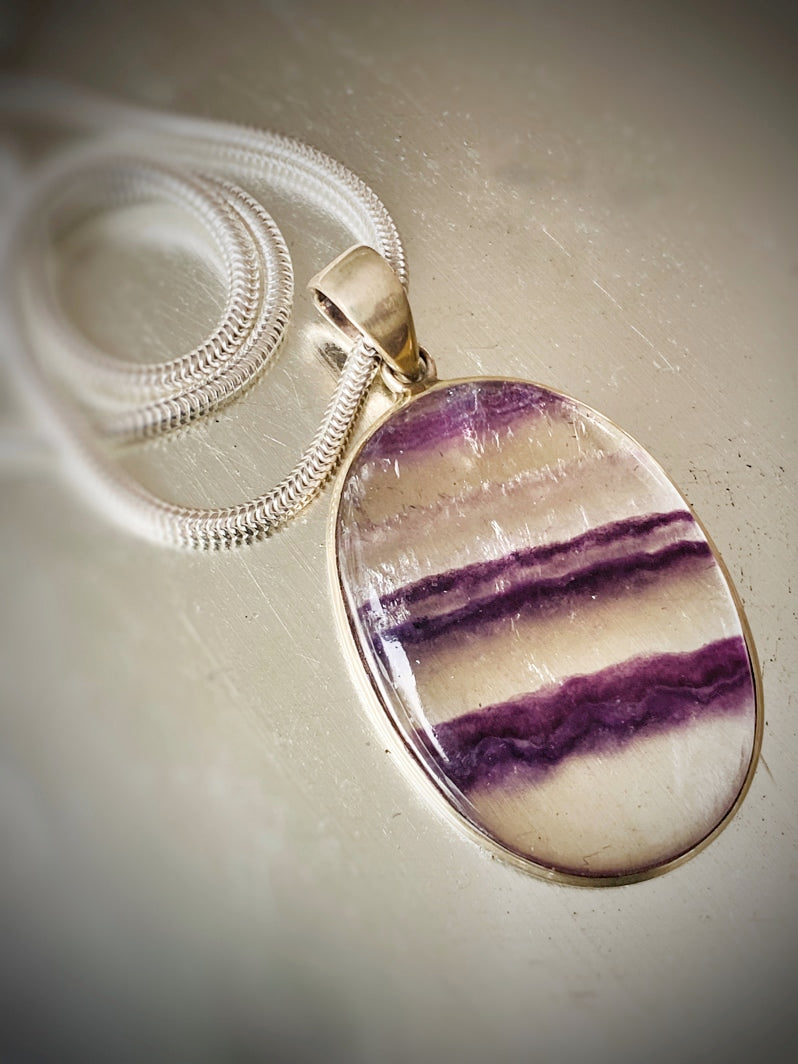 Besonderer Fluorit in Echtsilber-Fassung an einer kräftigen Echtsilber-Schlangenkette