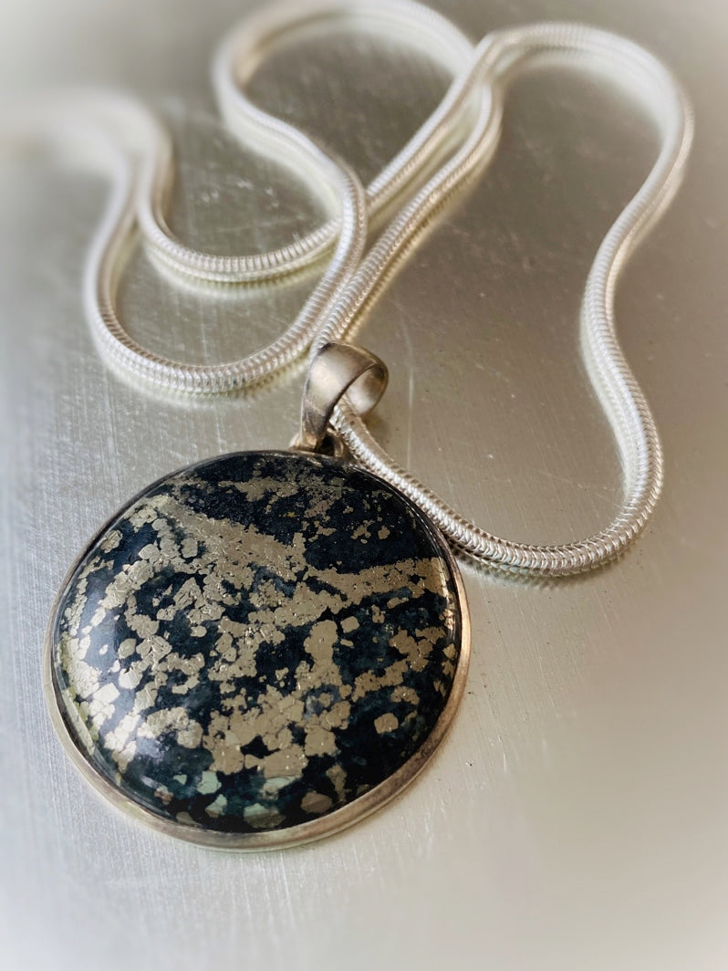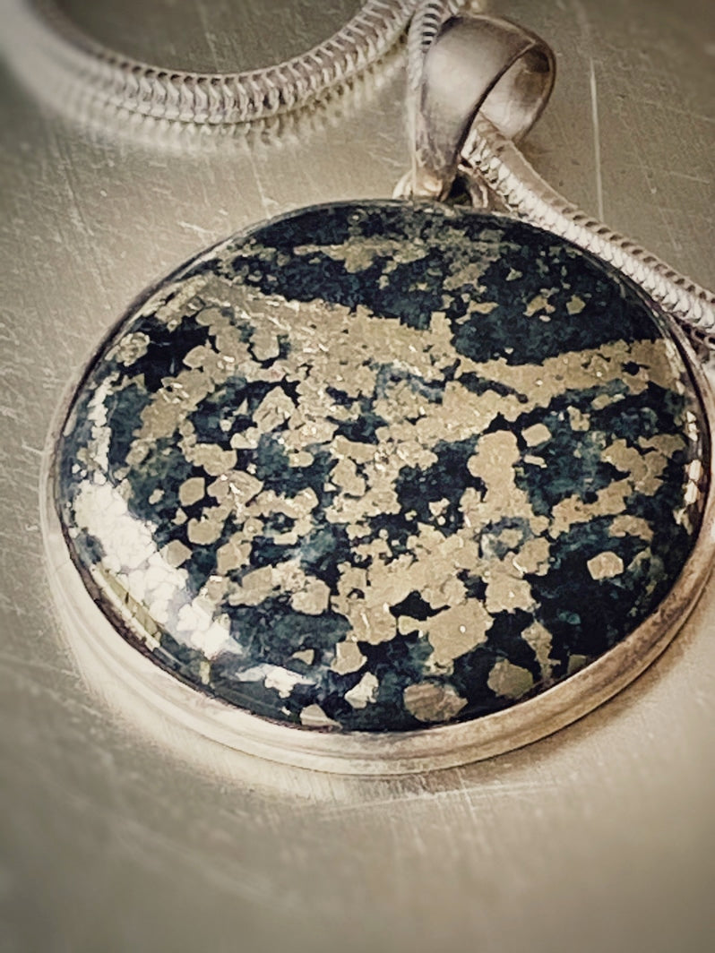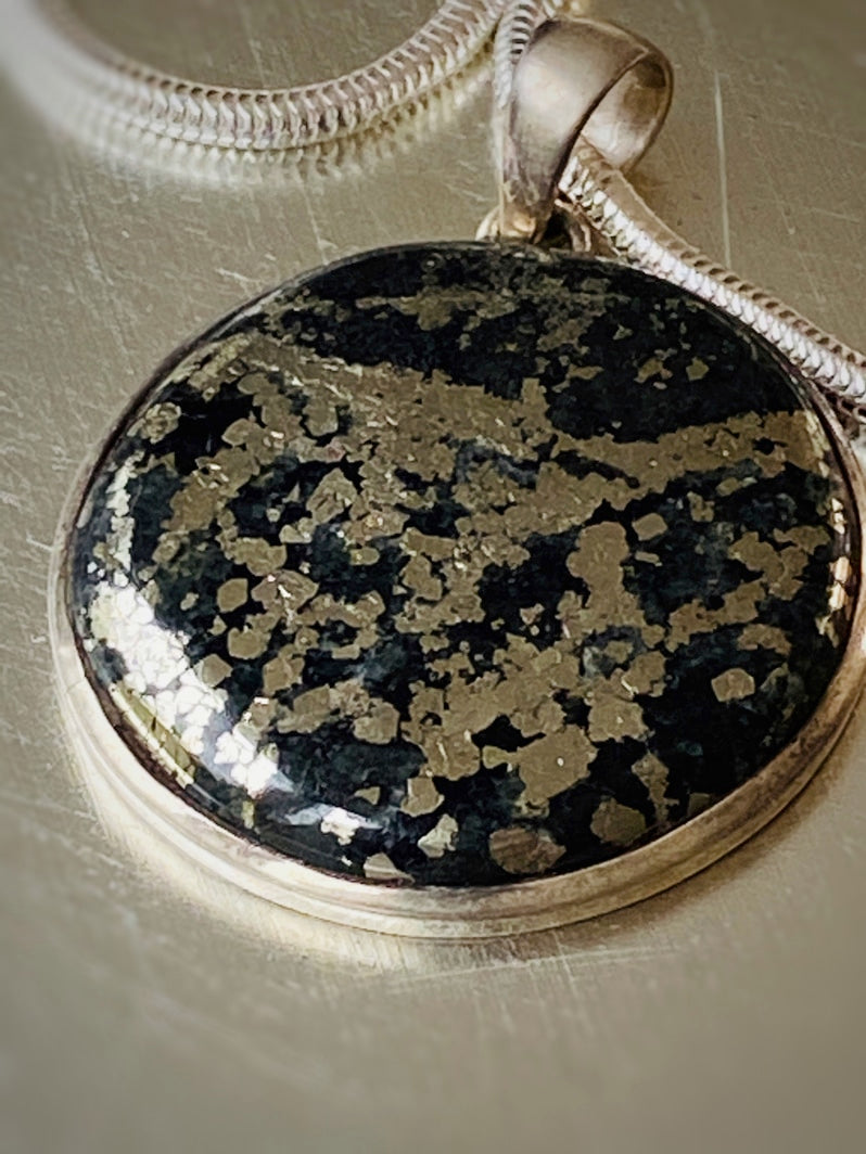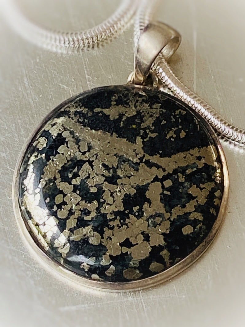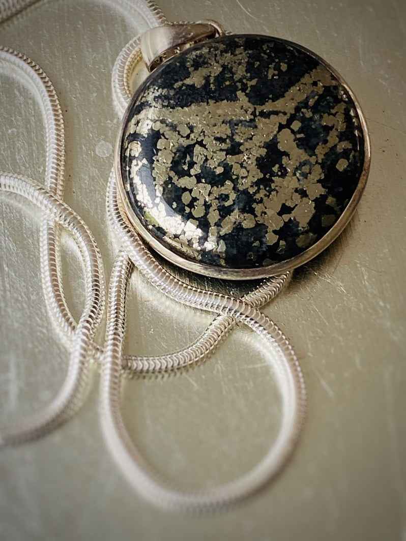 Eine feine Echtsilber-Fassung, indische Handarbeit, umfasst den schönen kreisrunden Pyrit in Schiefer mit seiner besonderen Zeichnung. Der Anhänger kommt sehr gut zur Geltung an einer kräftigen Echtsilber-Schlangenkette