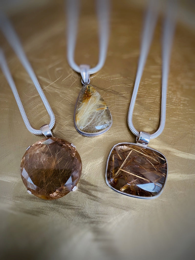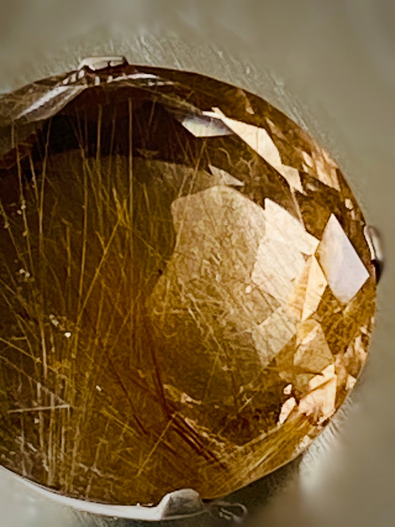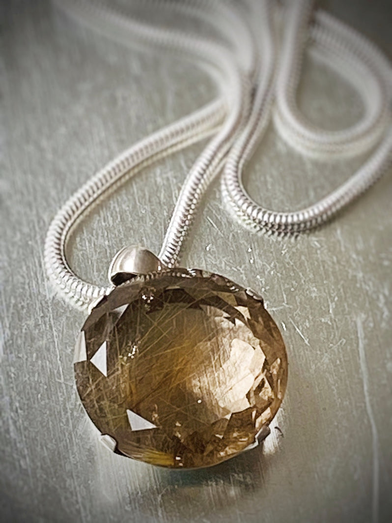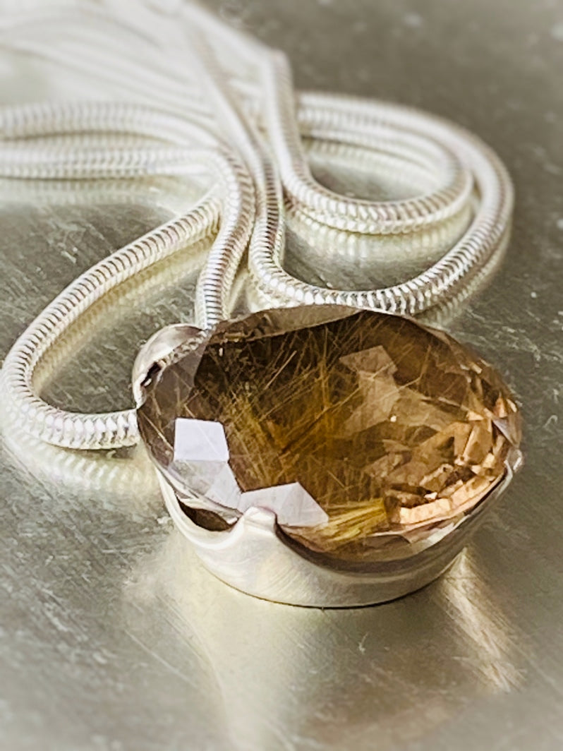 Großer Rutilquarz in ausgesprochen schönem Rundschliff in besonders schöner Silberfassung - indische Handarbeit - an kräftiger Echt-Silber Schlangenkette.