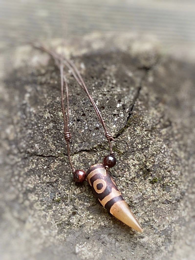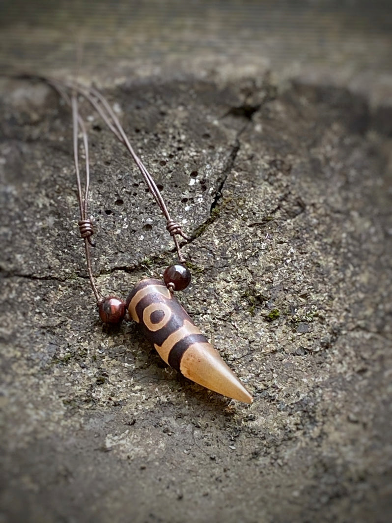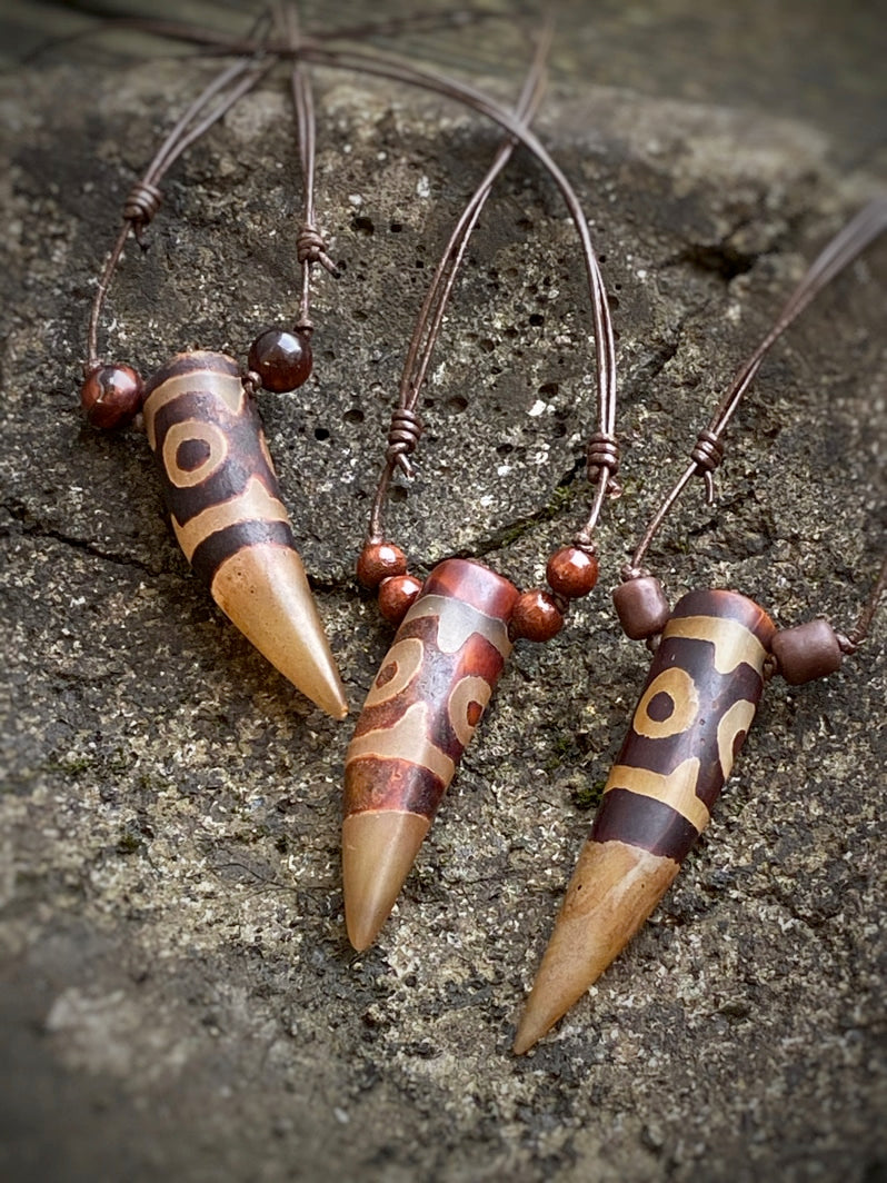 Braunes Lederband mit tibetischem Achat-Zahn und Tigerauge-Perlen, mit Schiebeknoten in der Länge regulierbar