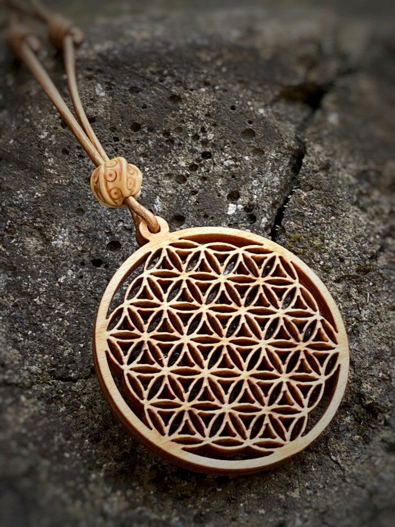 Bronzefarbenes Lederband mit handgearbeitetem Holzanhänger "Lebensblume" und tibetischer geschnitzter Knochenperle, mit Schiebeknoten in der Länge regulierbar