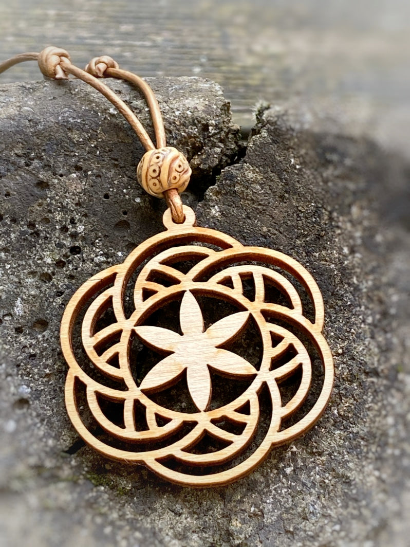 Bronzefarbenes Lederband mit handgearbeitetem Holzanhänger "Blume" und tibetischer geschnitzter Knochenperle, mit Schiebeknoten in der Länge regulierbar