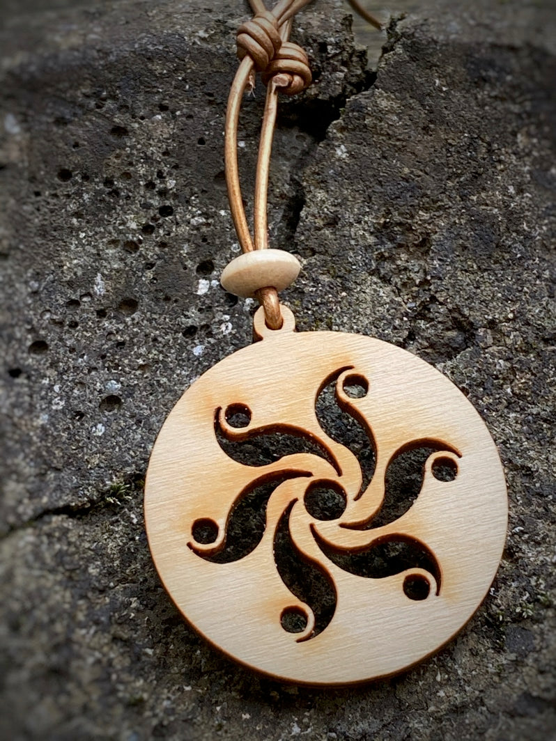 Bronzefarbenes Lederband mit handgearbeitetem Holzanhänger "Wirbel" und Holzlinse, mit Schiebeknoten in der Länge regulierbar