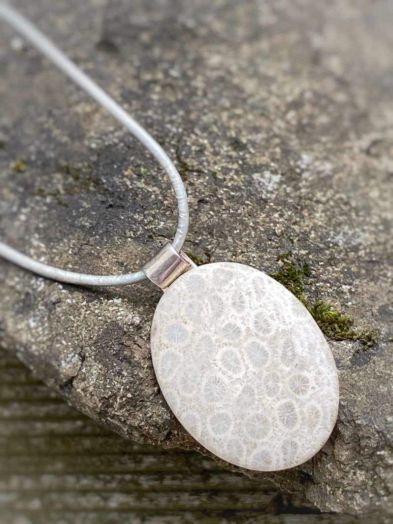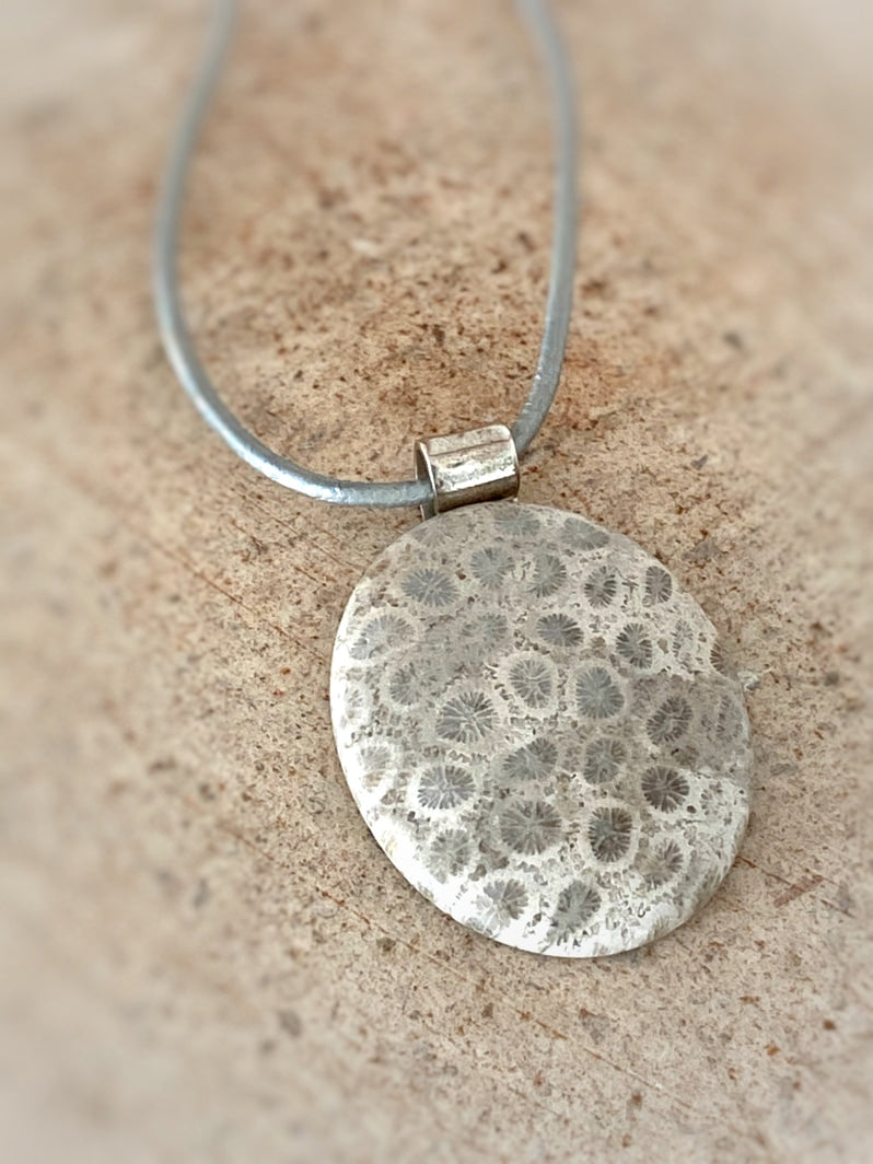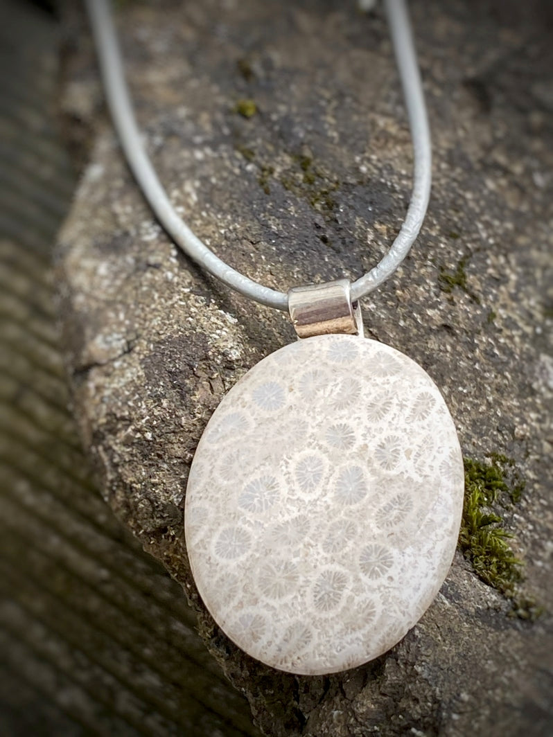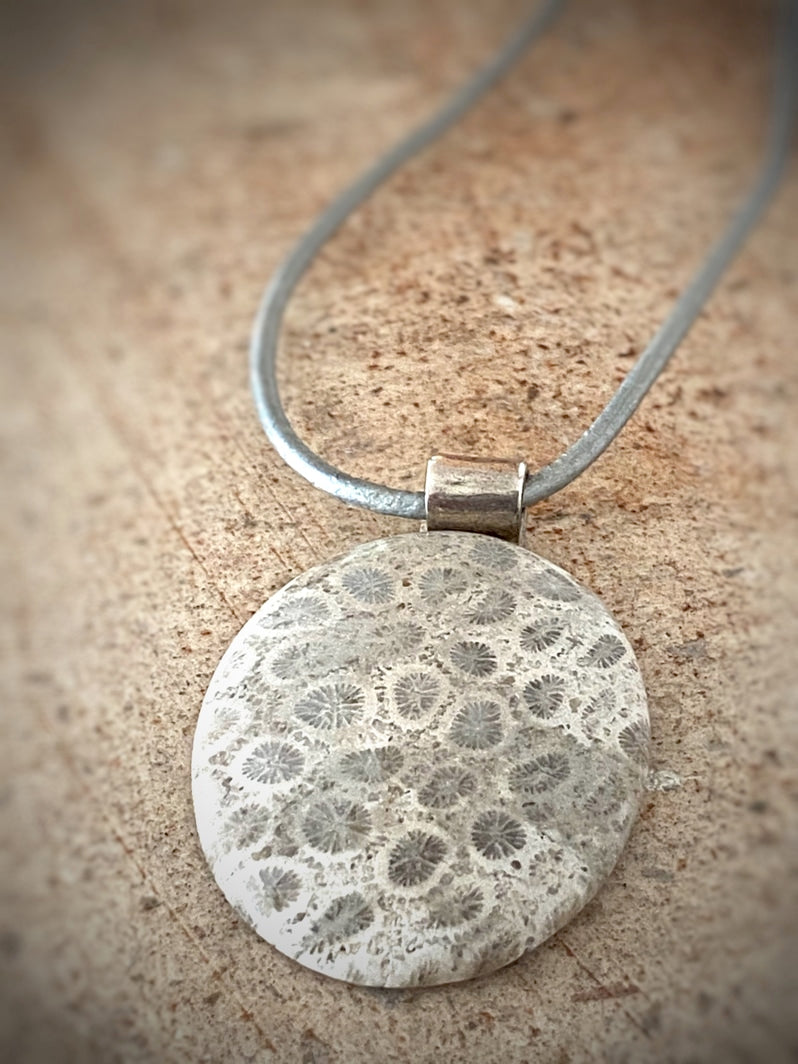 Silberfarbenes Lederband mit Fossiler Koralle an Echt-Silber-Anhängerschlaufe aus Indien, mit Schiebeknoten in der Länge regulierbar