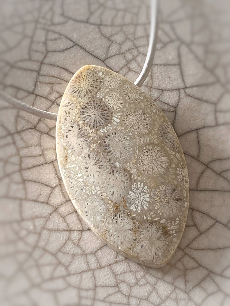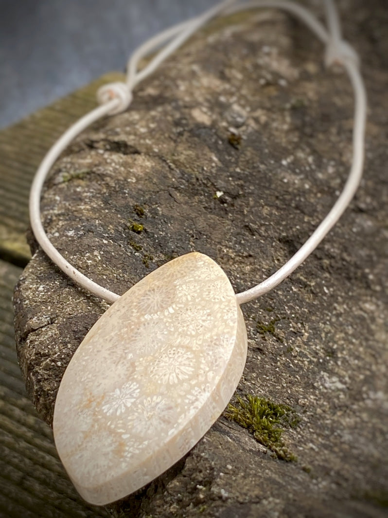 Beigefarbenes Metallic-Lederband mit Fossiler Koralle, mit Schiebeknoten in der Länge regulierbar