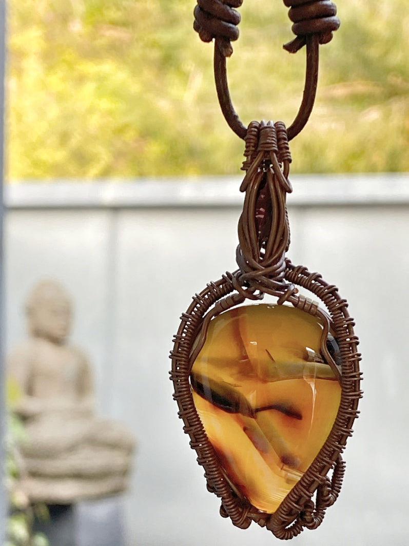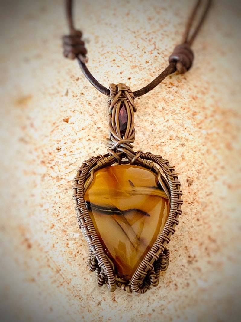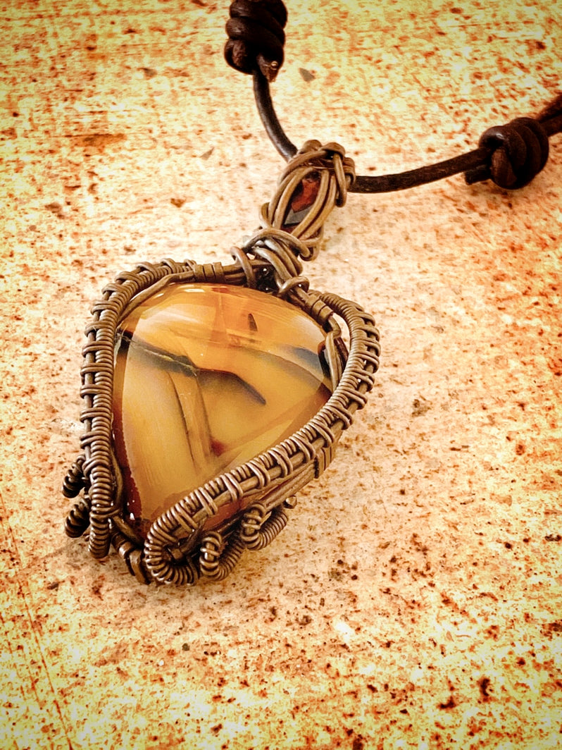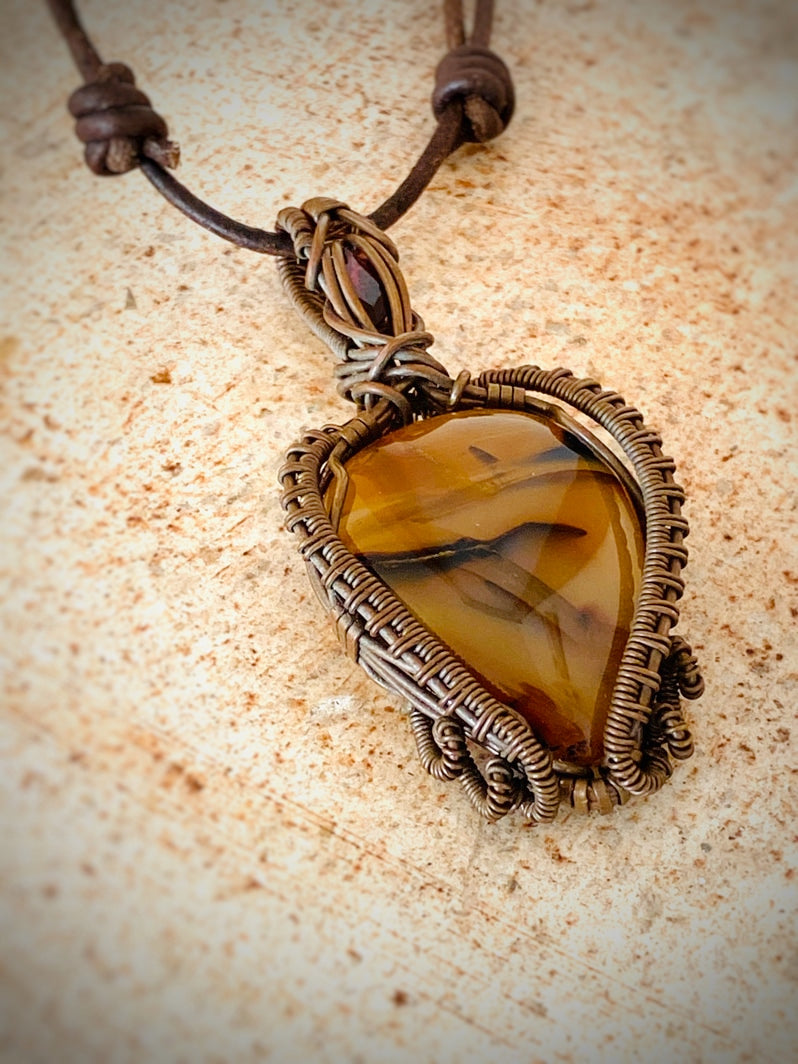 Traumhaft schöner Achat-Tropfen und facettierter Rauchquarz in kunstvollem Wirework an braunem Lederband mit Schiebeknoten in der Länge regulierbar