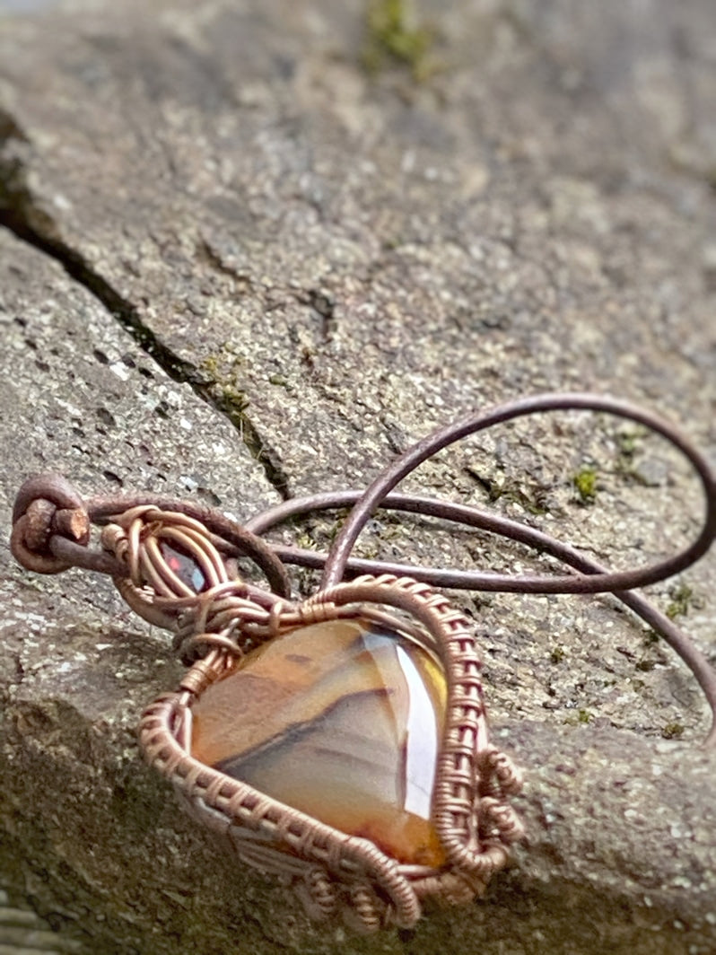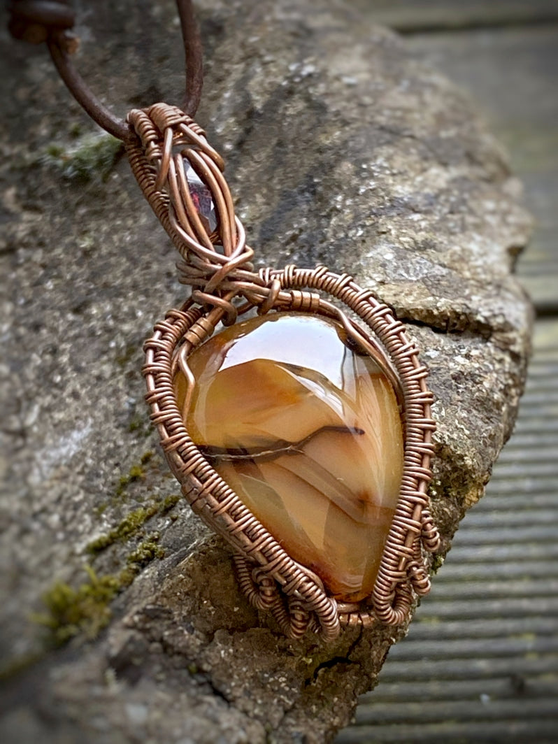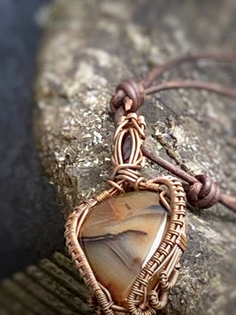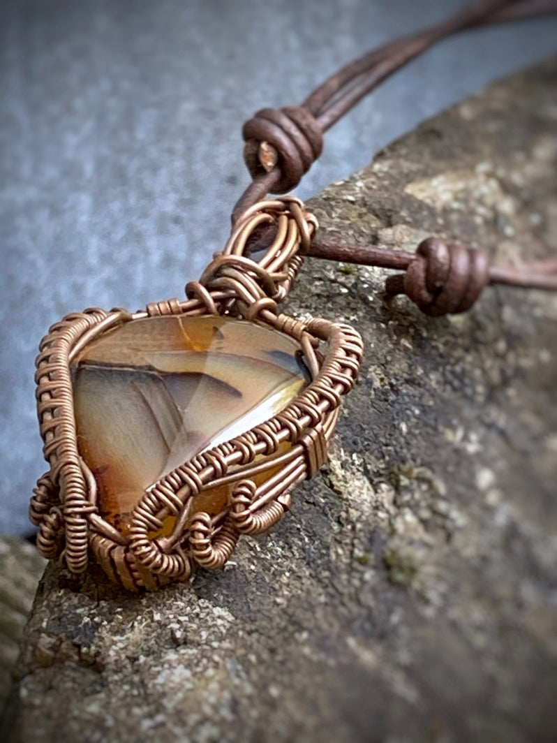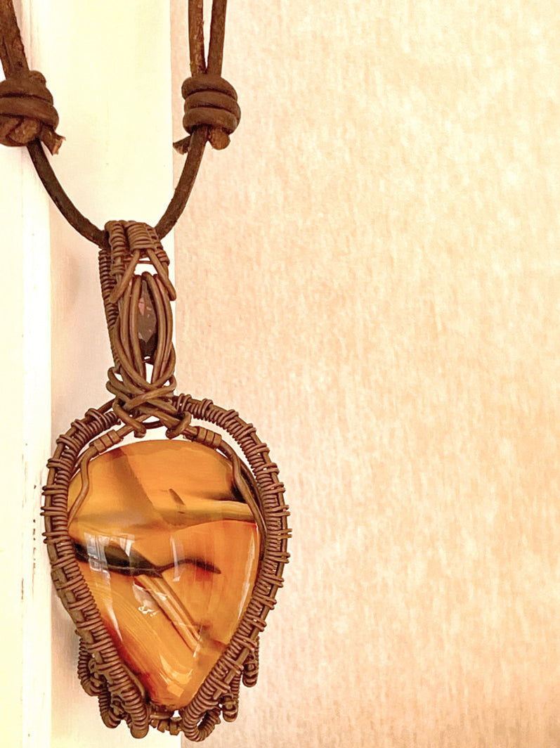 Traumhaft schöner Achat-Tropfen und facettierter Rauchquarz in kunstvollem Wirework an braunem Lederband mit Schiebeknoten in der Länge regulierbar