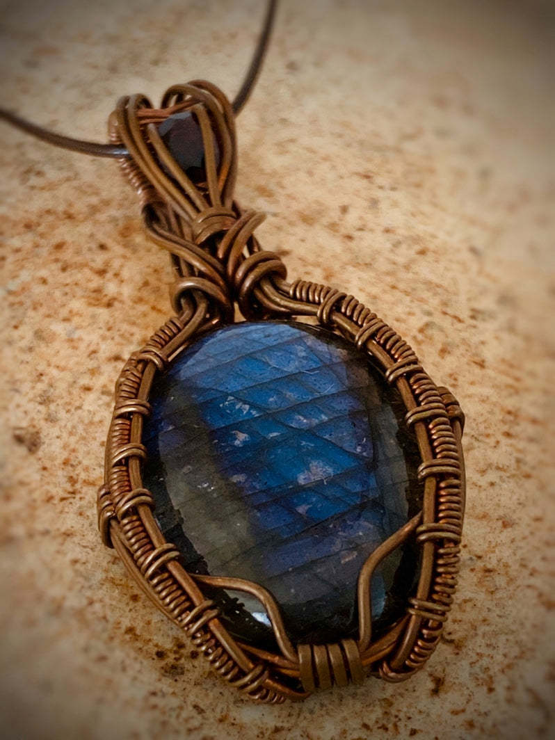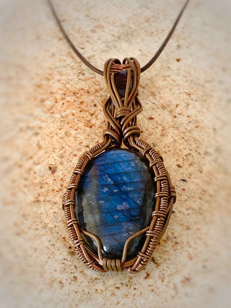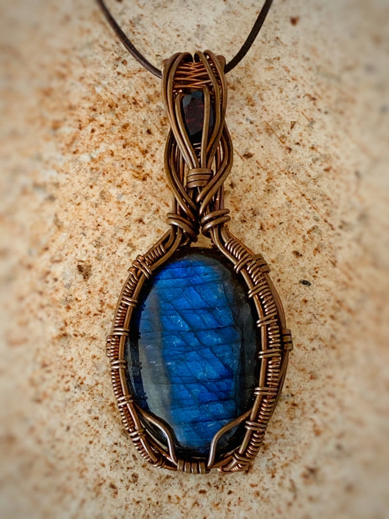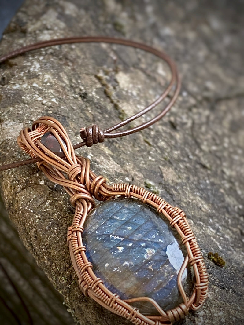 Wunderschöner blauschillernder Labradorit und facettierter Granat in kunstvollem Wirework an braunem Lederband mit Schiebeknoten in der Länge regulierbar