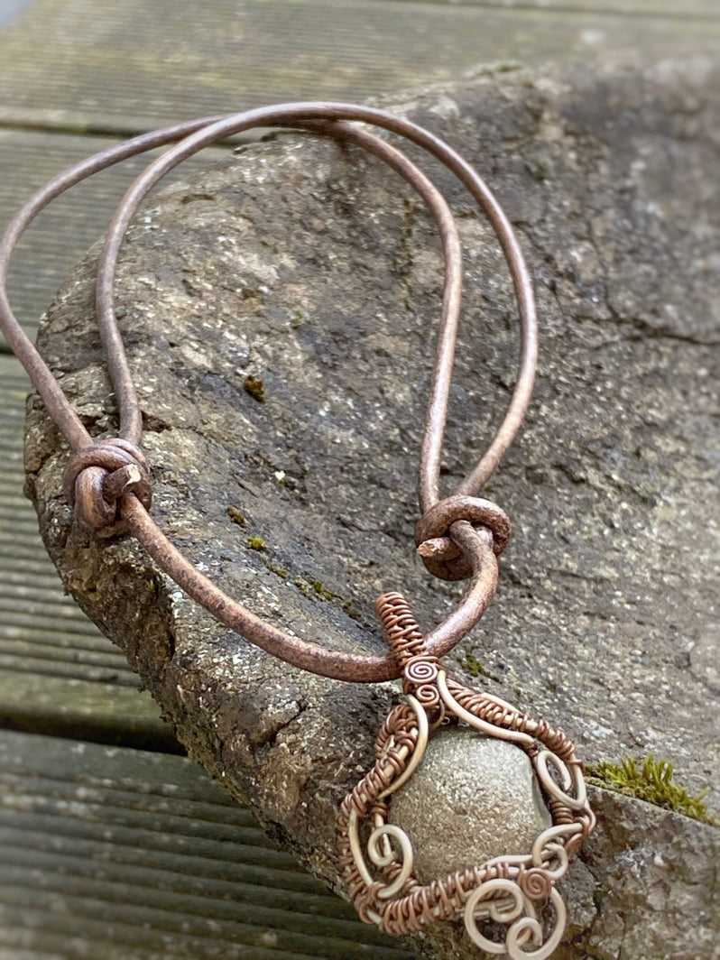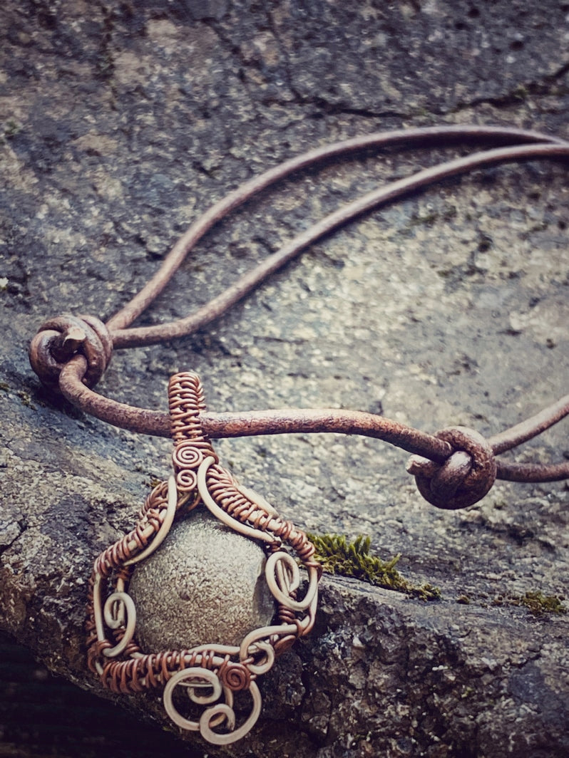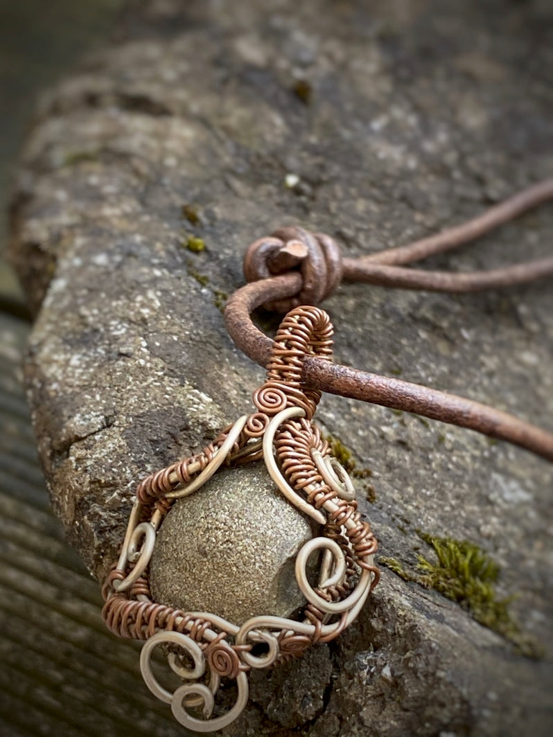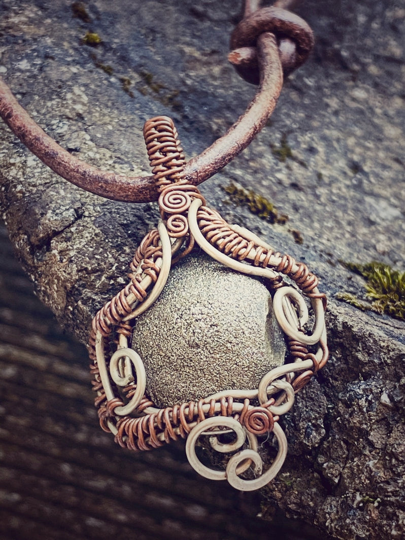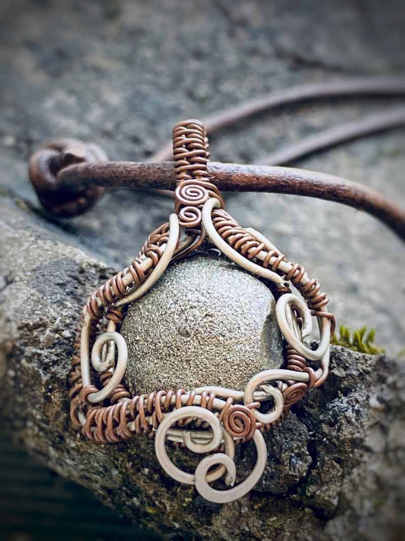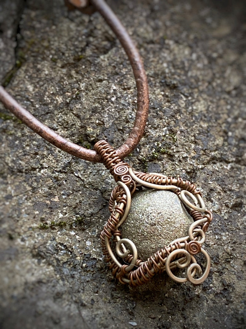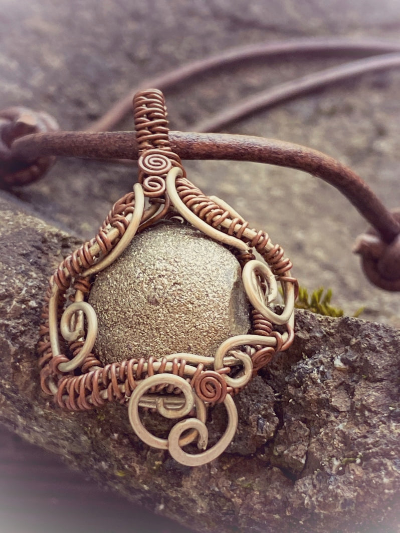 Wundervoller roher Pyrit in kunstvollem Wirework an bronzefarbenem Lederband mit Schiebeknoten in der Länge regulierbar