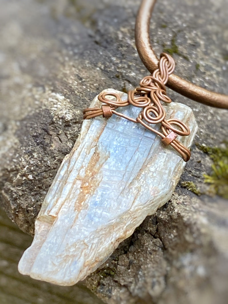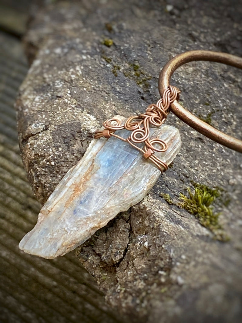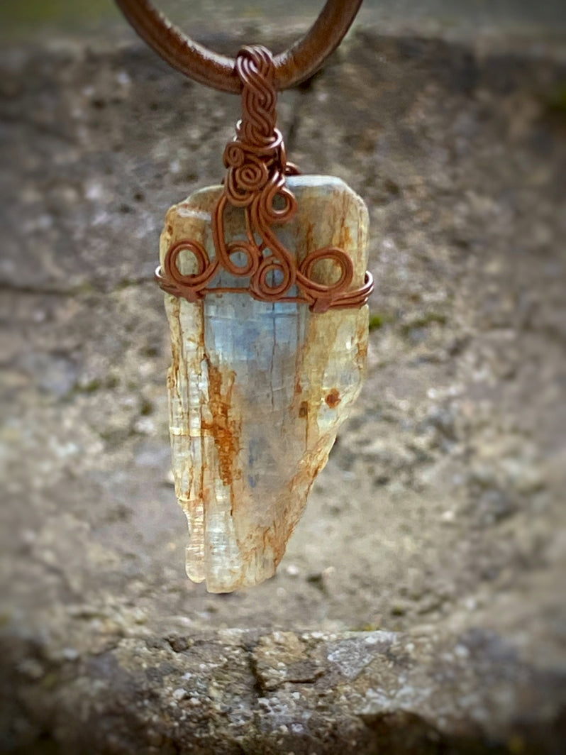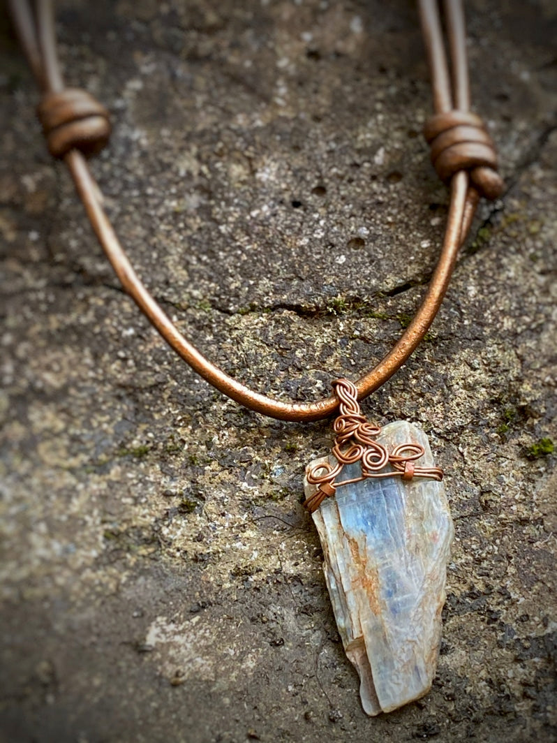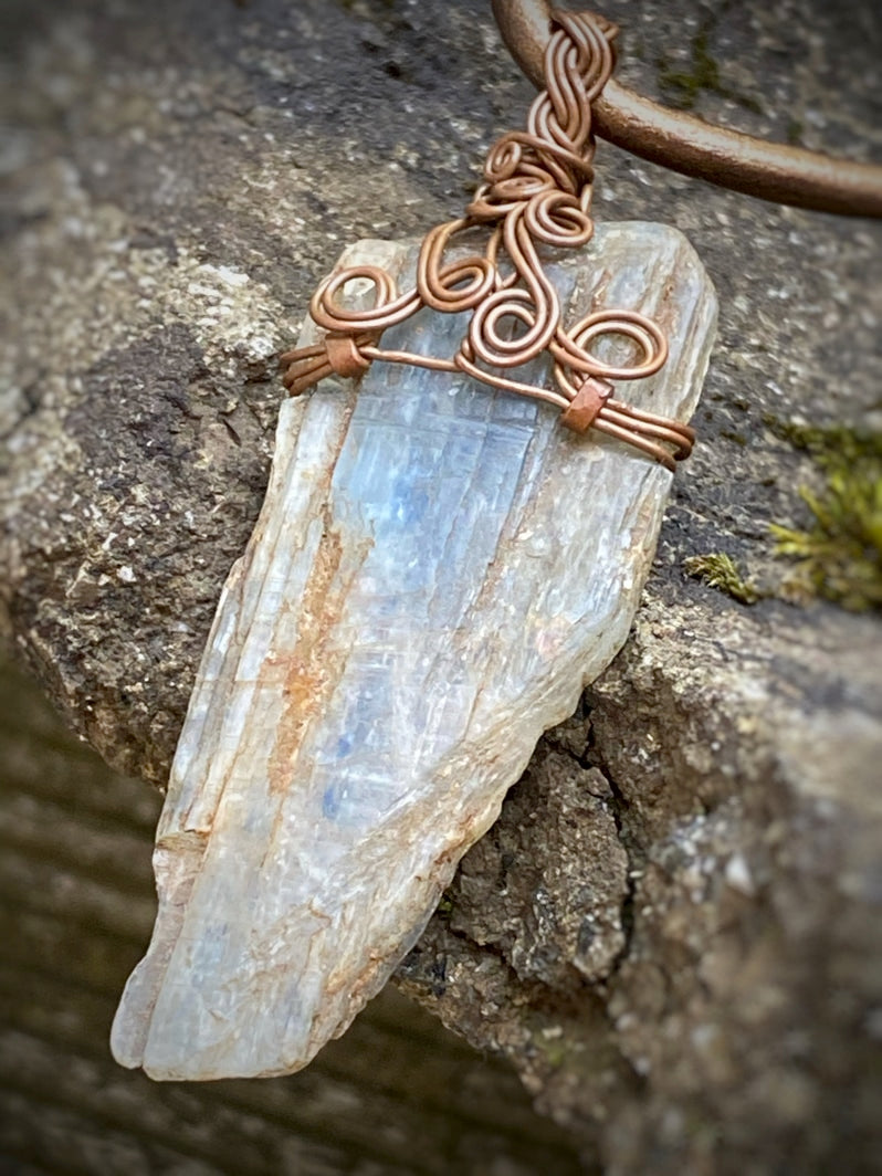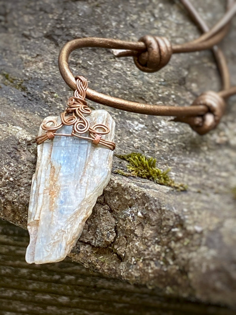 Außergewöhnlich schöner roher Kyanit (Disthen) in kunstvollem Wirework an braunem Lederband mit Schiebeknoten in der Länge regulierbar