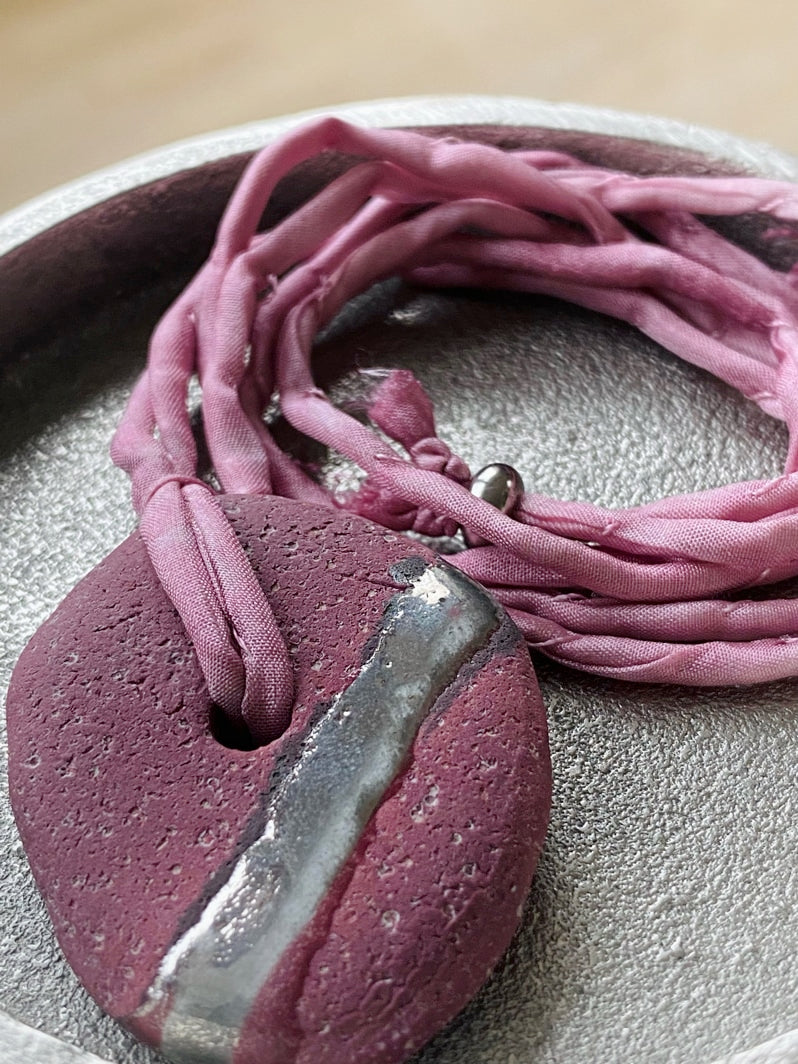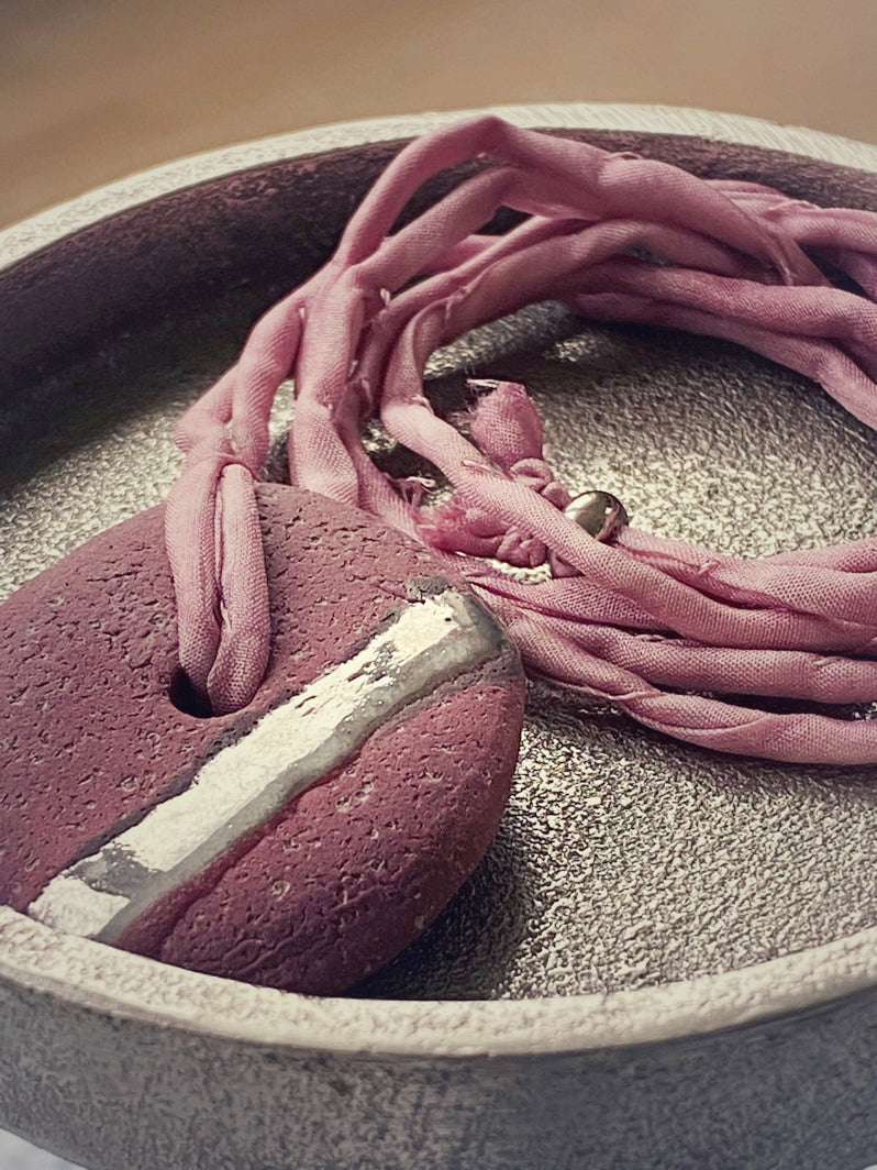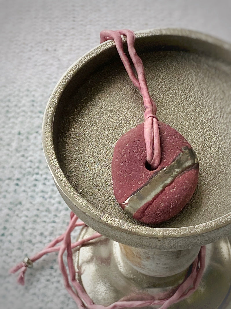 Rosa Stein mit Lochbohrung und silberfarbenem Eye-Catcher an rosa Seidenband