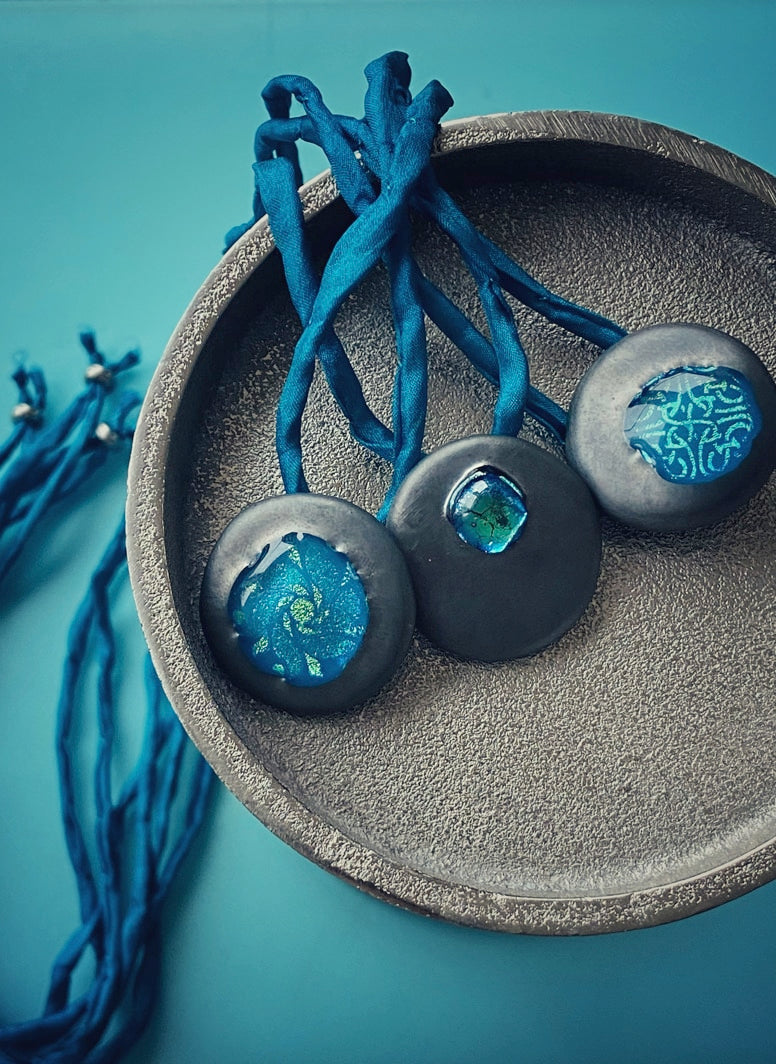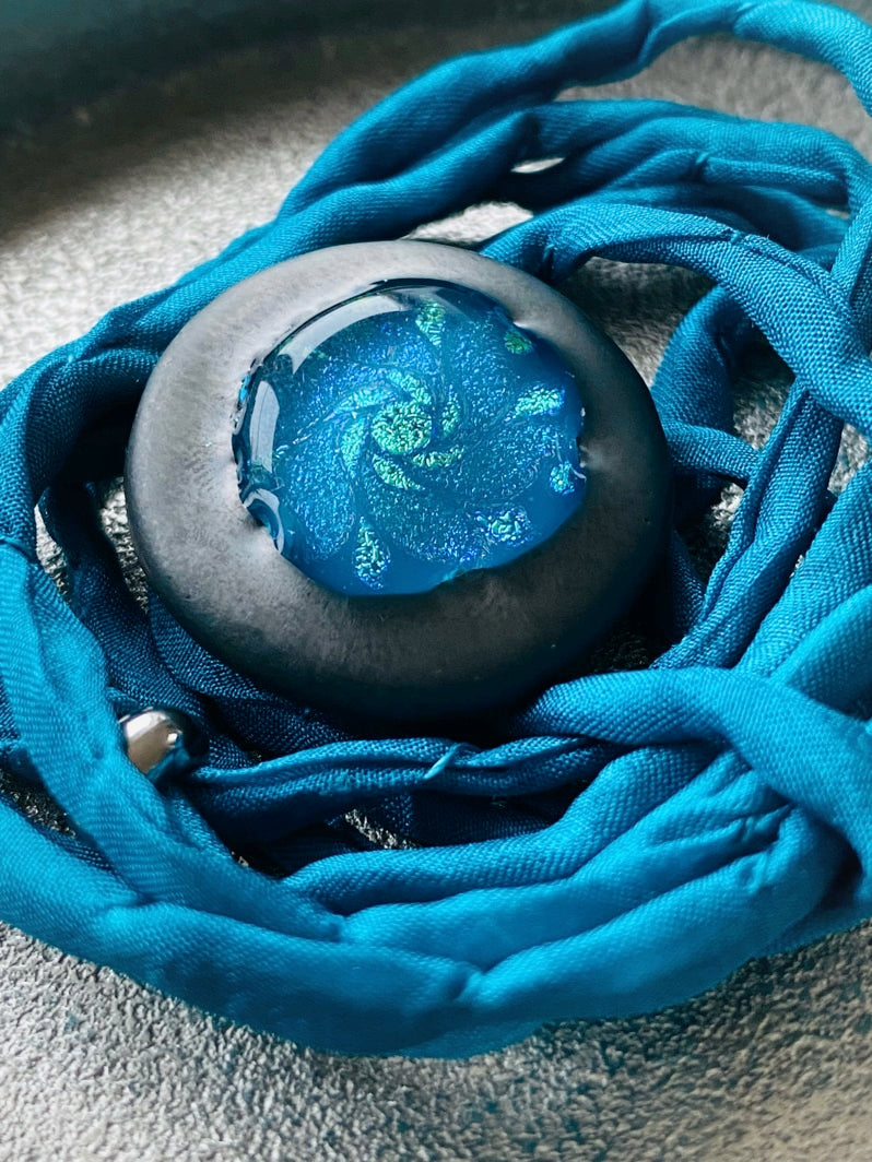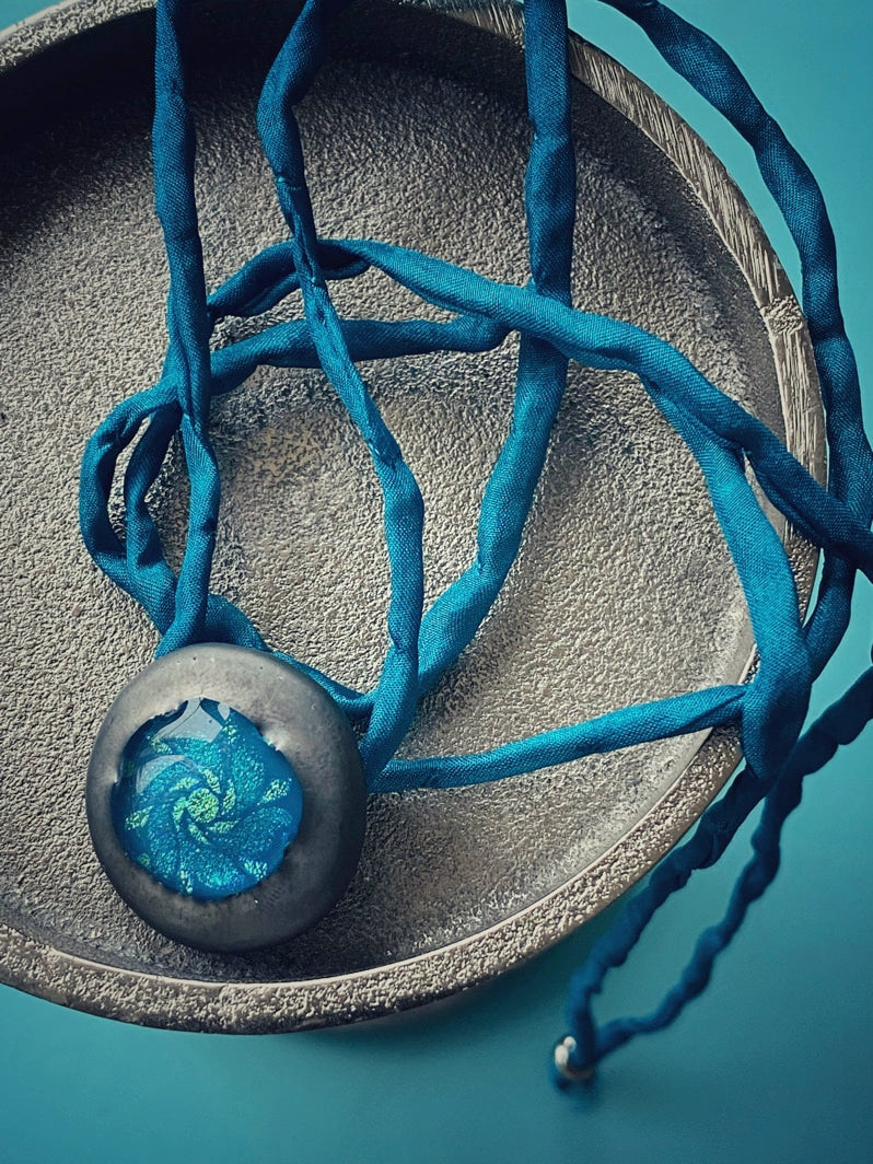 Wunderschöner handgefertigter Anhänger Keramik mit türkisfarbenem Glas an türkisfarbenem Seidenband