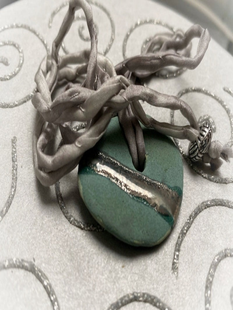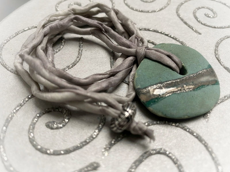 Türkisgrüner Stein mit Lochbohrung und silberfarbenem Eye-Catcher an silbergrauem Seidenband