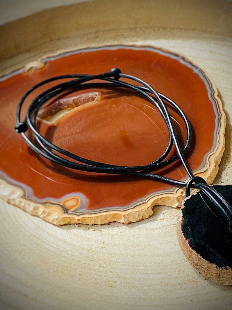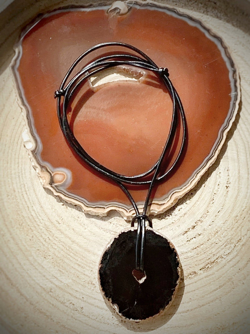 Schwarze Achatscheibe an schwarzem Lederband