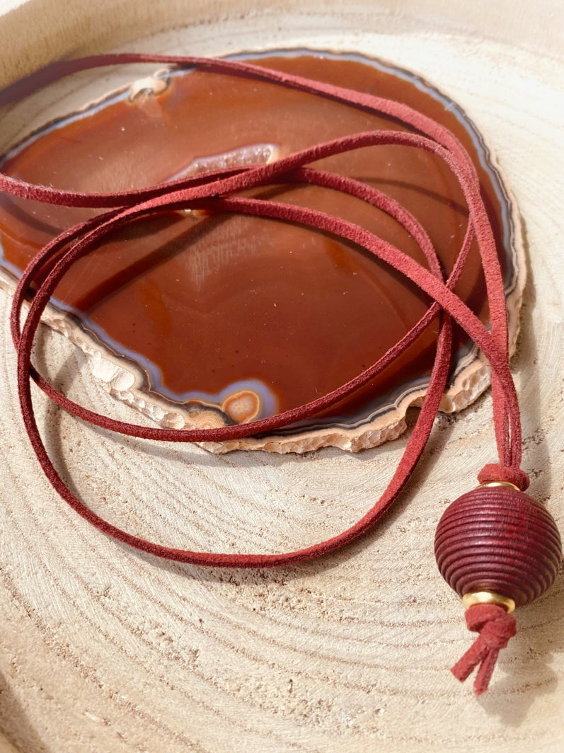 Gedrechselte dunkelrote Holzkugel mit mattgoldenen Ringen an dunkelrotem Velourslederband