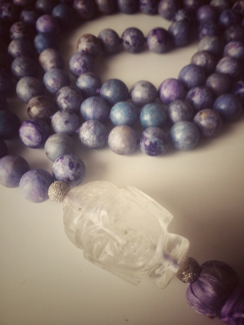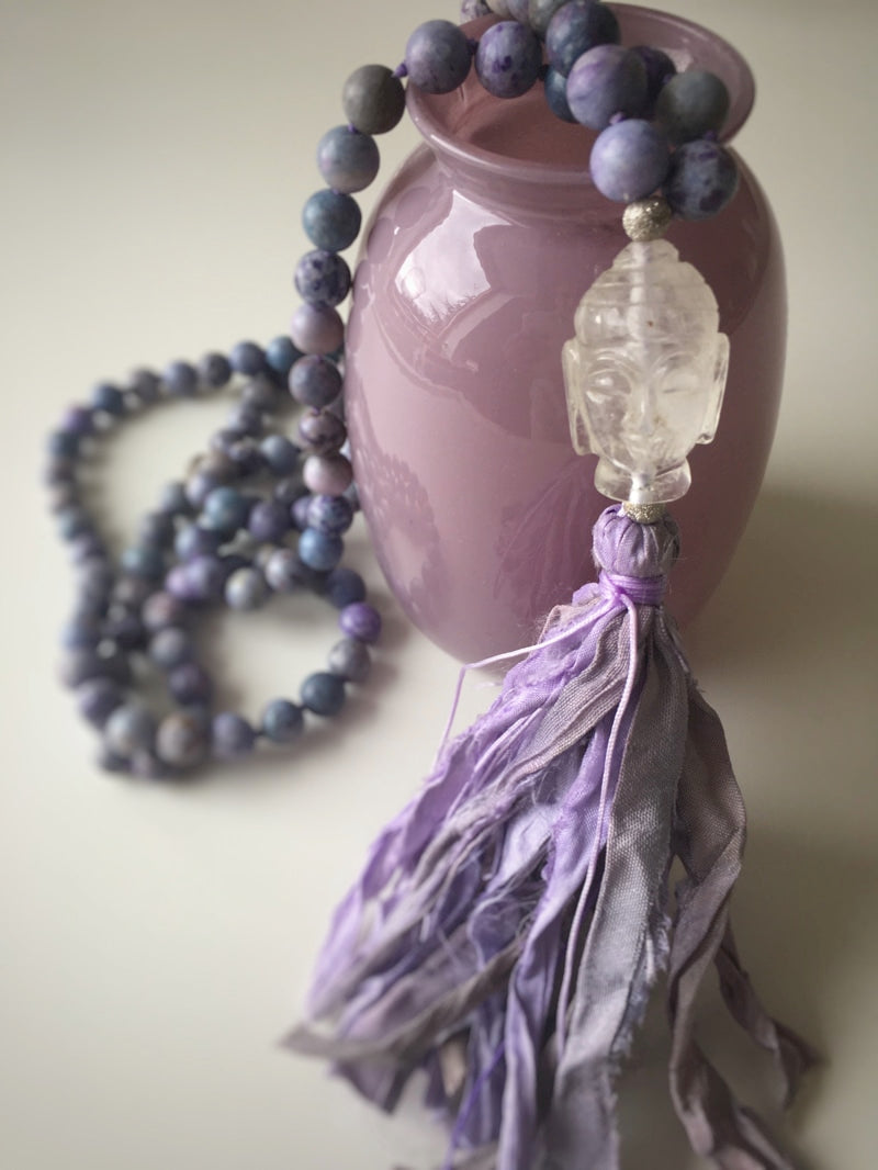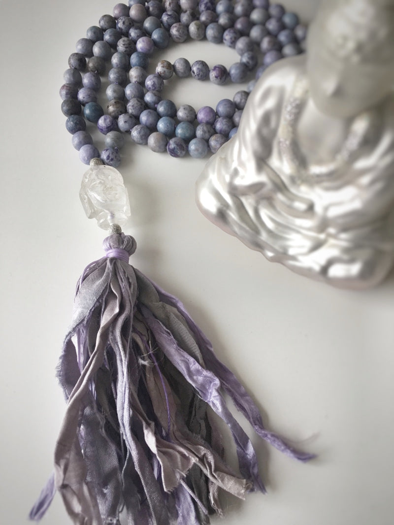 Guru-Bead: Buddha aus Kristall mit Seidenbandquaste