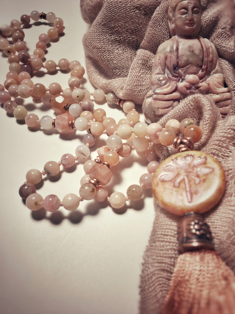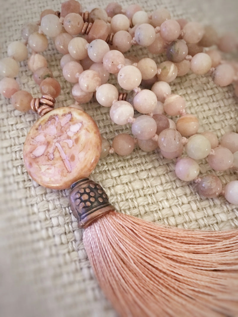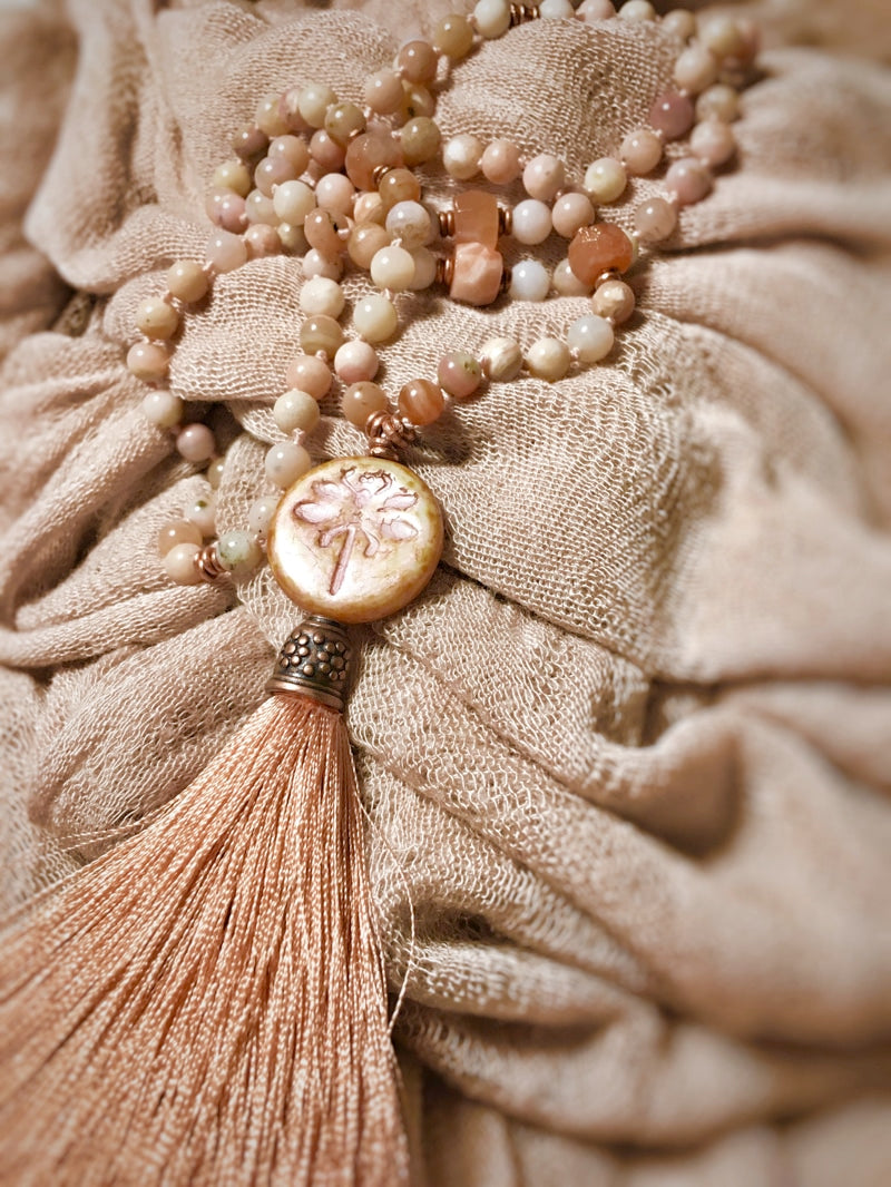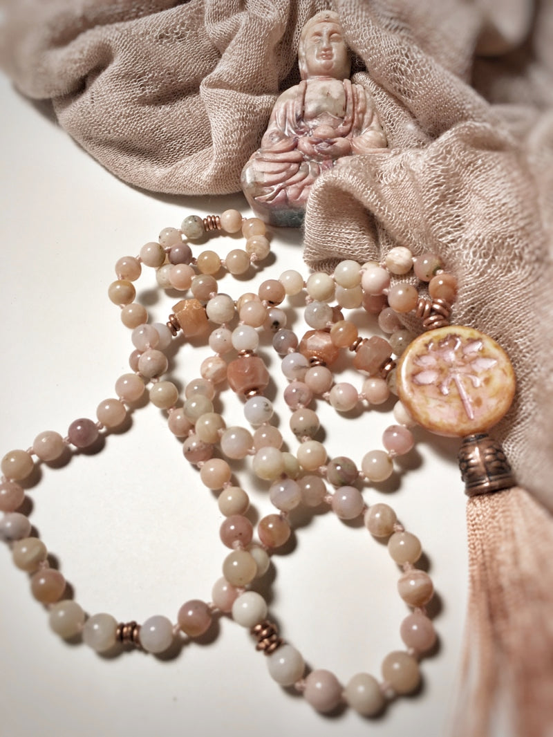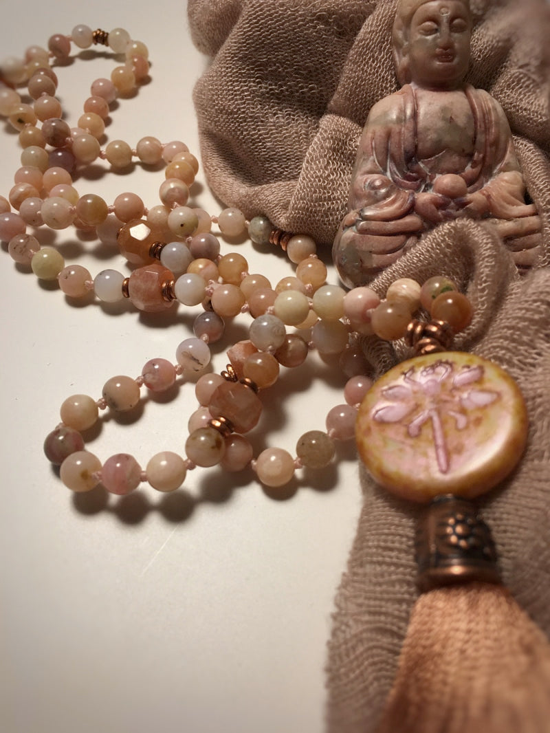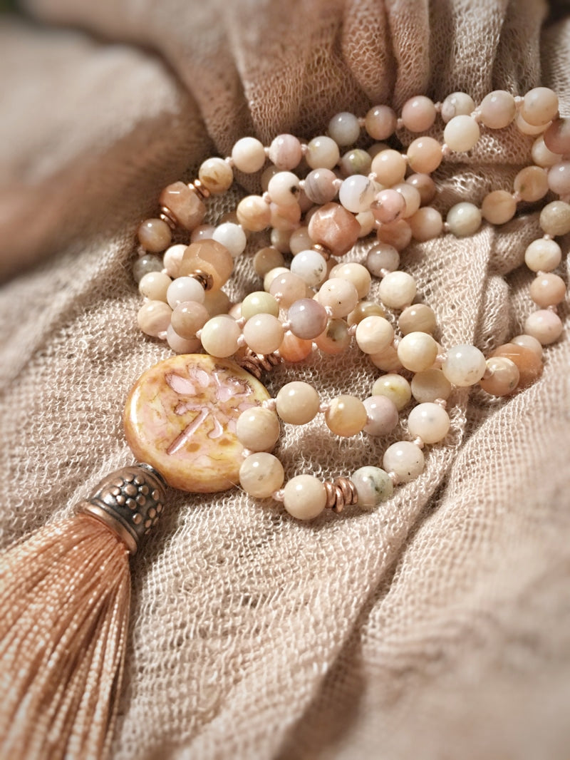 Abschluss: Böhmisches Glas-Amulett mit Libelle und altrosa Seidenquaste mit verzierter Kupferkappe