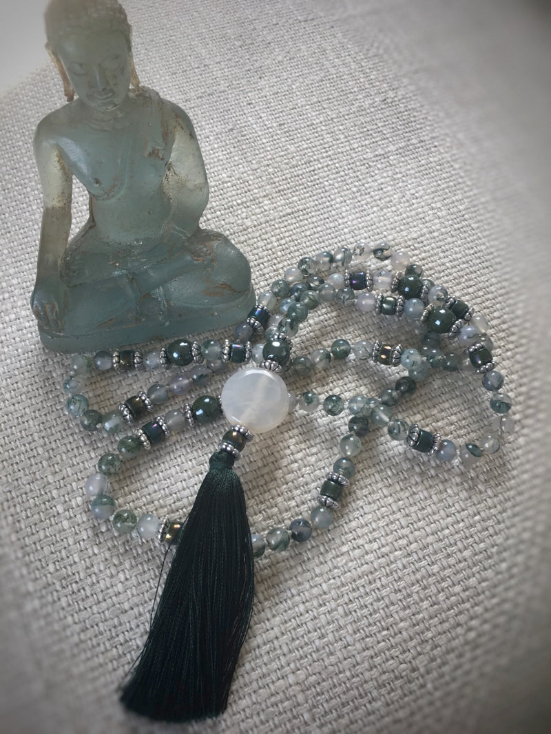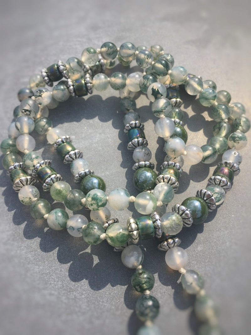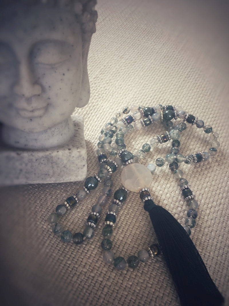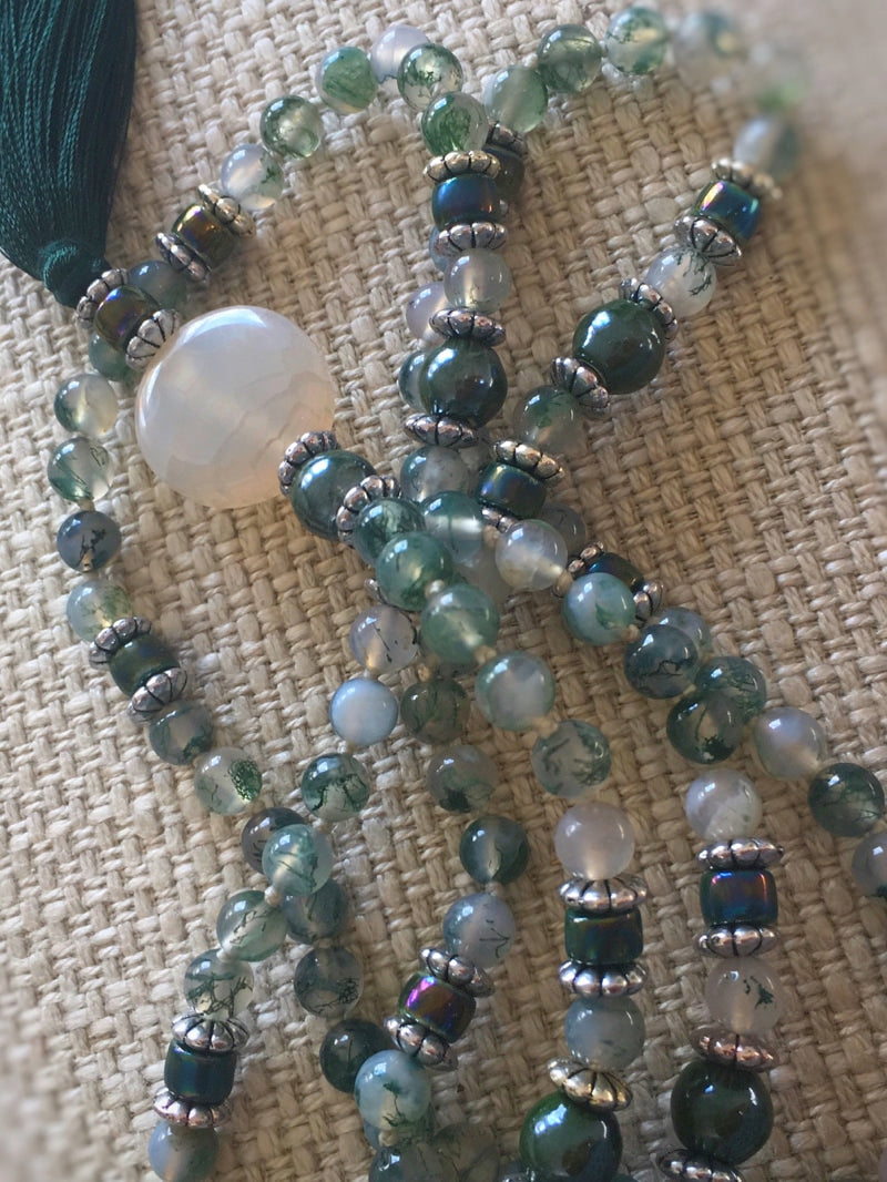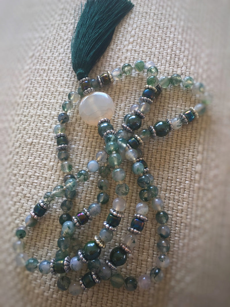 Diese bezaubernde Mala erhält ihre Energie von sehr hochwertigen Moosachat-Perlen und schillernden Keramik-Perlen