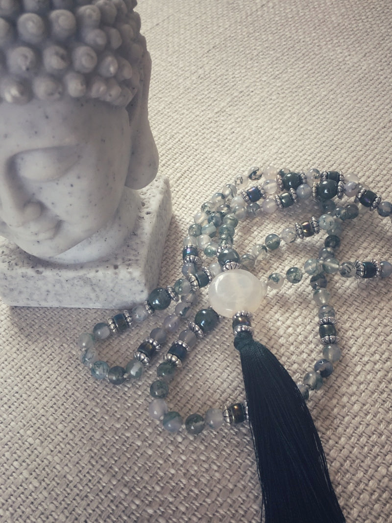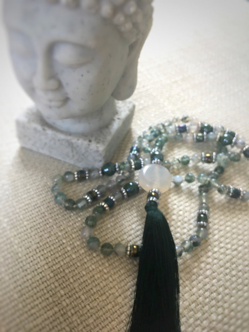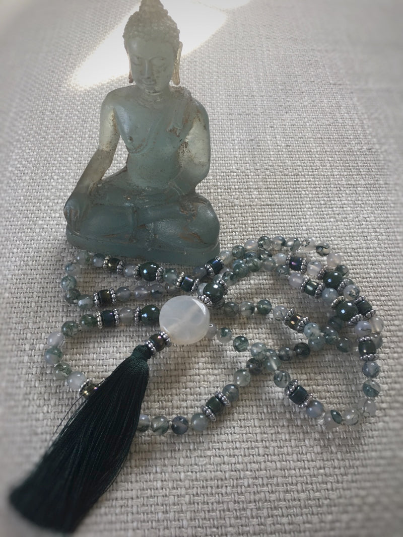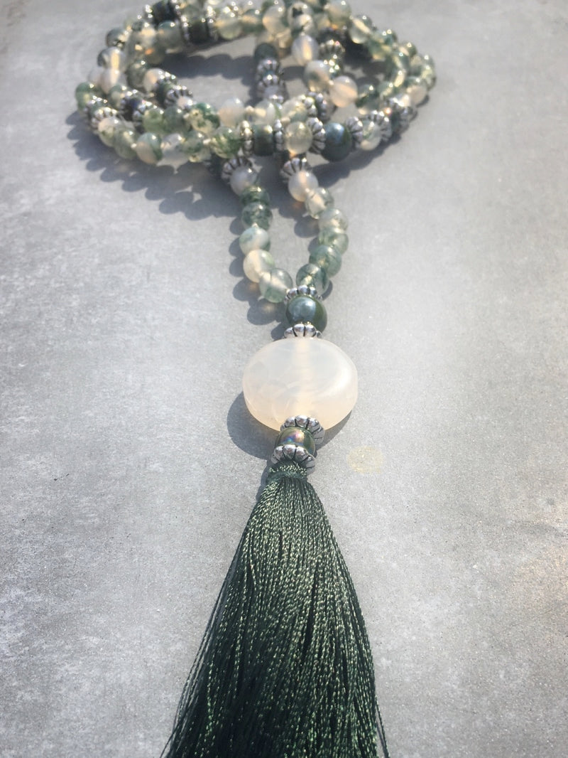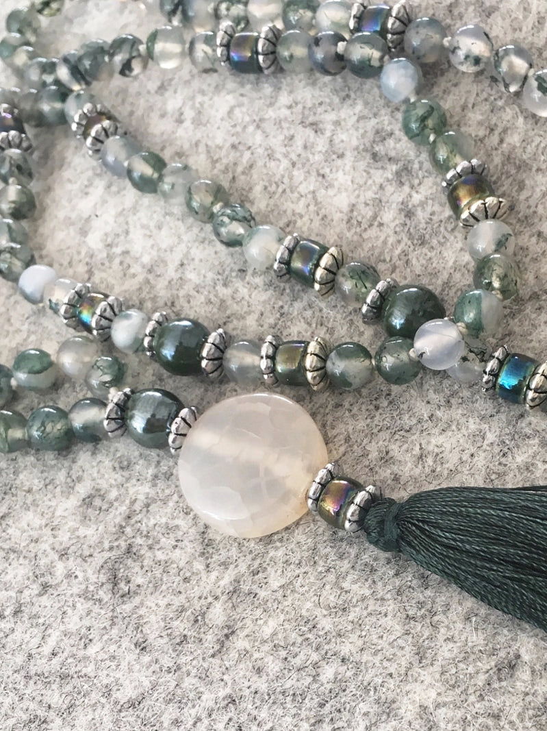Diese bezaubernde Mala erhält ihre Energie von sehr hochwertigen Moosachat-Perlen und schillernden Keramik-Perlen