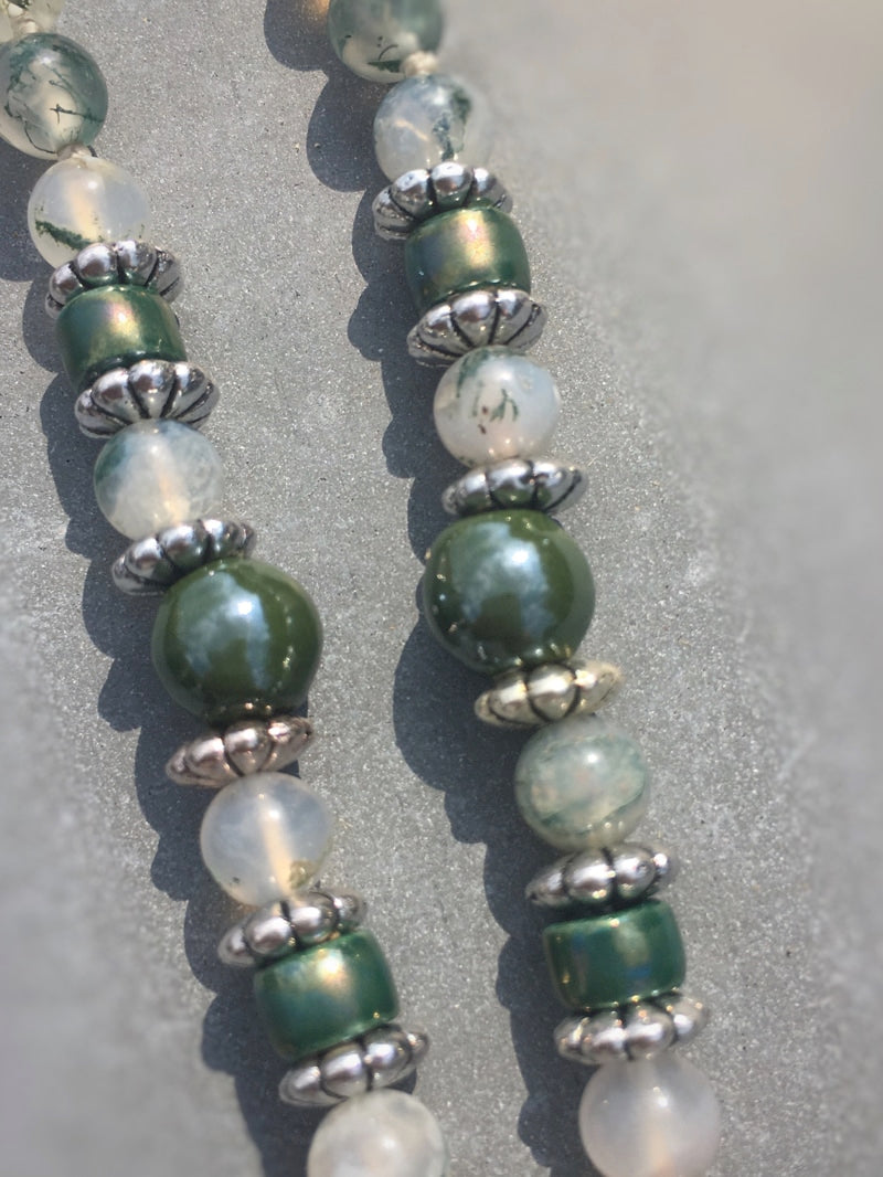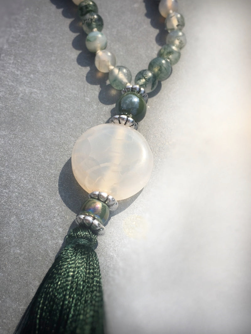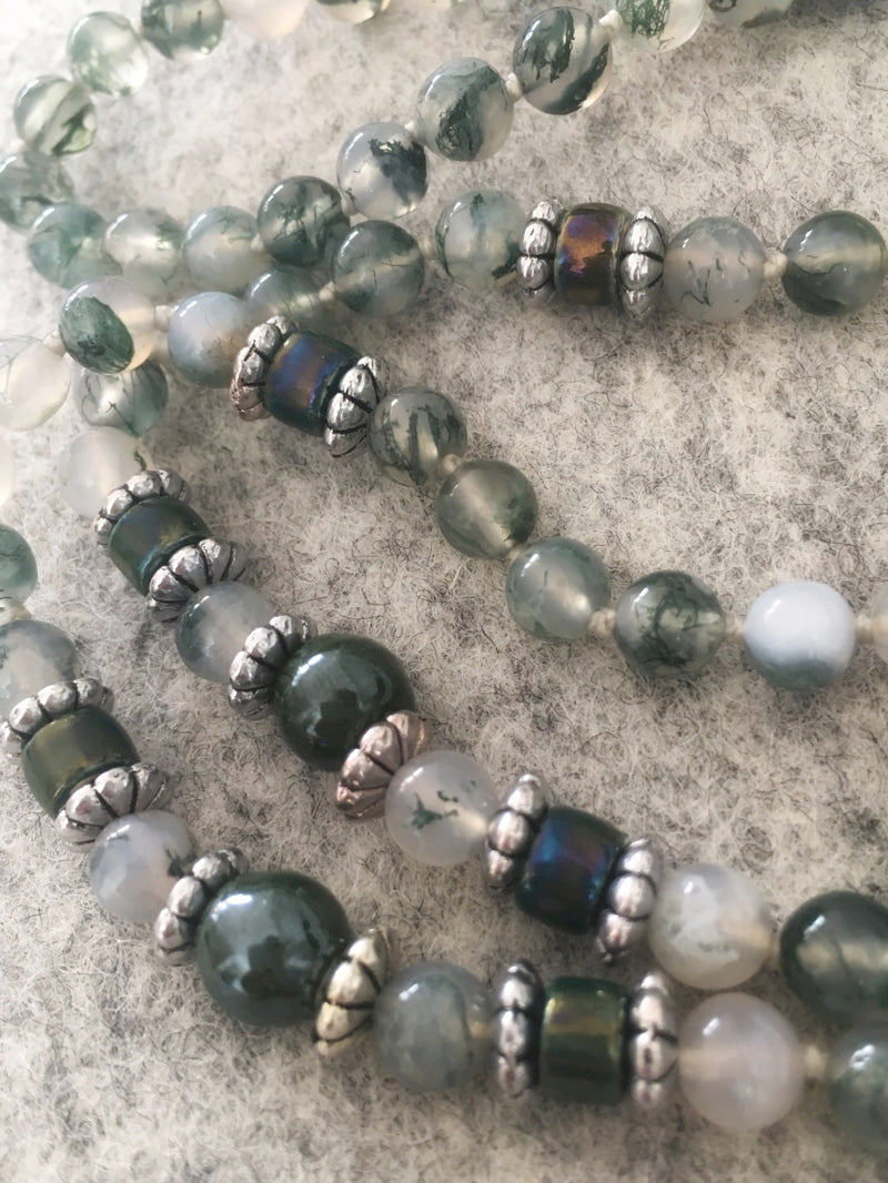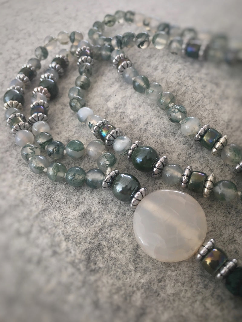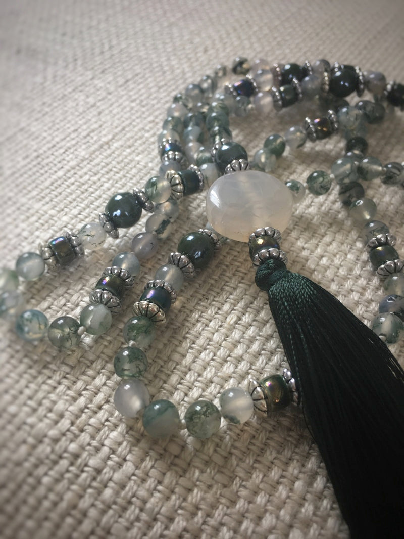 Diese bezaubernde Mala erhält ihre Energie von sehr hochwertigen Moosachat-Perlen und schillernden Keramik-Perlen