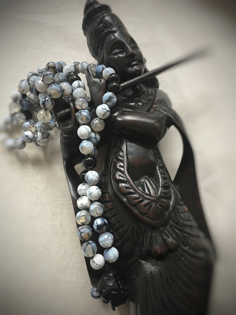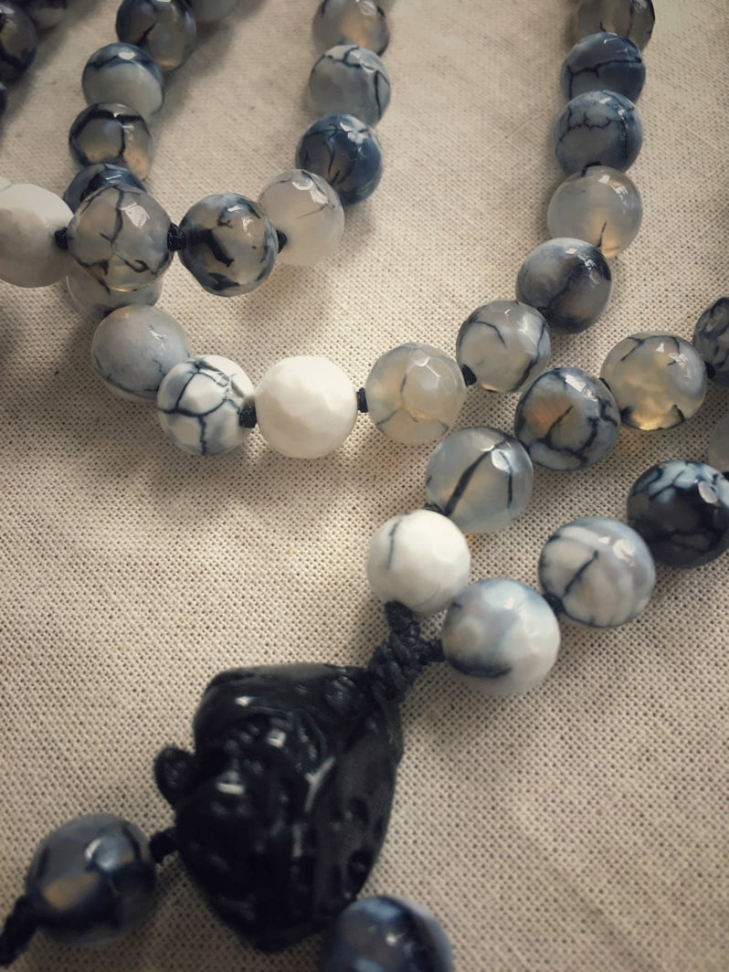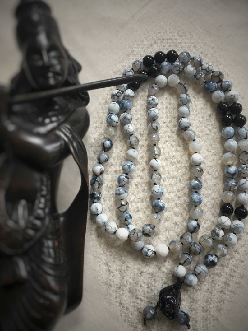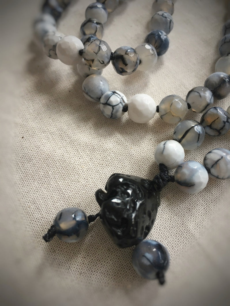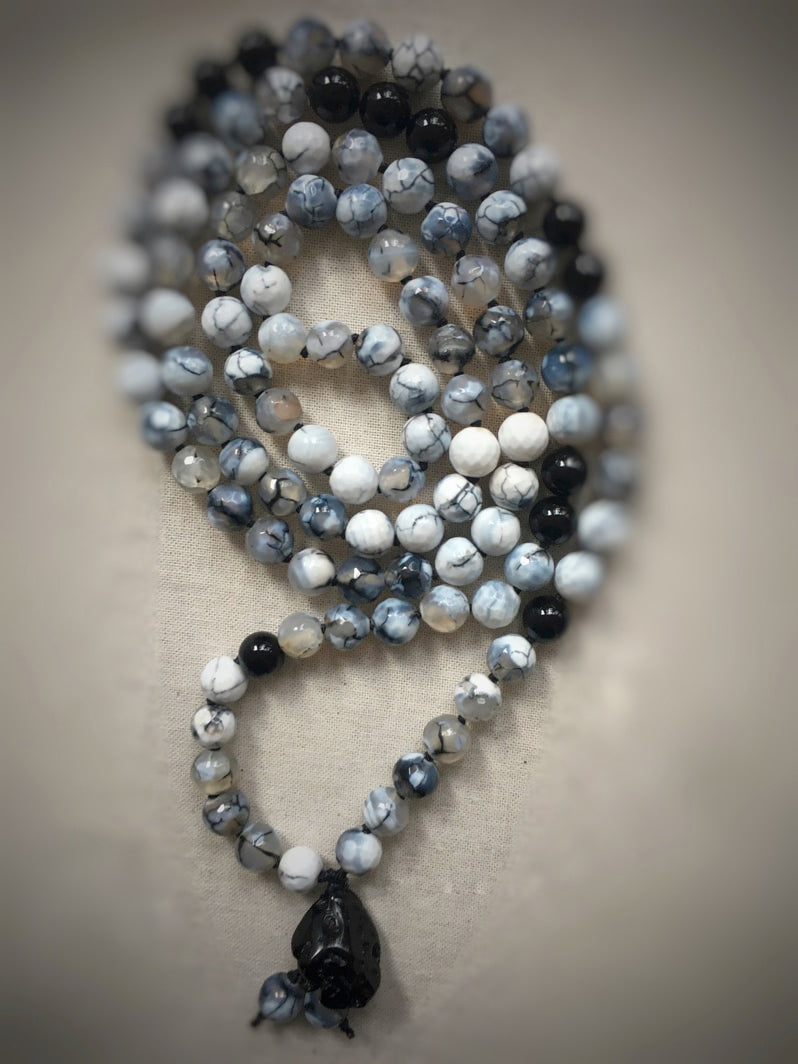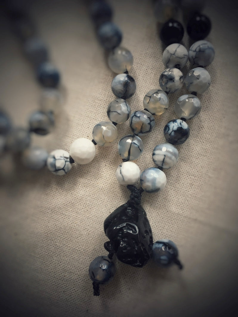 Mala aus Spinnennetz-Achat-Perlen und einem kraftvollen Tektit-Anhänger