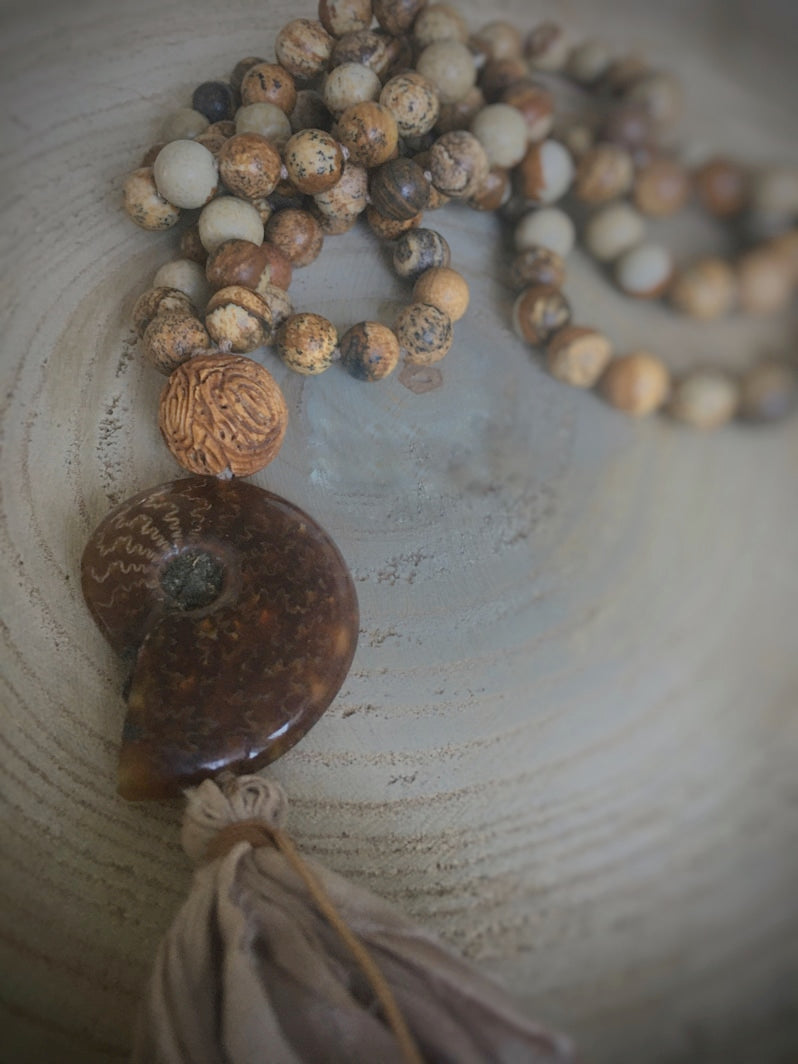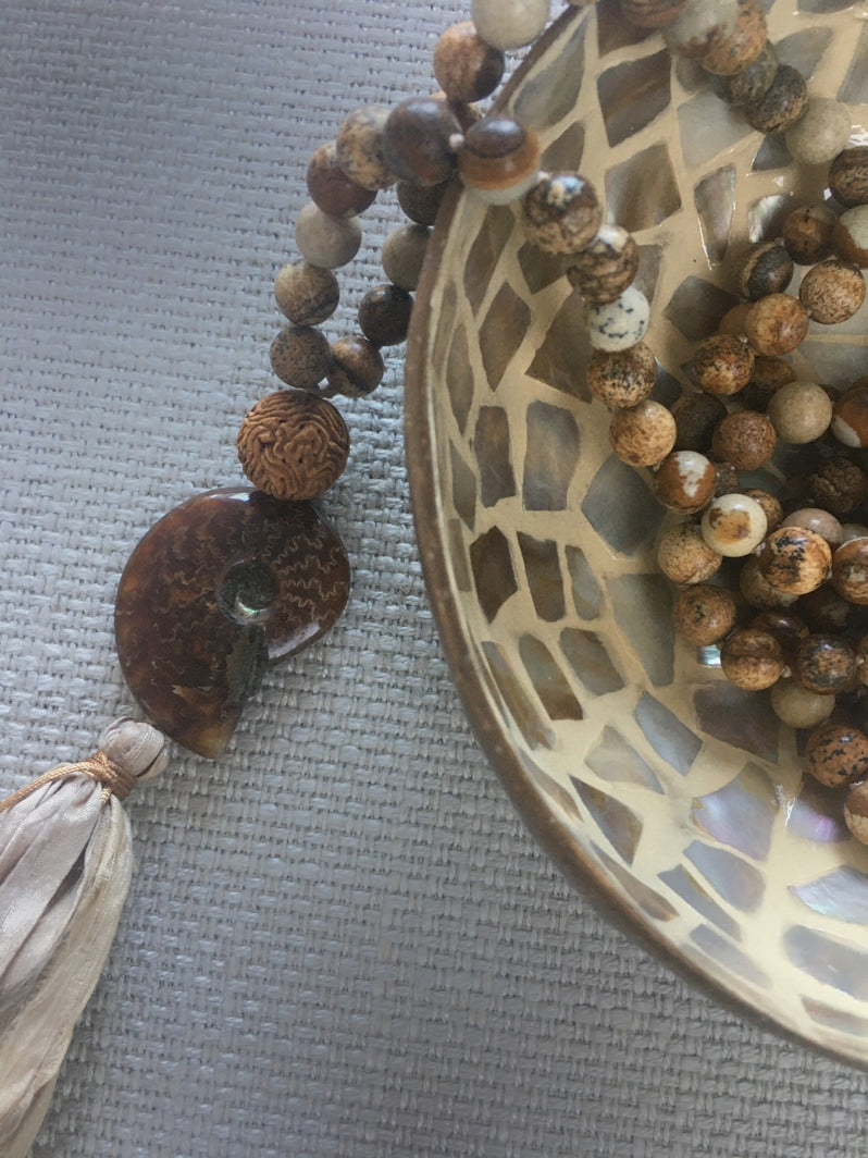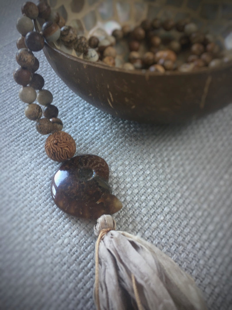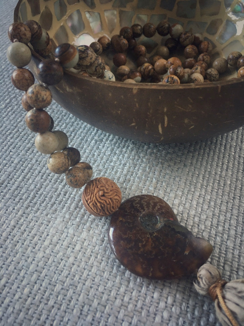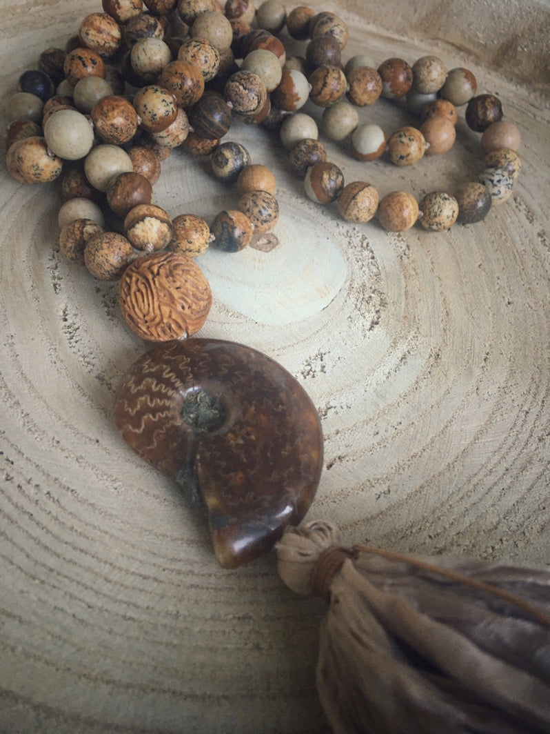 Abschluss: Geschnitzte Samen-Perle, Ammonit, Seidenbandquaste