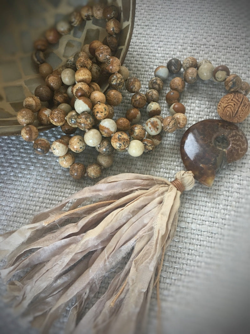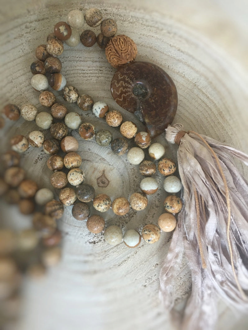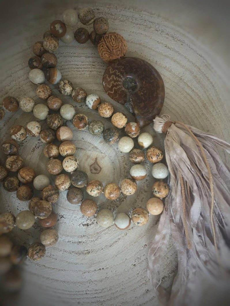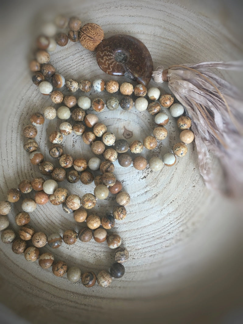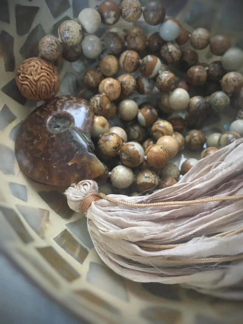 Abschluss: Geschnitzte Samen-Perle, Ammonit, Seidenbandquaste