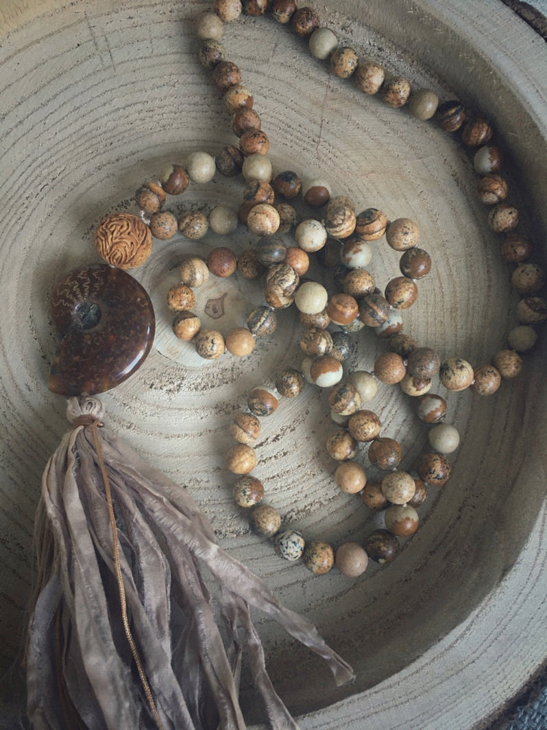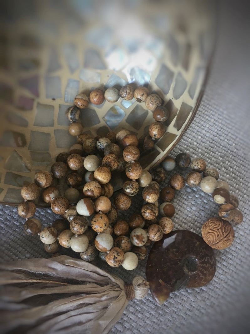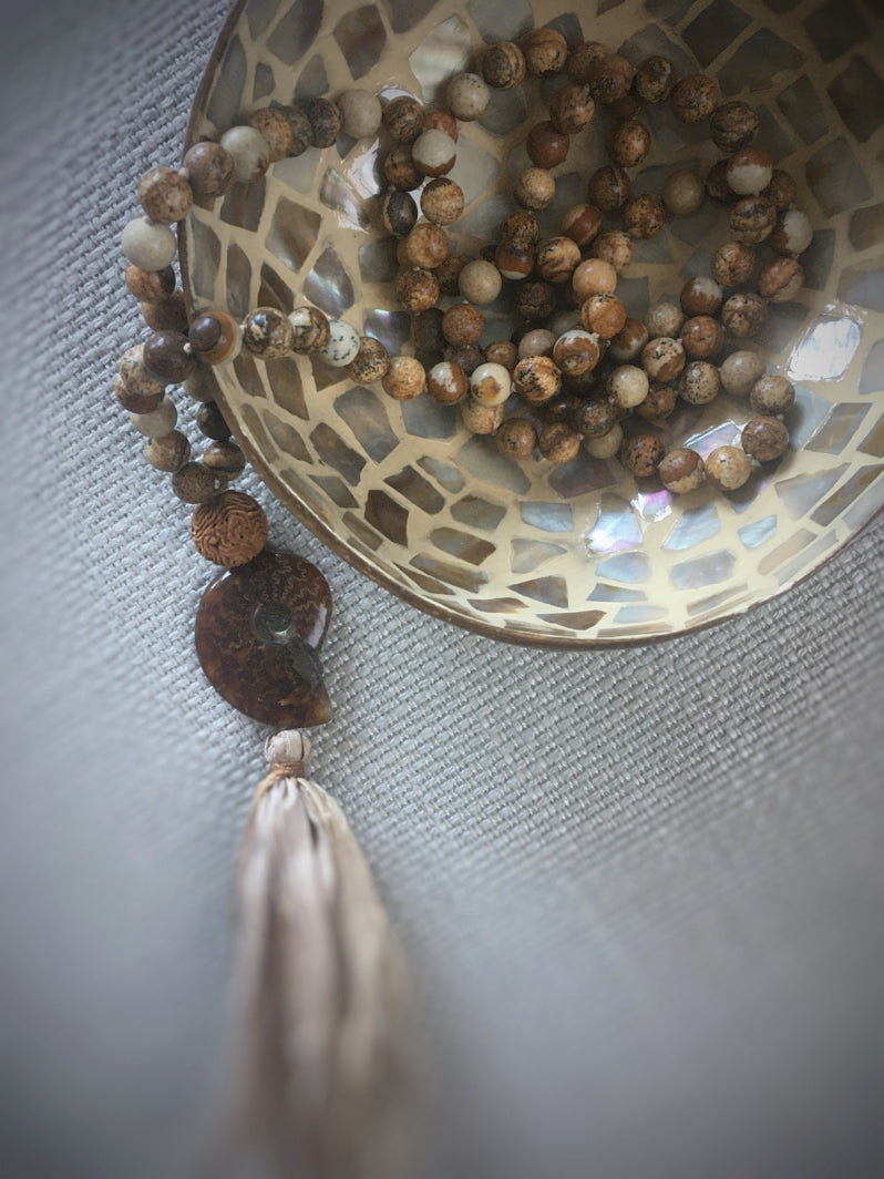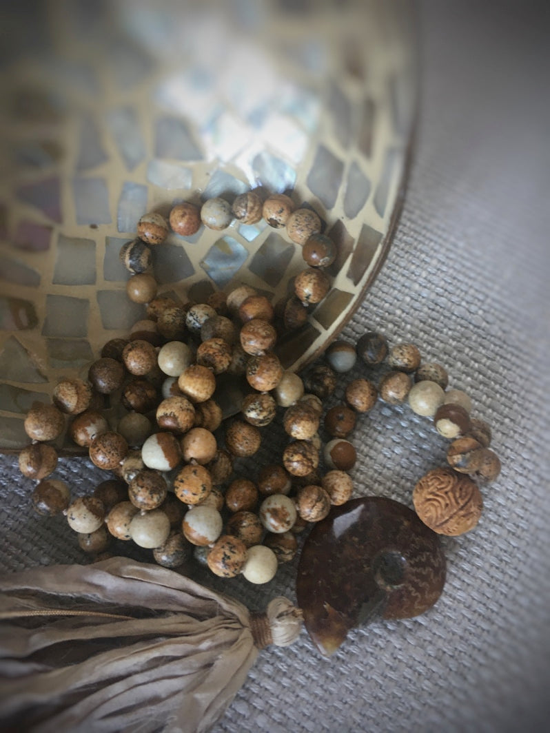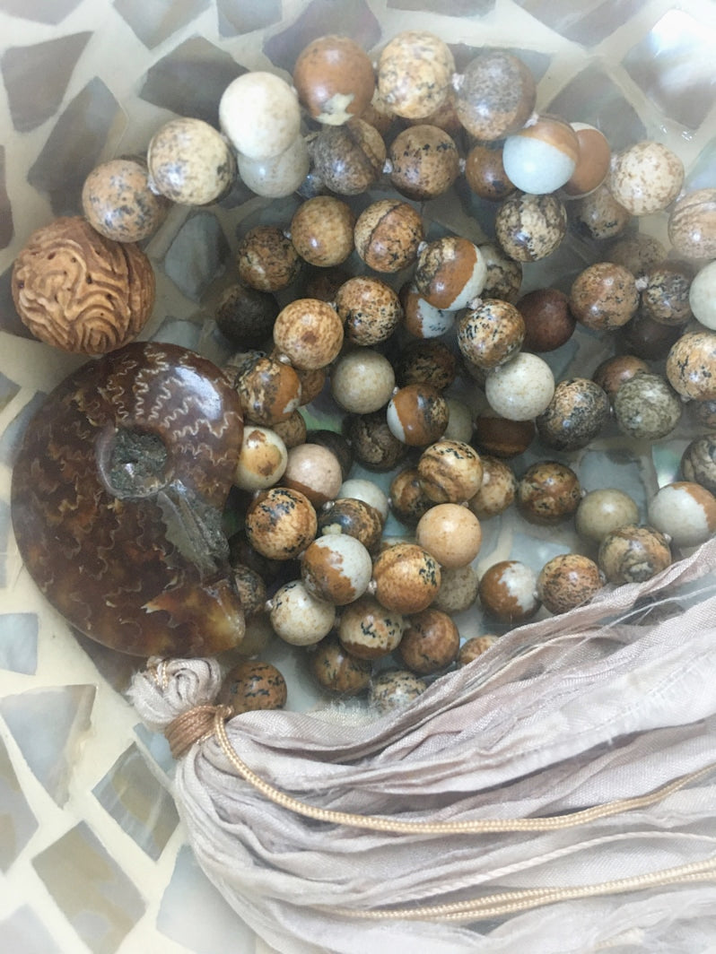 Abschluss: Geschnitzte Samen-Perle, Ammonit, Seidenbandquaste