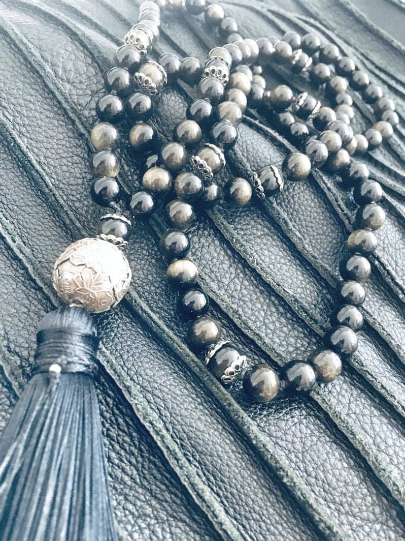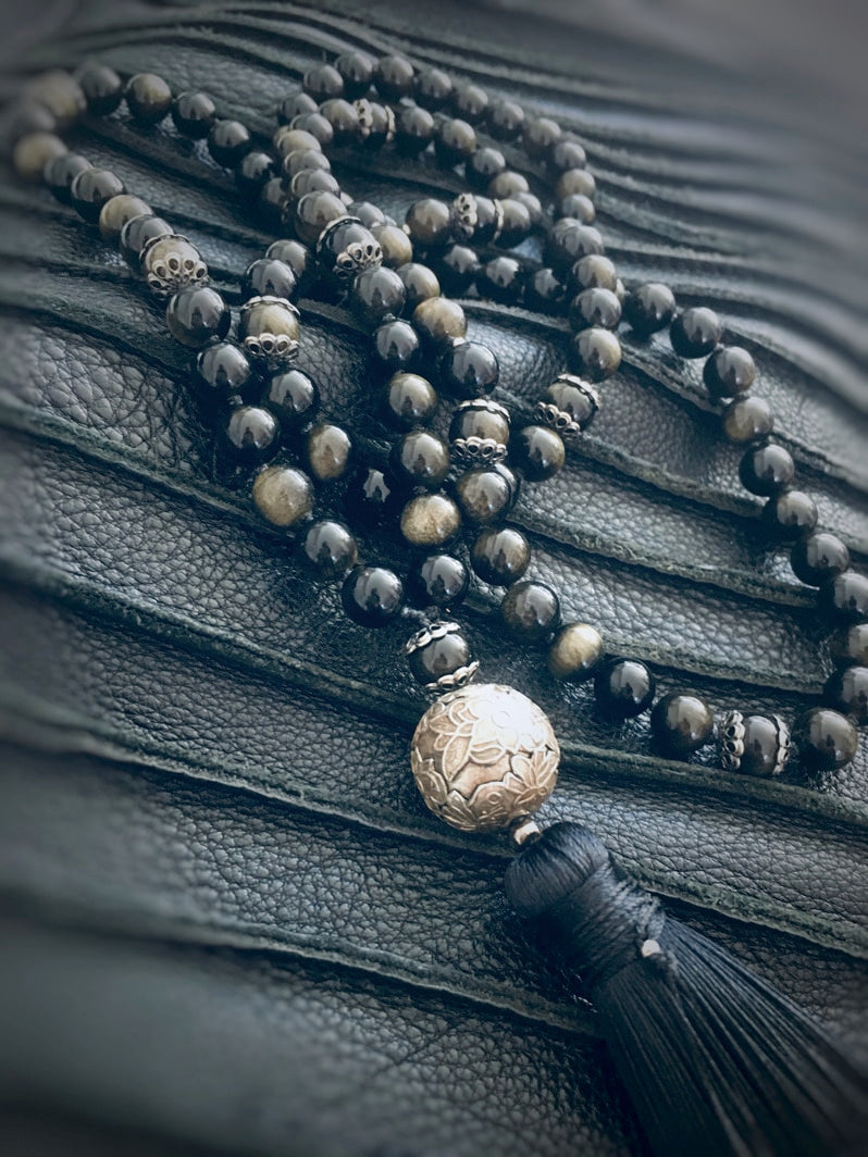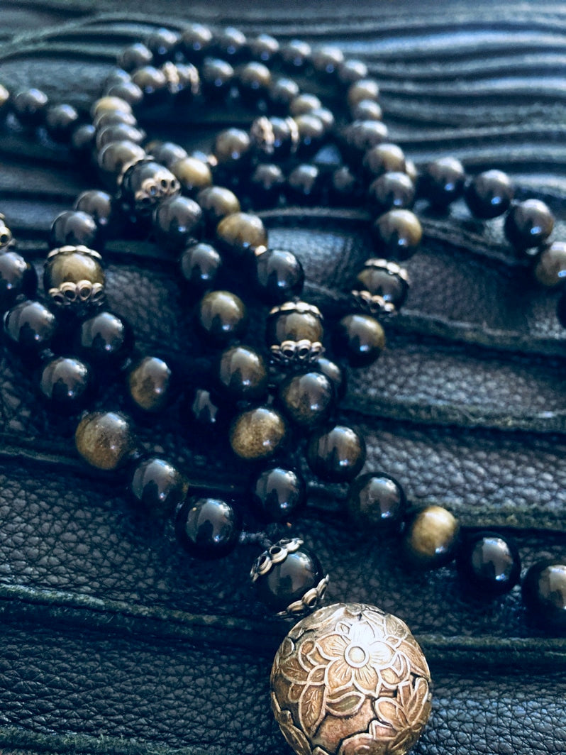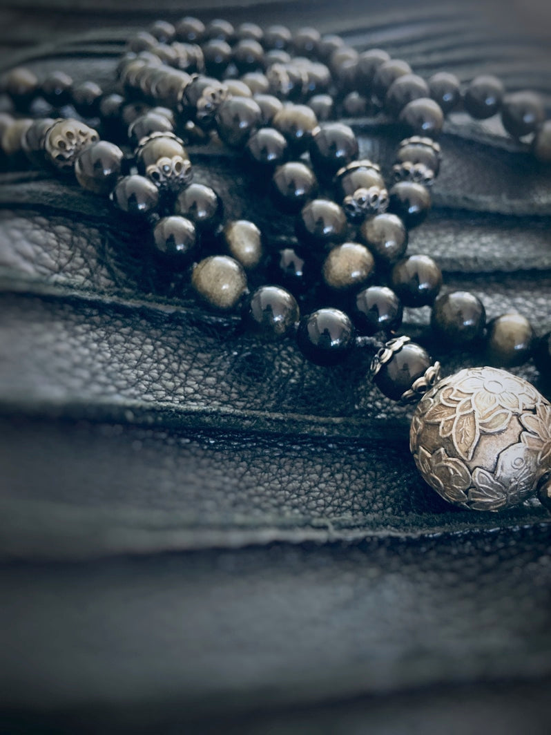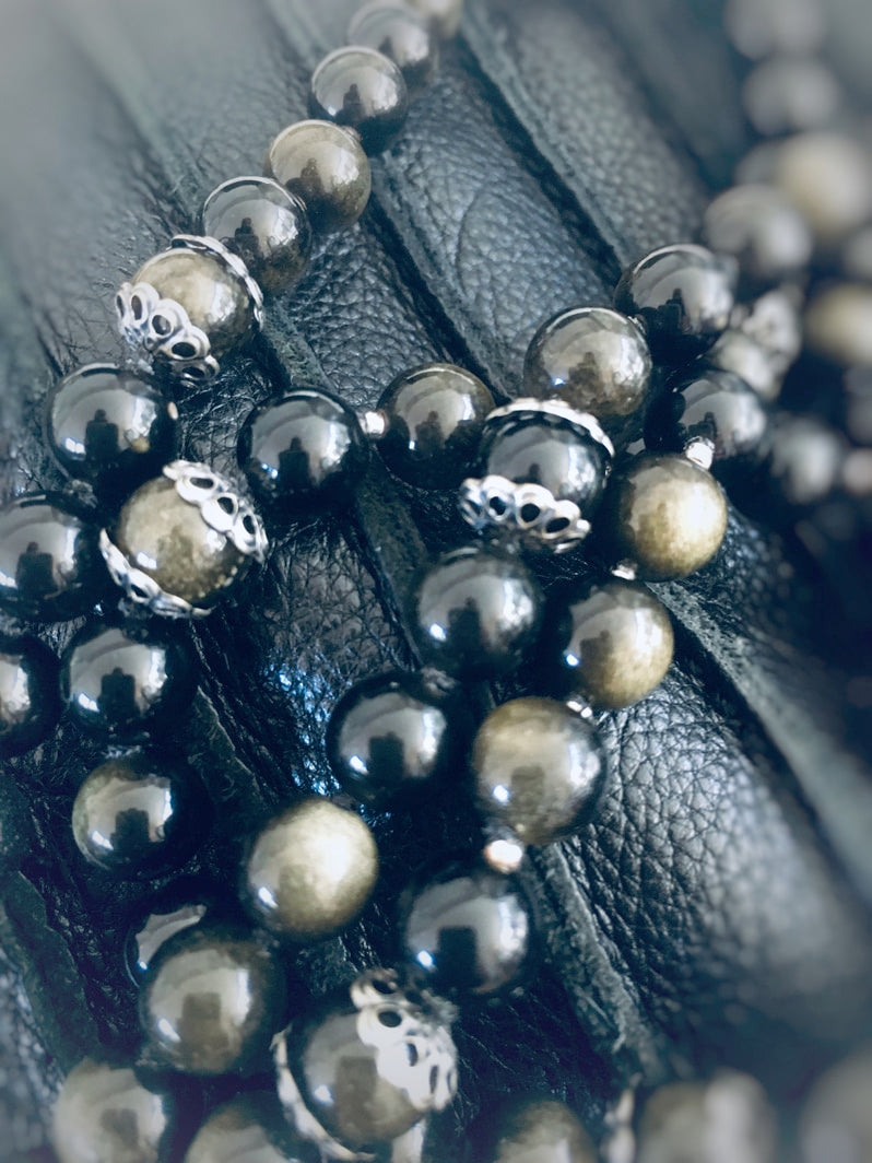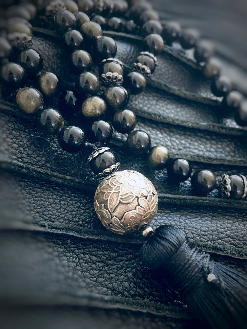 Traumhaft schöne golden schimmernde Obsidian-Perlen mit floraler Ornament-Perle - eine besonders edle Kreation