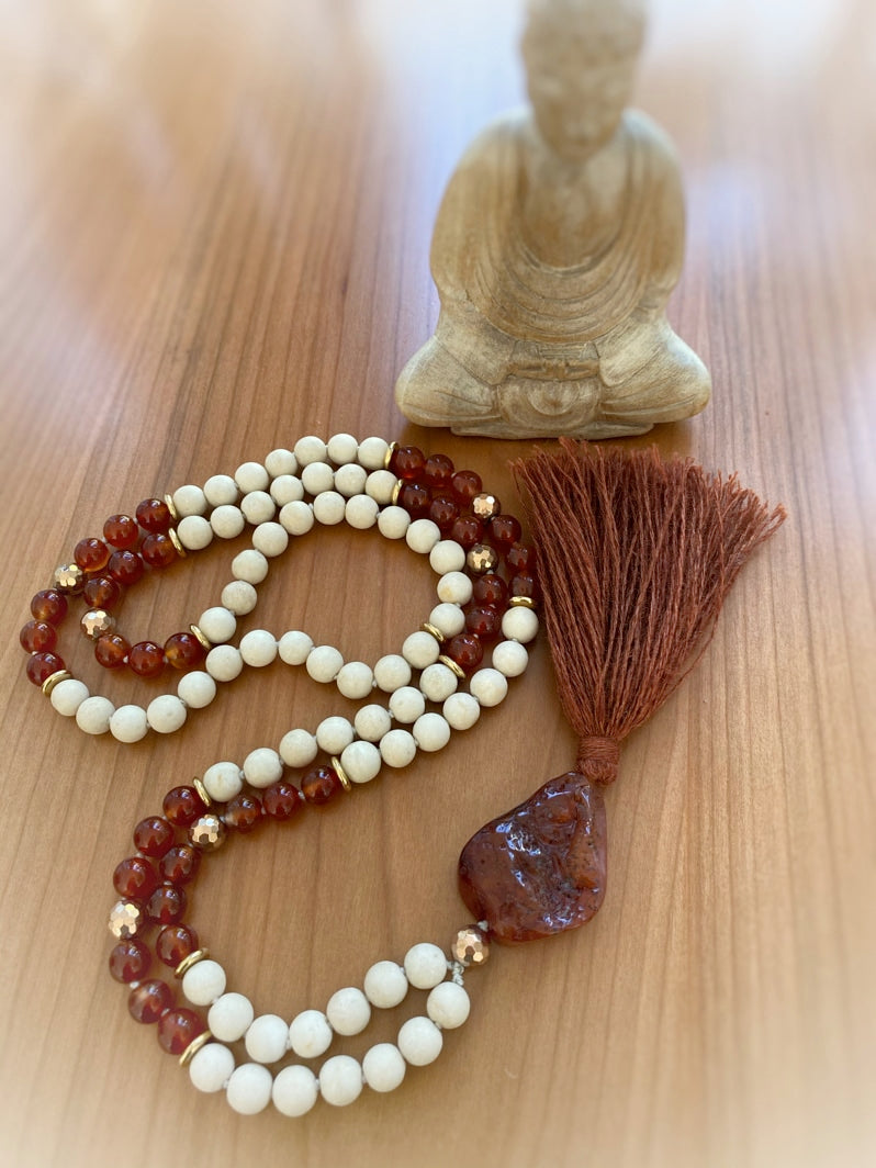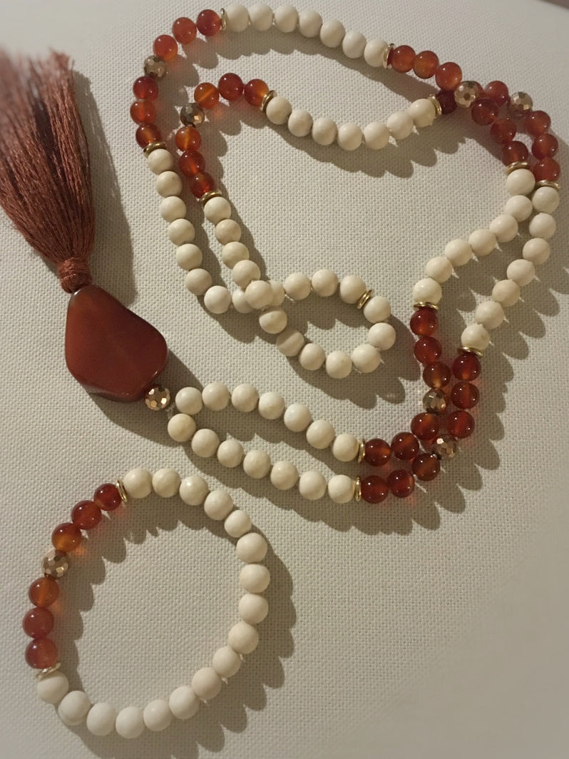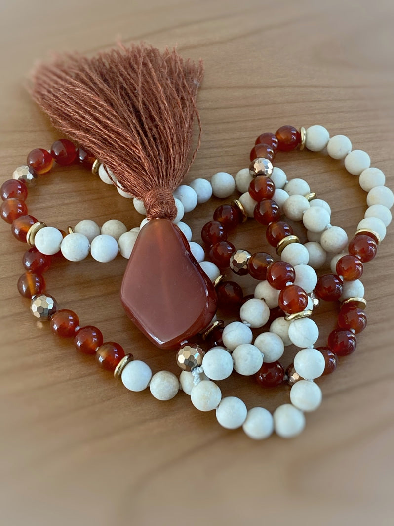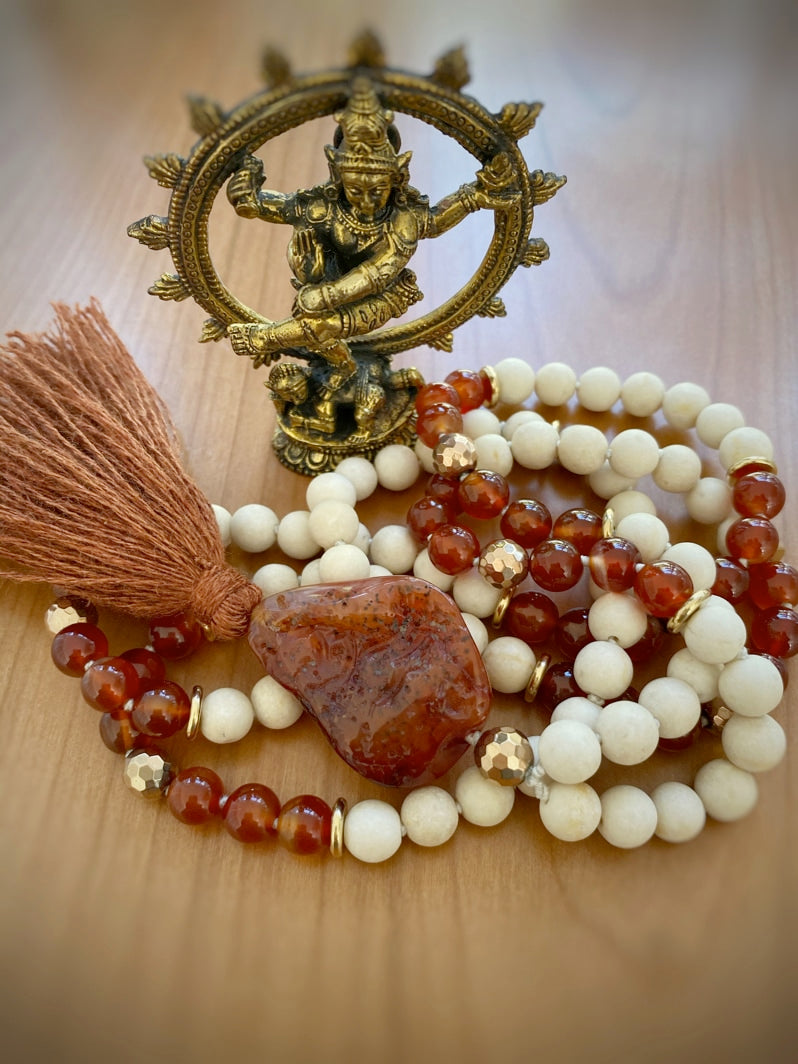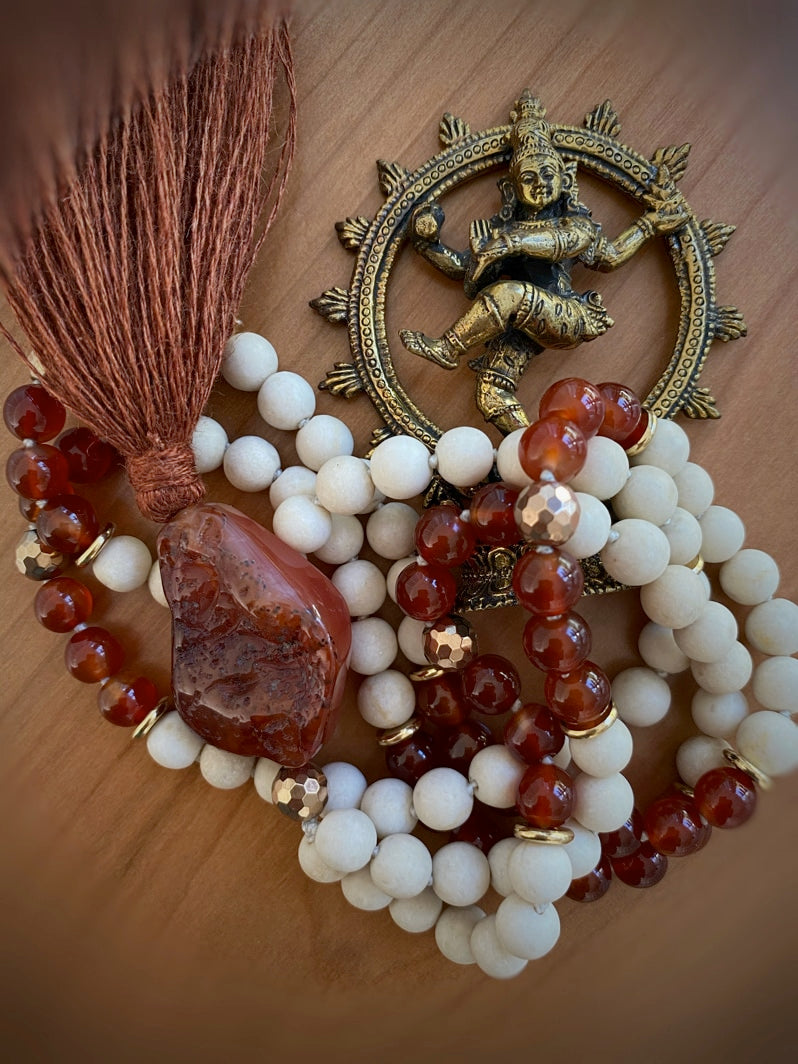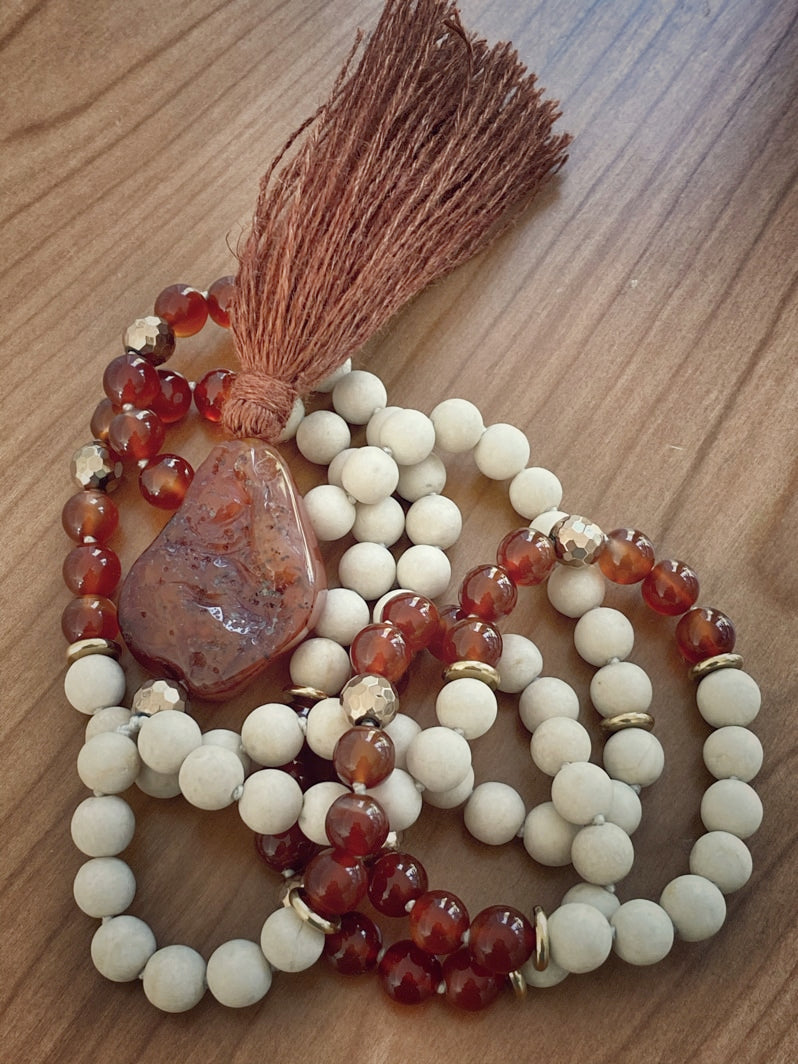 Guru-Bead: Karneol Rohstein und Leinen-Seide-Quaste