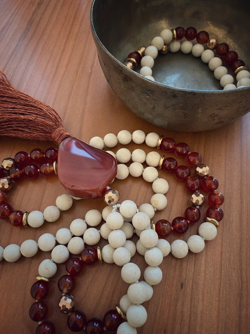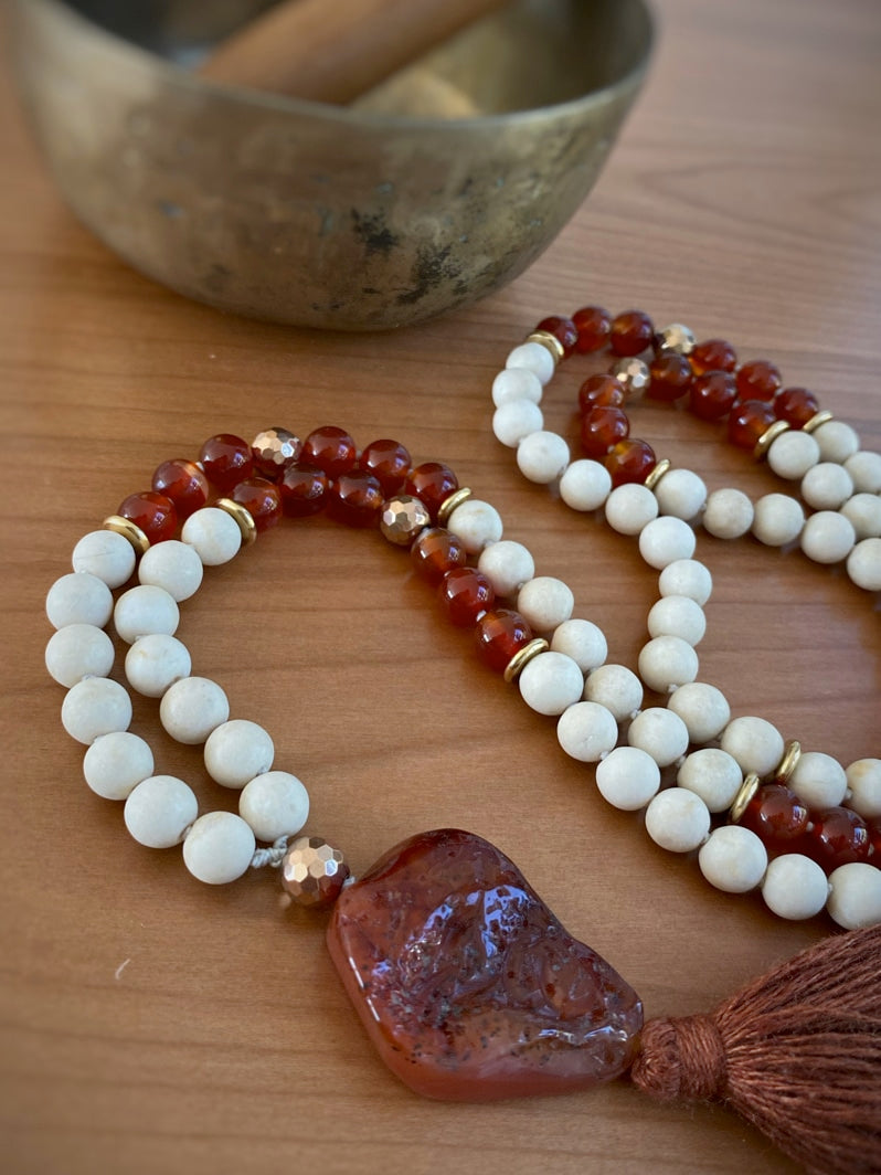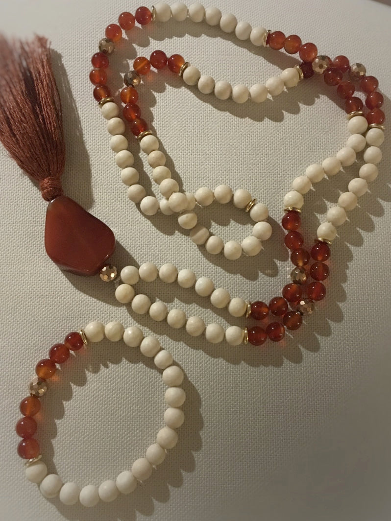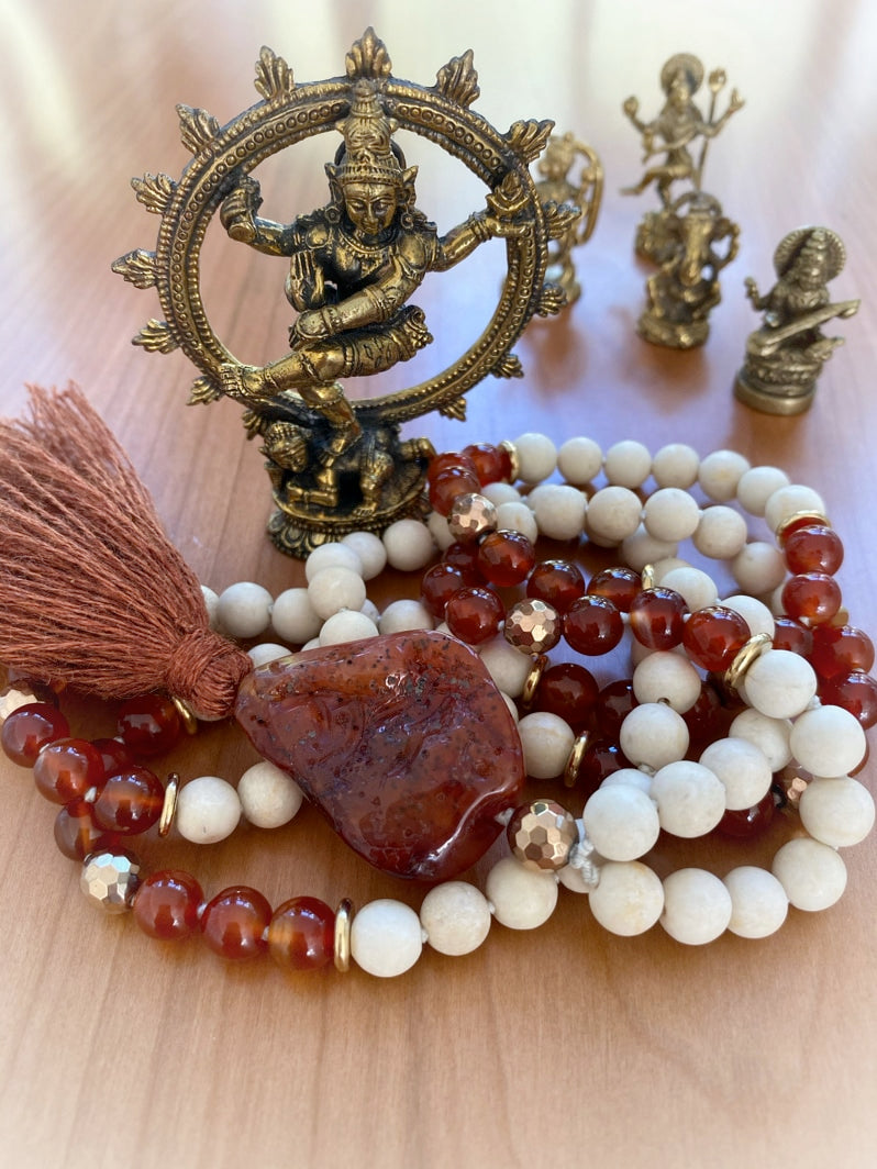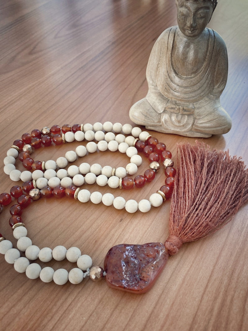 Guru-Bead: Karneol Rohstein und Leinen-Seide-Quaste