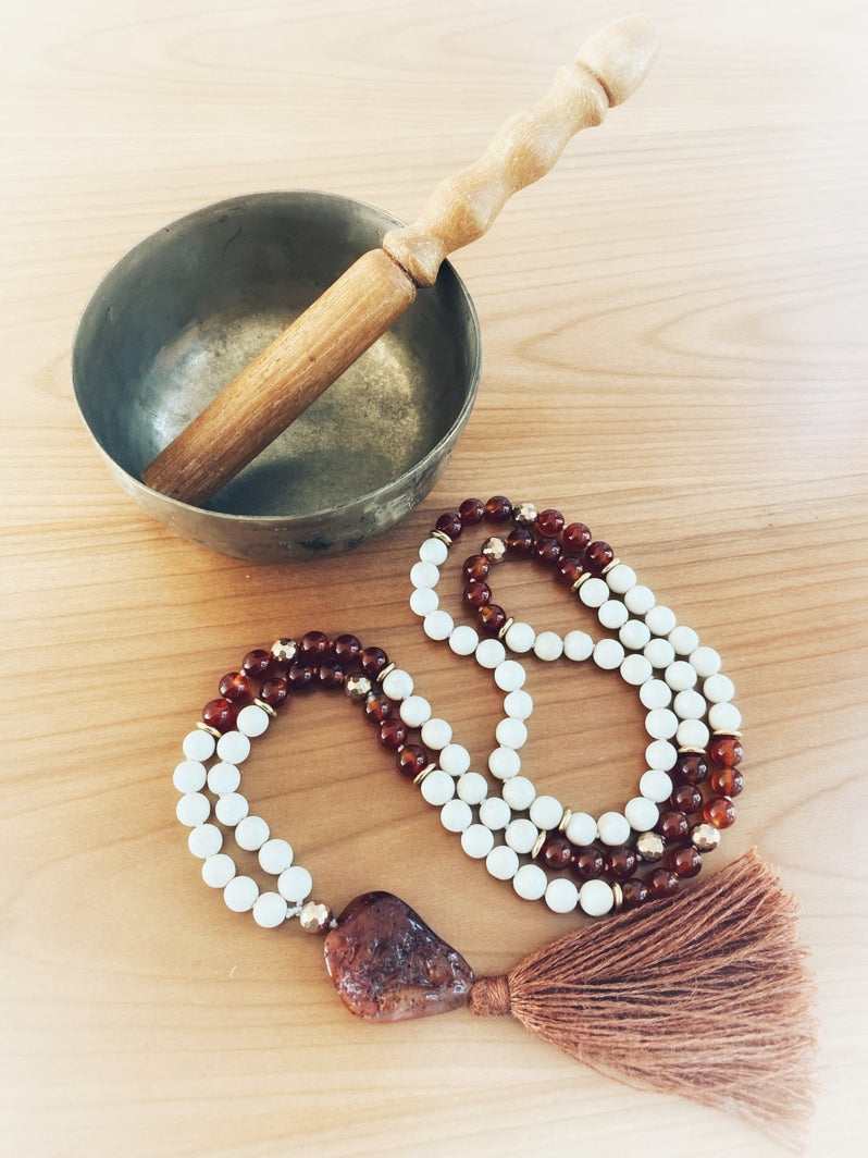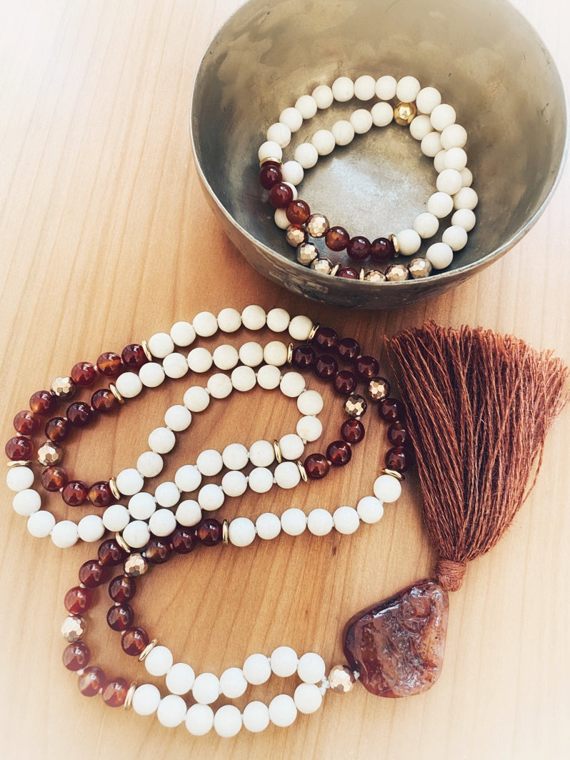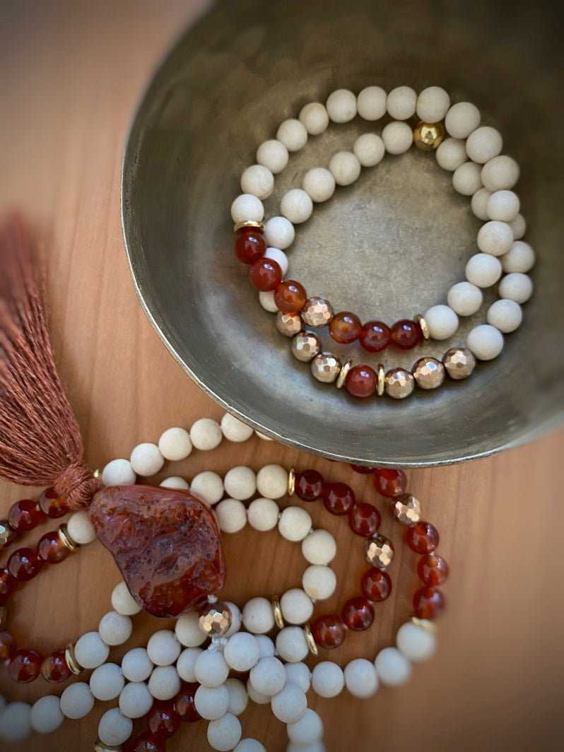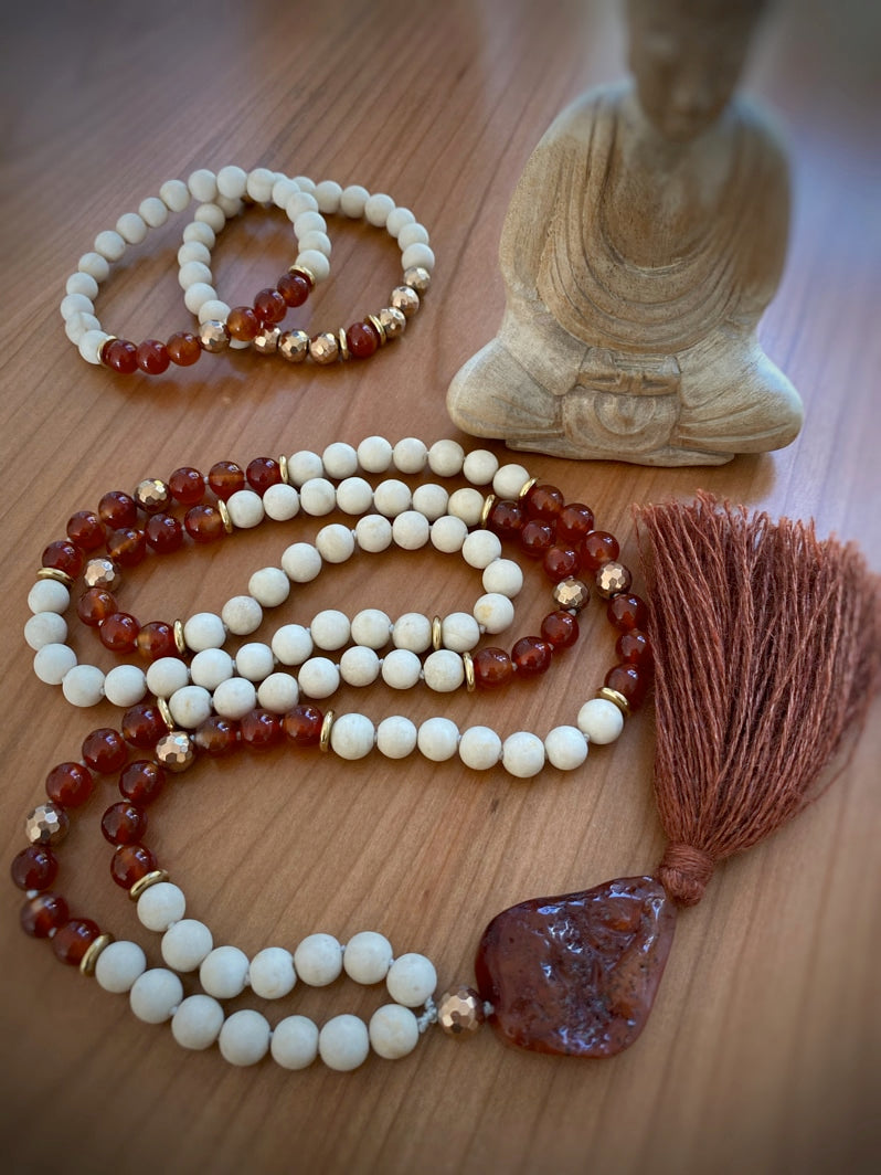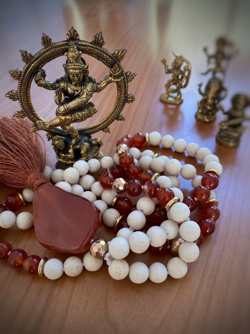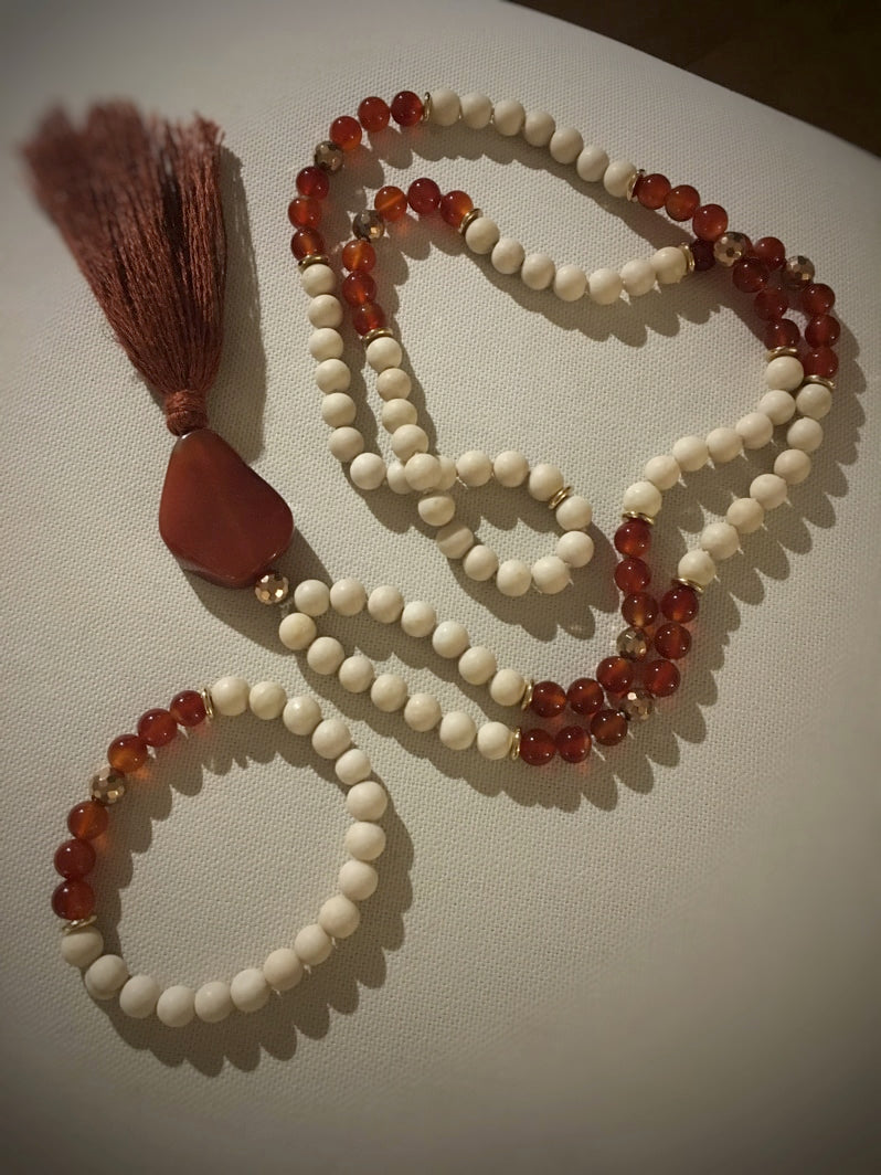 Guru-Bead: Karneol Rohstein und Leinen-Seide-Quaste