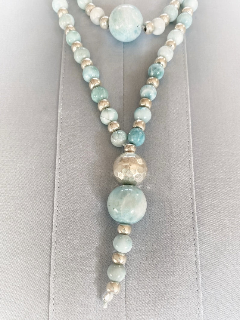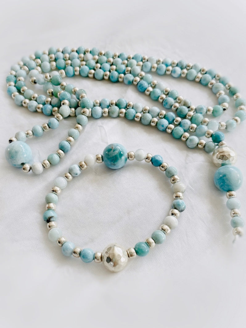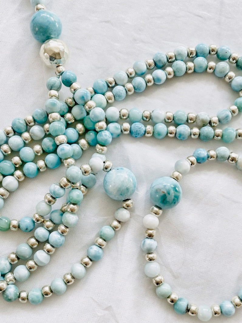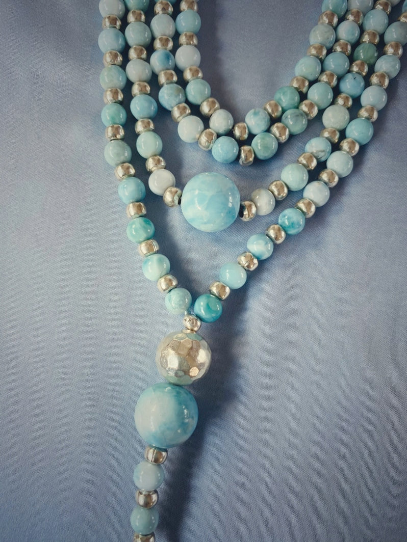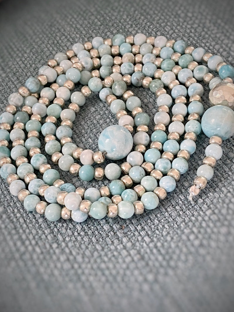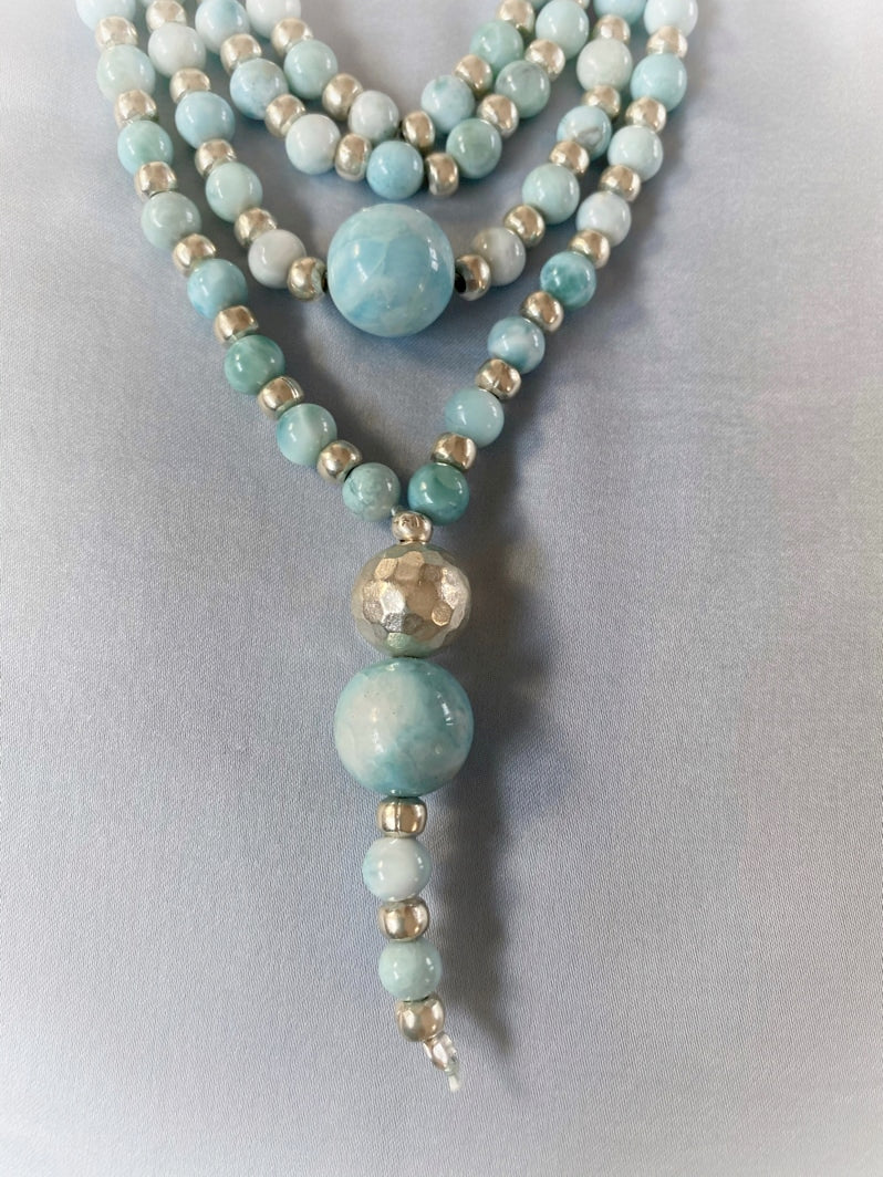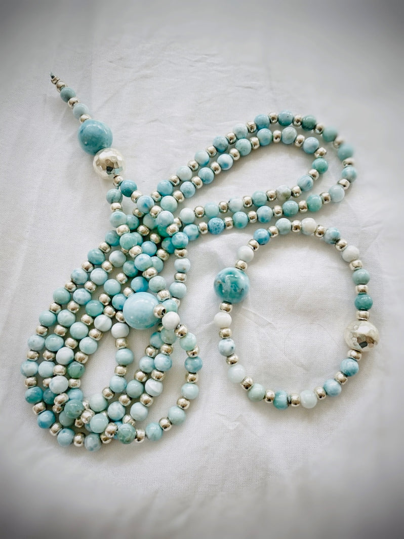Kostbar und edel - Wandelbare Mala aus Larimar und thailändischem Silber