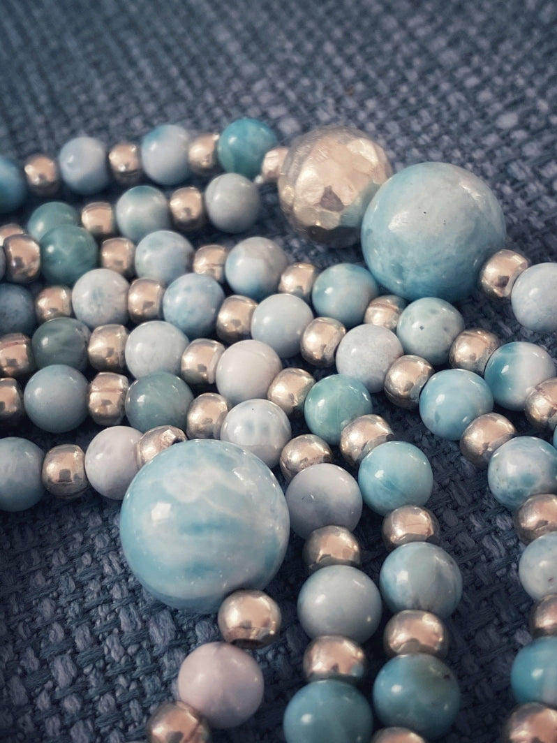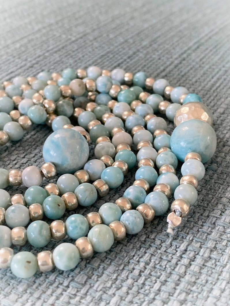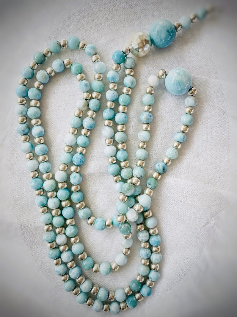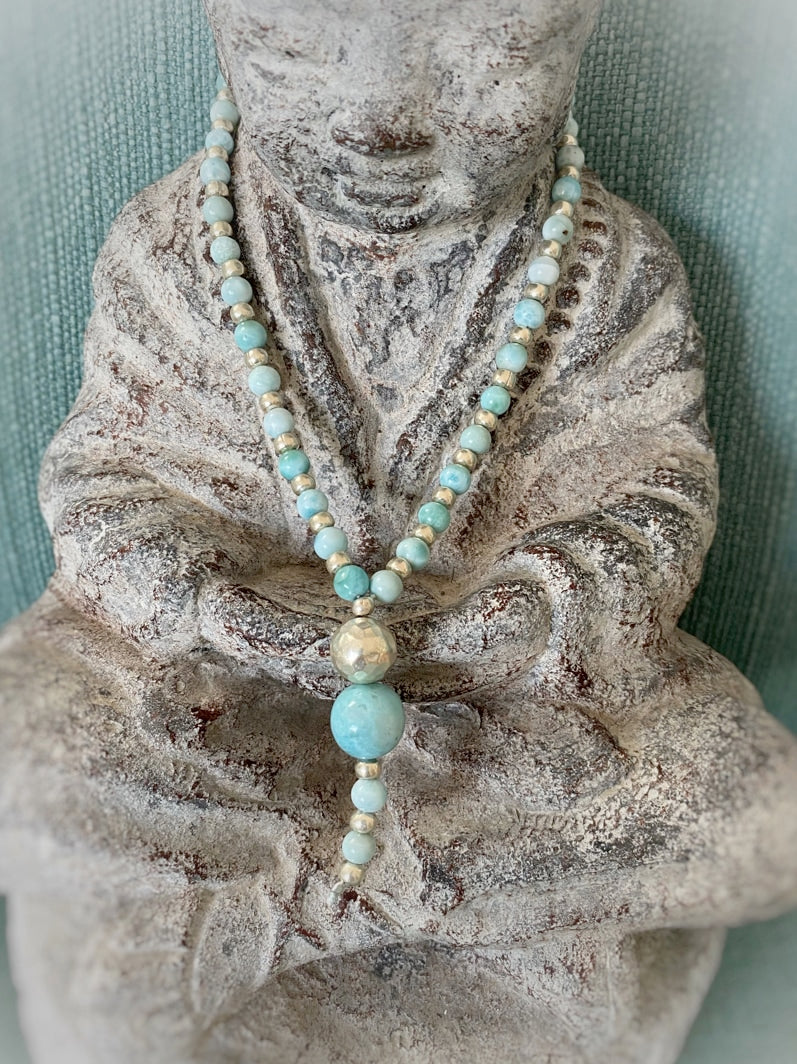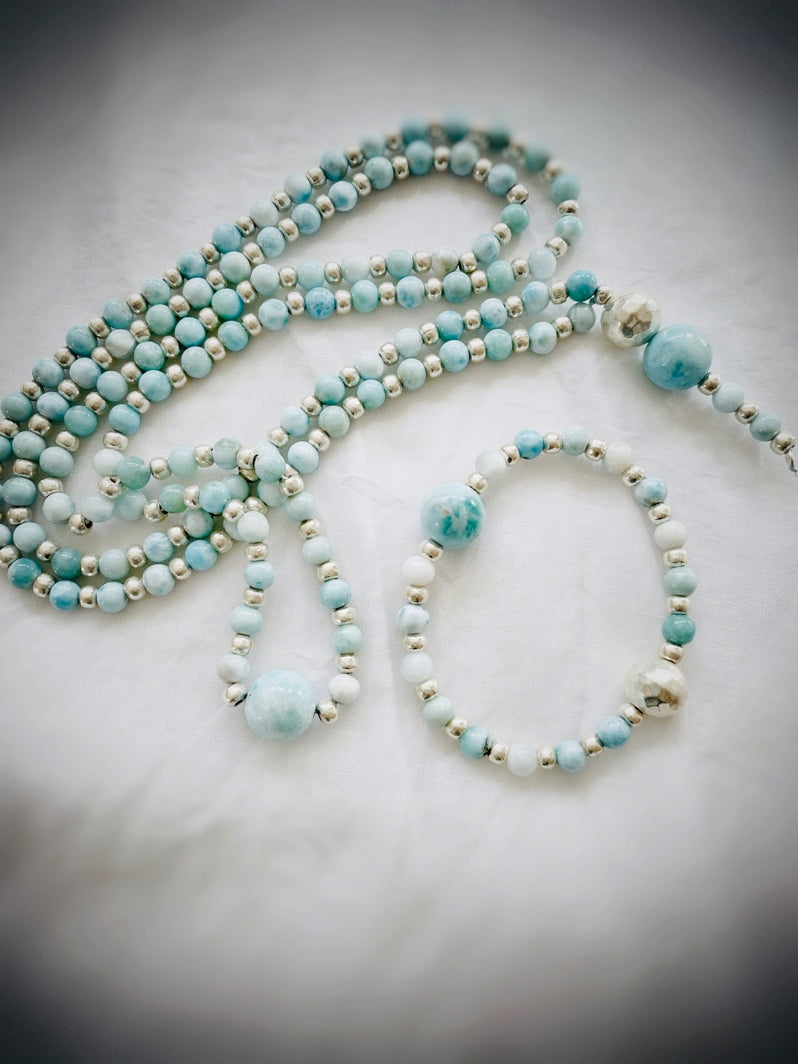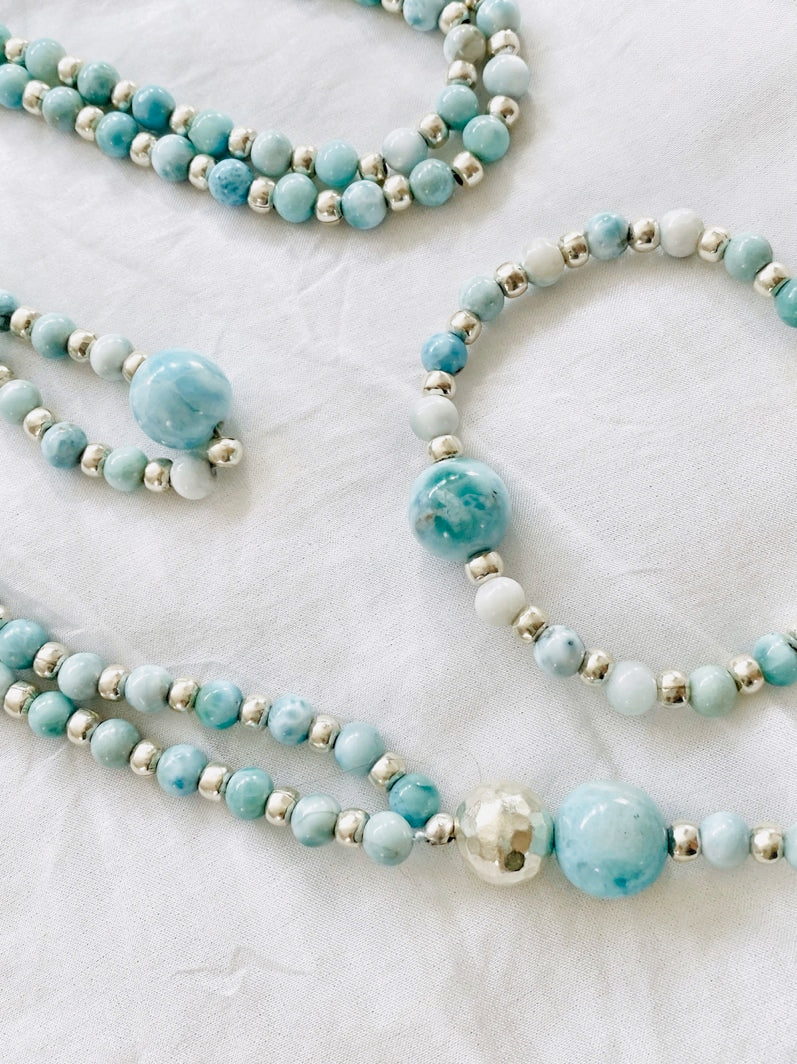 Kostbar und edel - Wandelbare Mala aus Larimar und thailändischem Silber