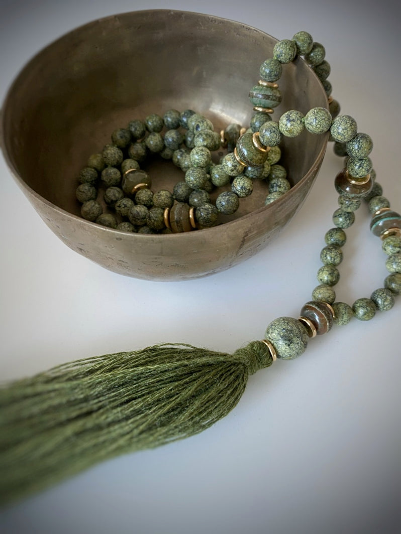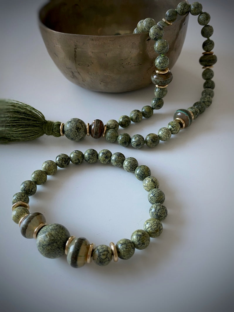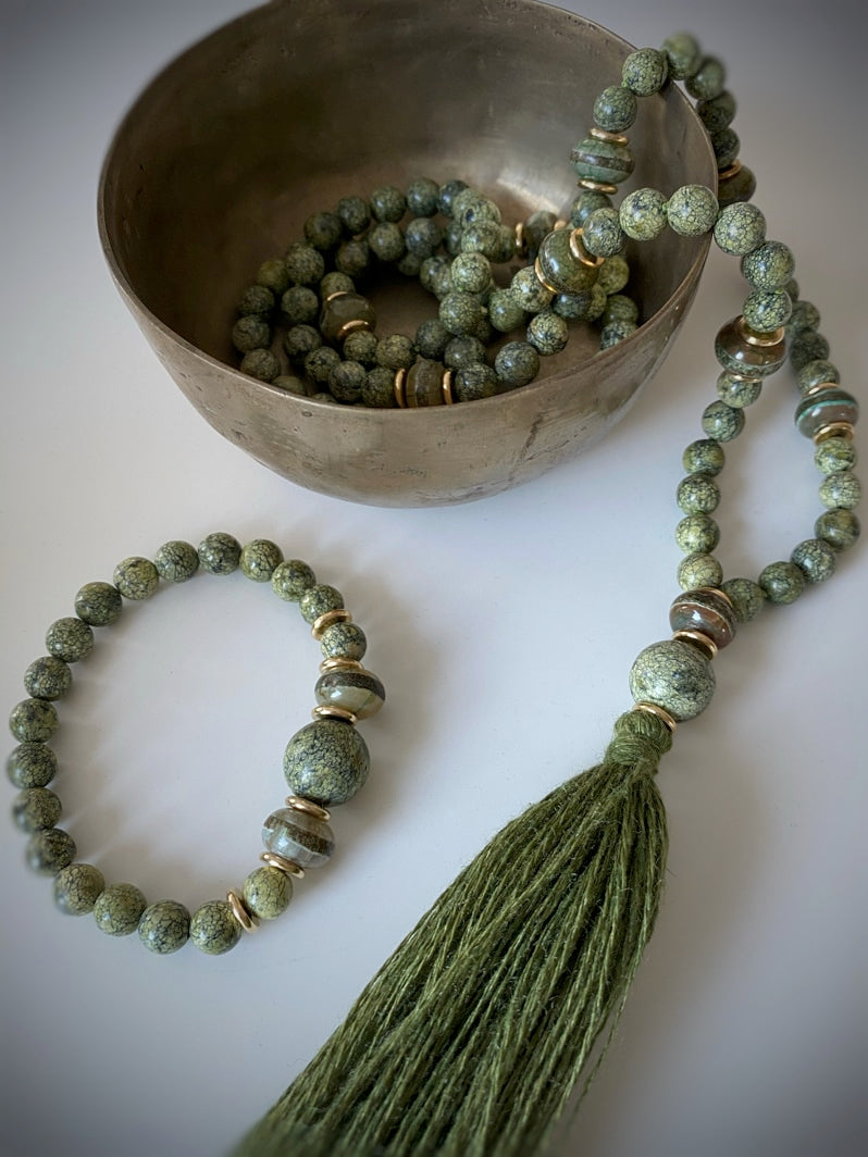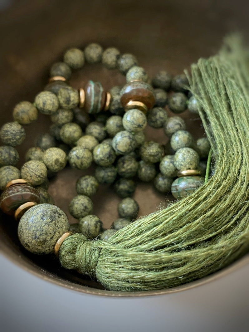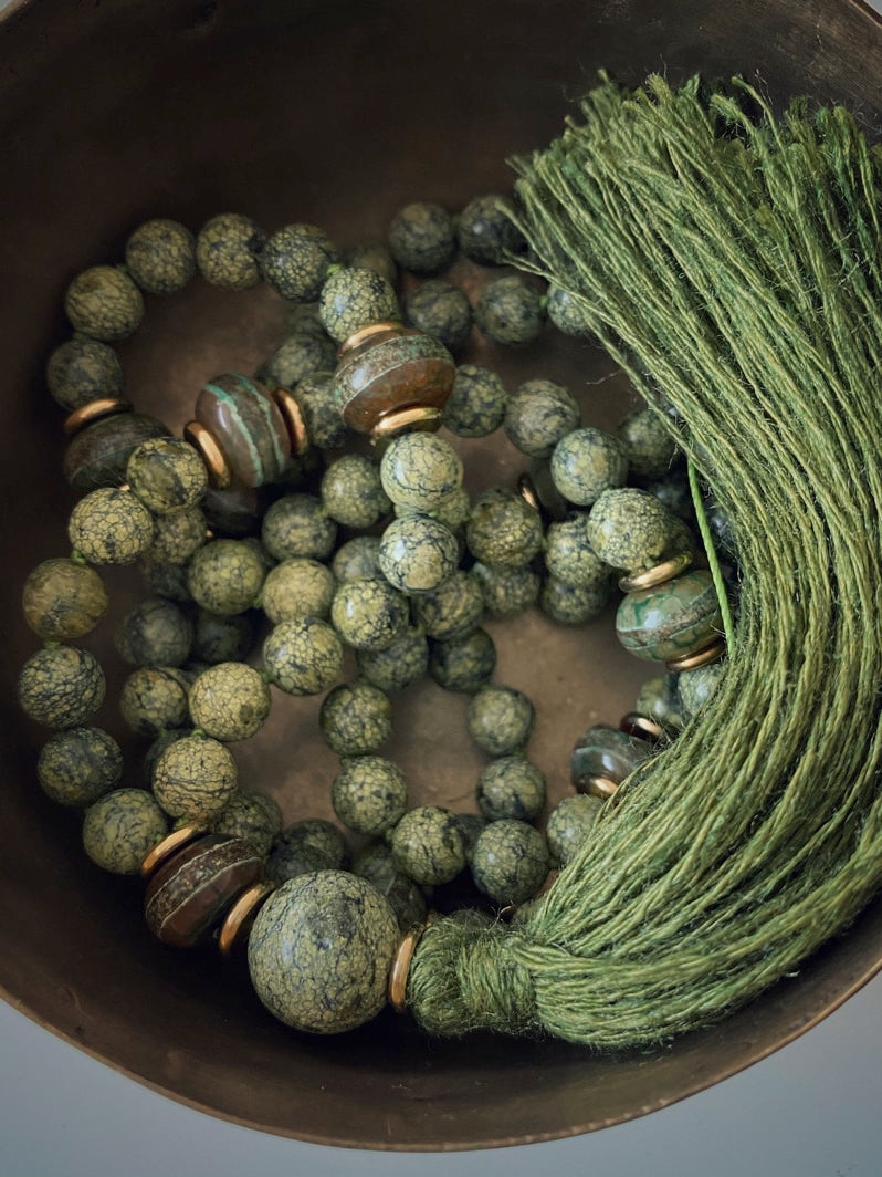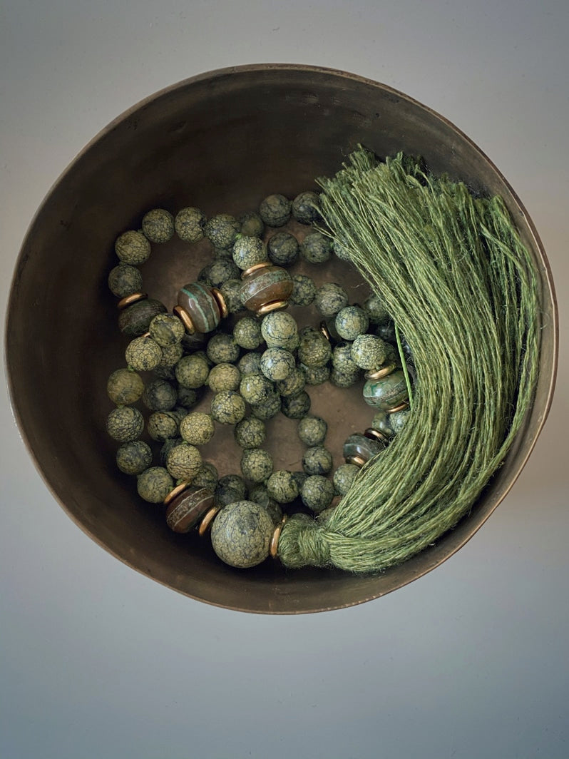 Abschluss: Achat-Rondell, Serpentin-Kugel und Seiden-Leinen-Quaste
