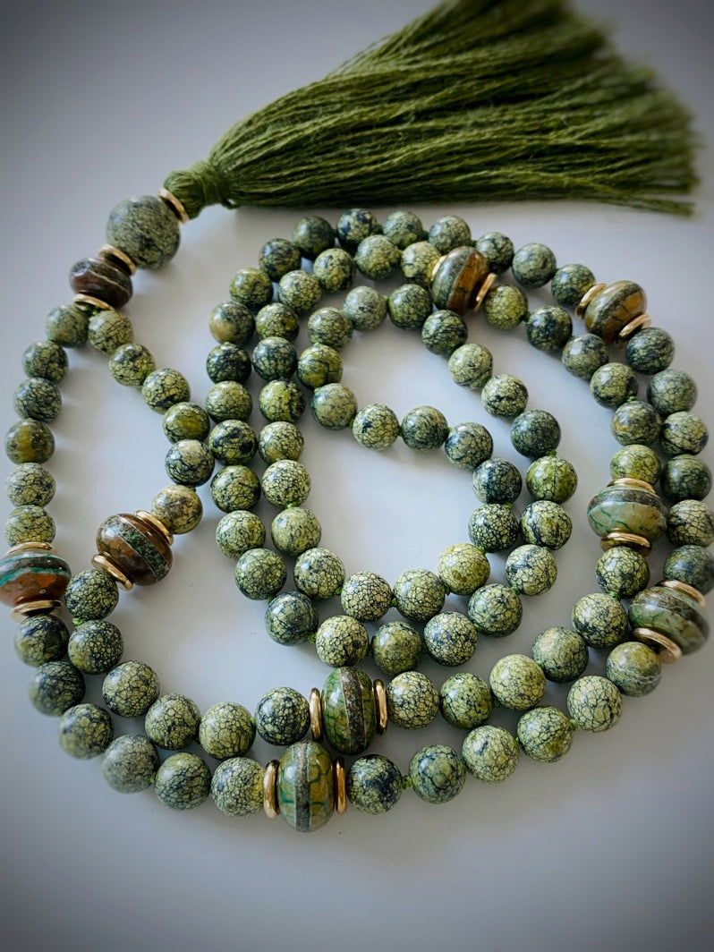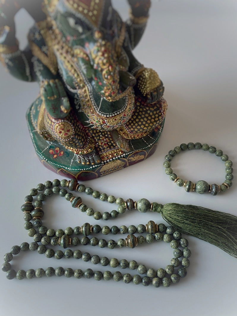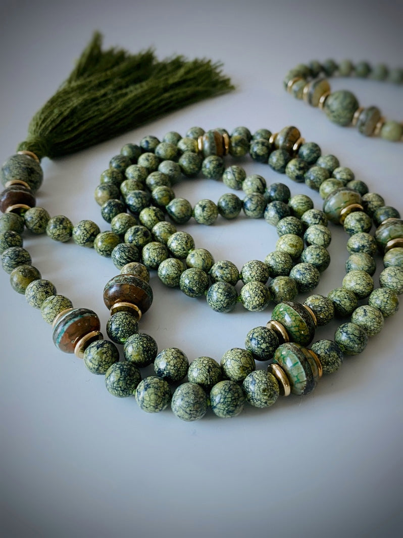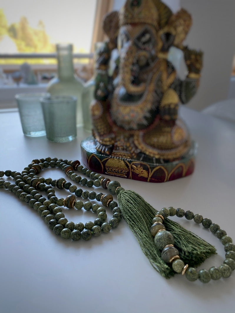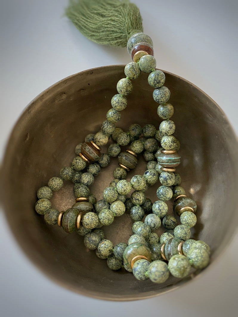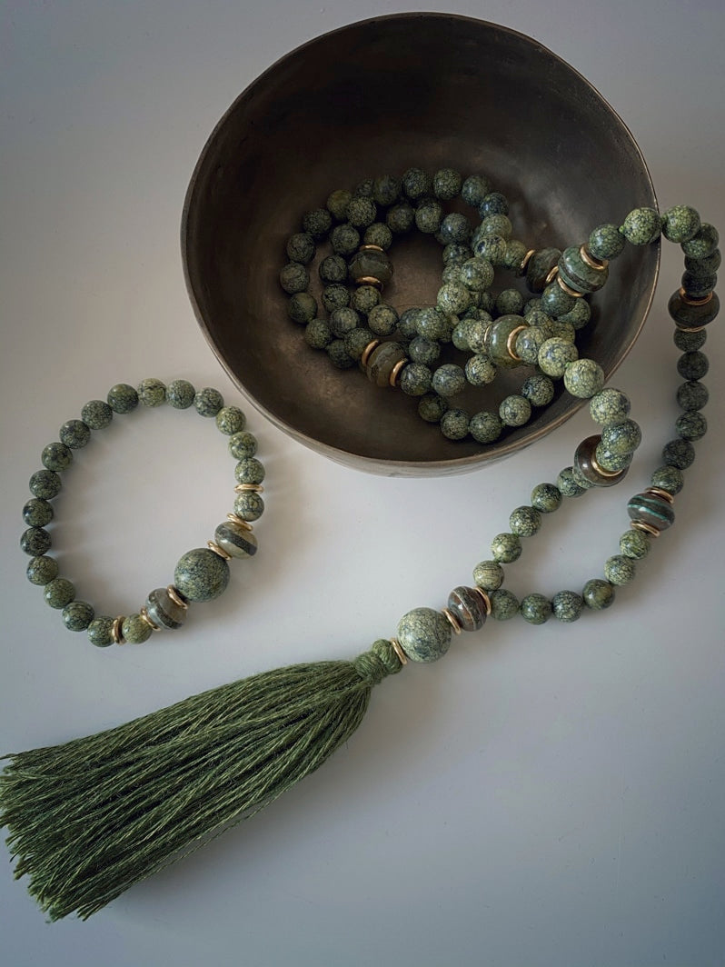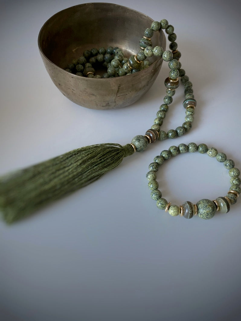 Abschluss: Achat-Rondell, Serpentin-Kugel und Seiden-Leinen-Quaste