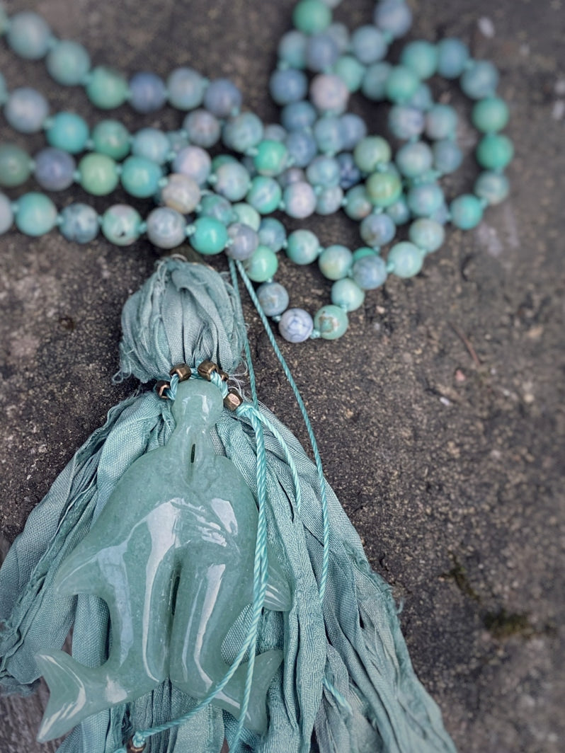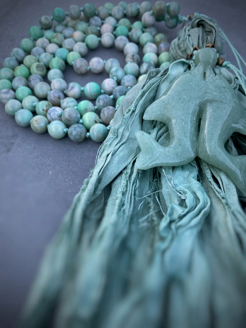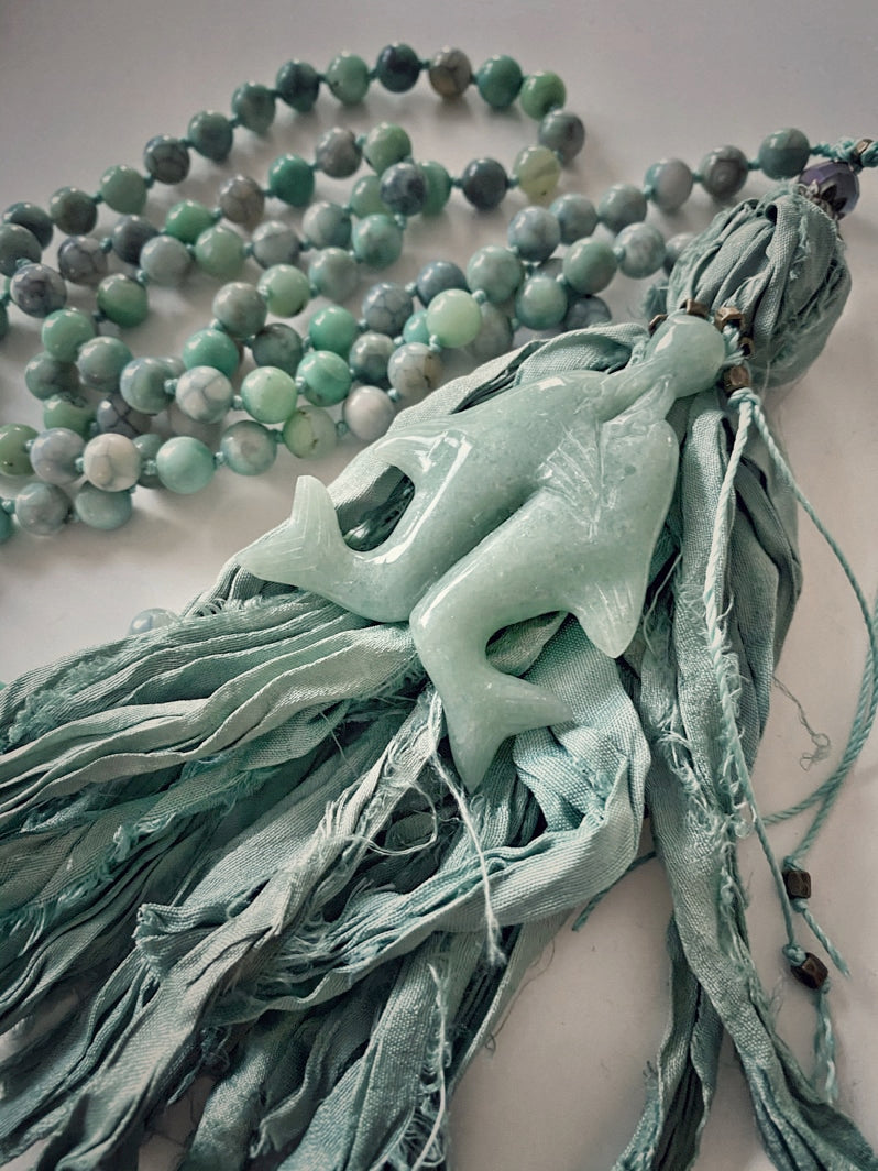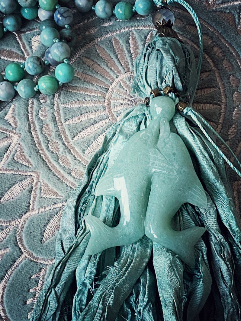 Abschluss: Seidenbandquaste in Aquafarbtönen und tanzendes Delfin-Paar aus hellgrünem Serpentin