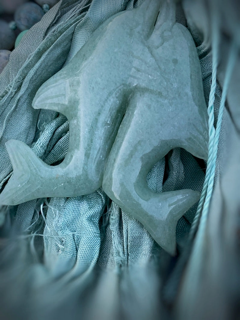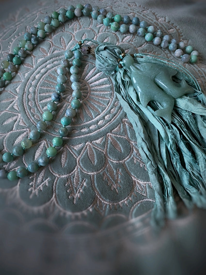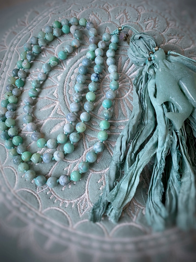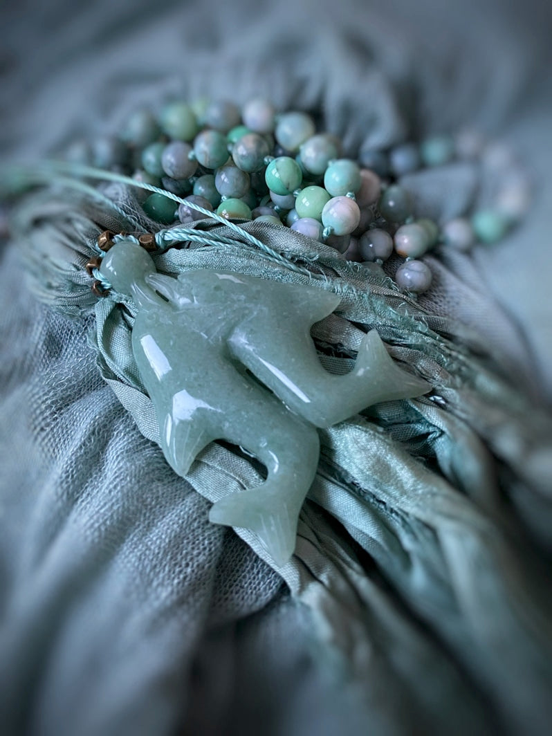 Abschluss: Seidenbandquaste in Aquafarbtönen und tanzendes Delfin-Paar aus hellgrünem Serpentin