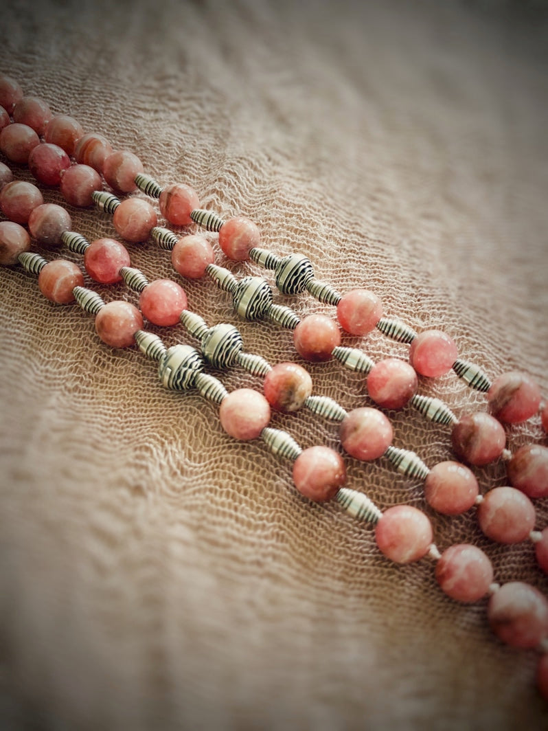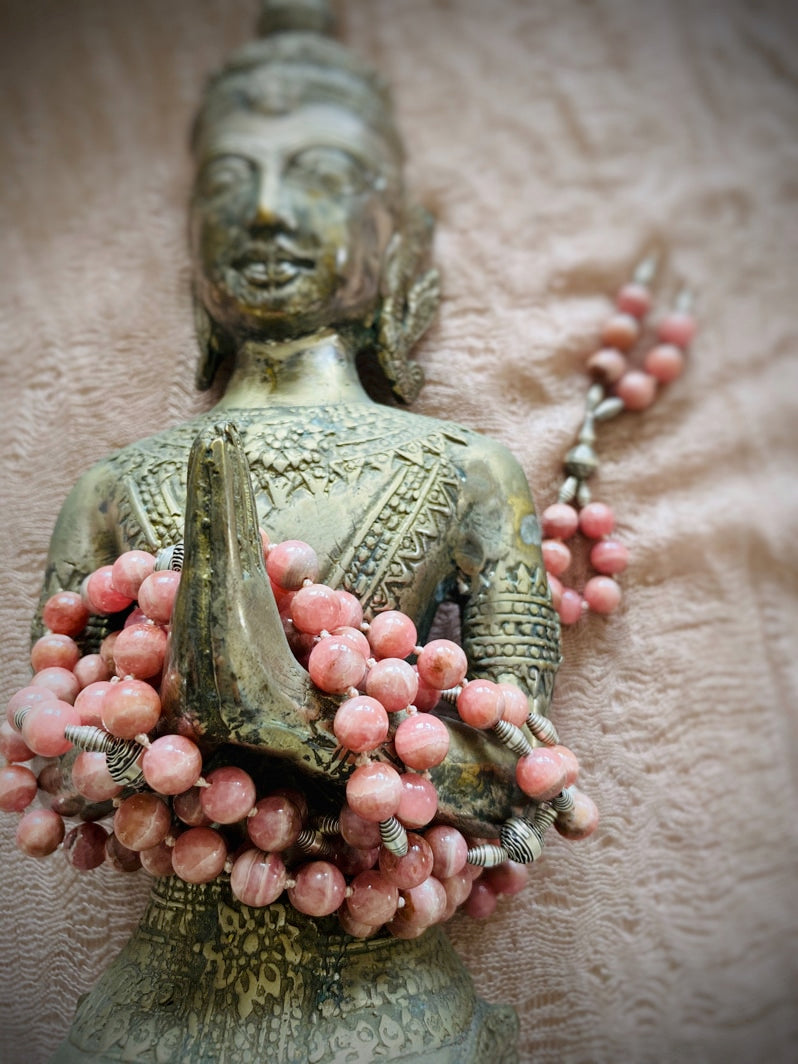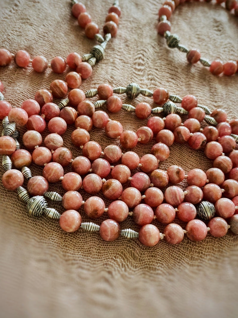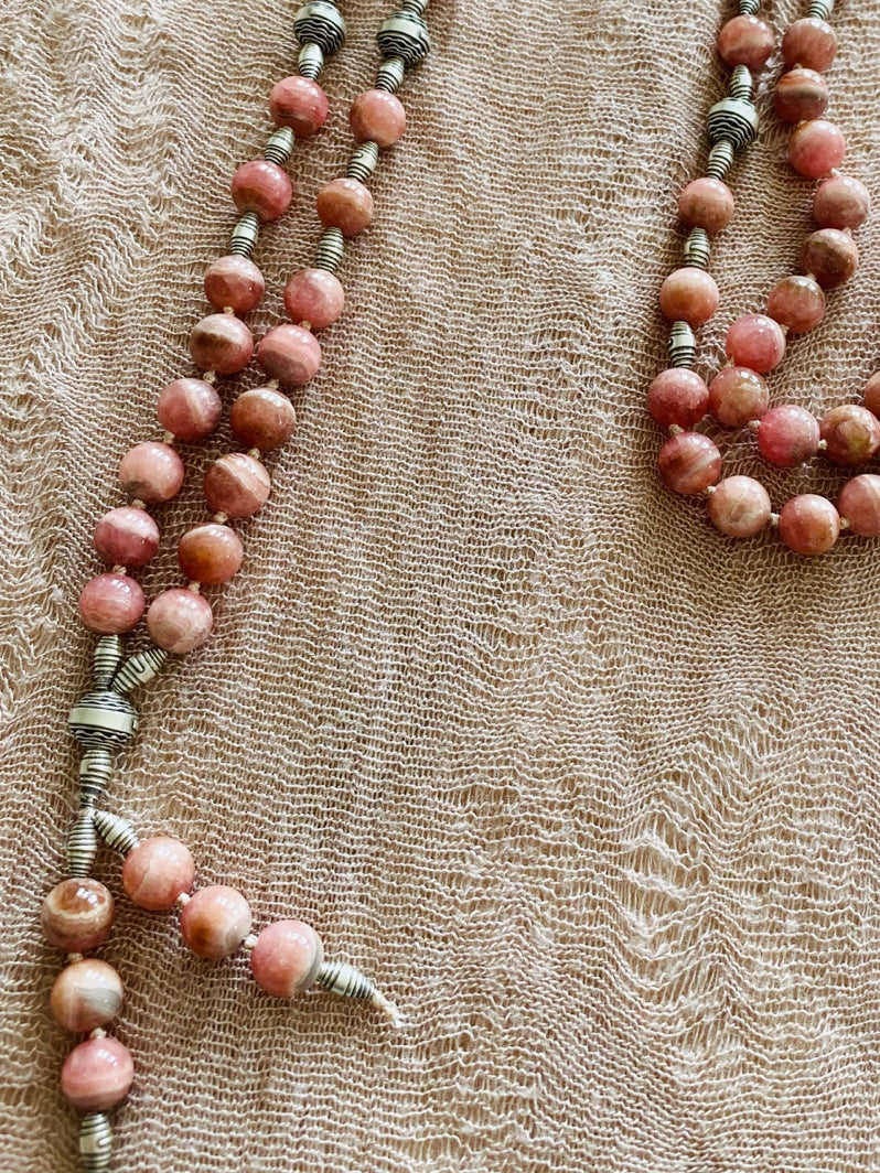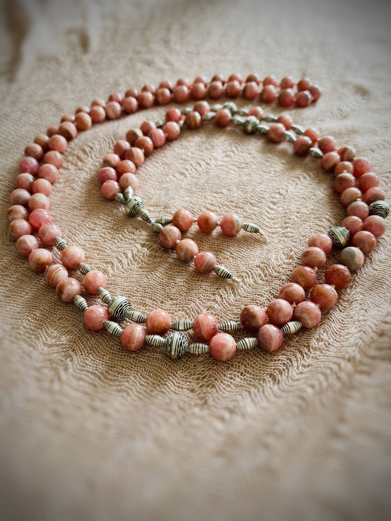 Traumhaft schöne, in dieser Qualität sehr selten zu findende, Perlen aus Rhodochrosit kombiniert mit handgearbeiteten Echt-Silber-Perlen aus Thailand - auf Seide gefädelt und sorgfältig handgeknotet