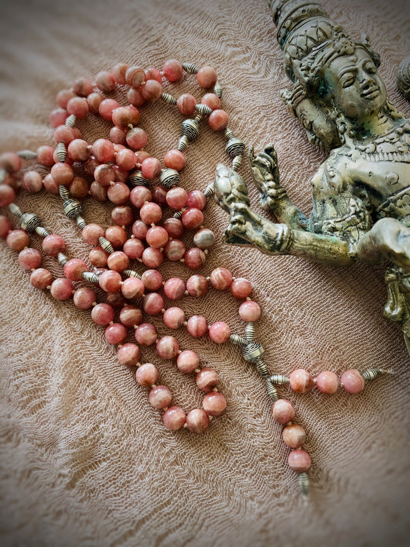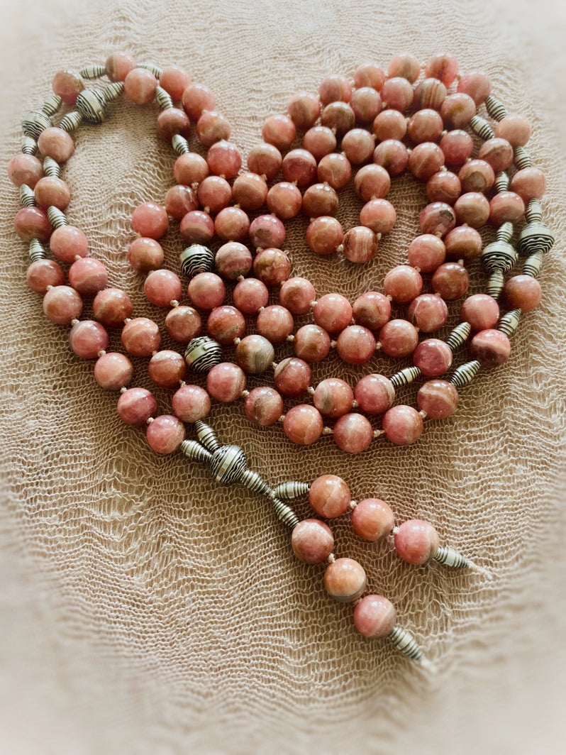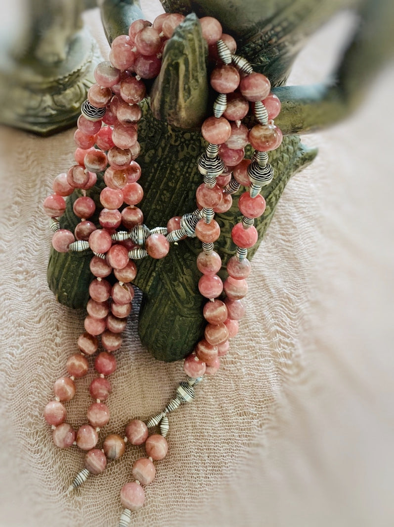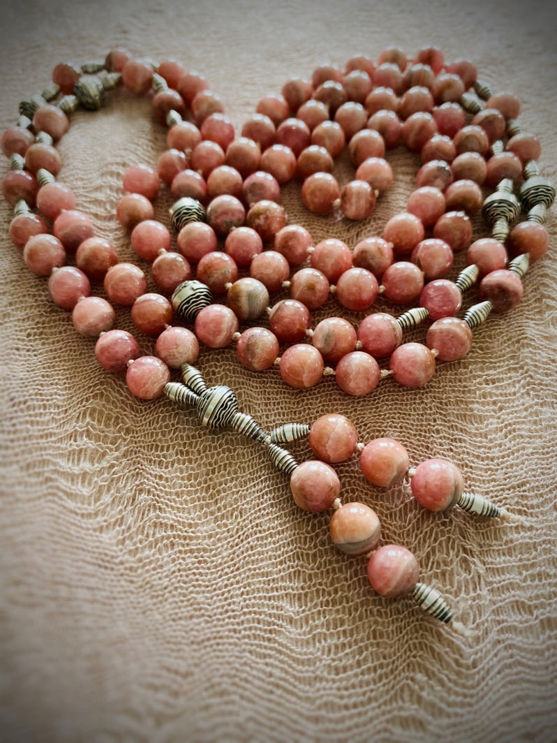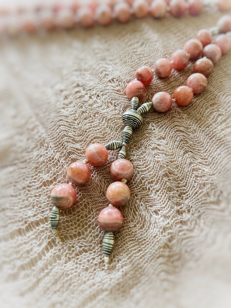Traumhaft schöne, in dieser Qualität sehr selten zu findende, Perlen aus Rhodochrosit kombiniert mit handgearbeiteten Echt-Silber-Perlen aus Thailand - auf Seide gefädelt und sorgfältig handgeknotet